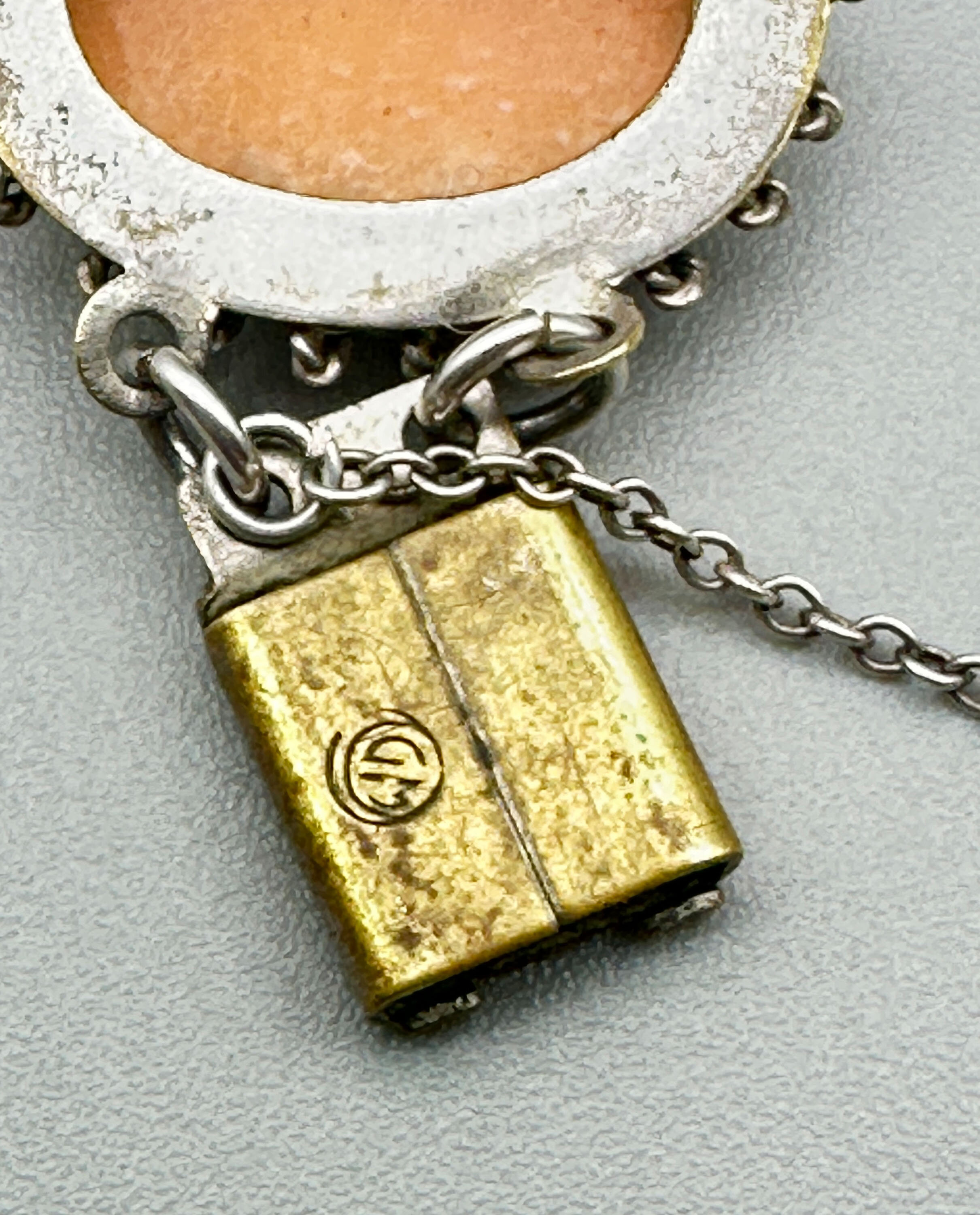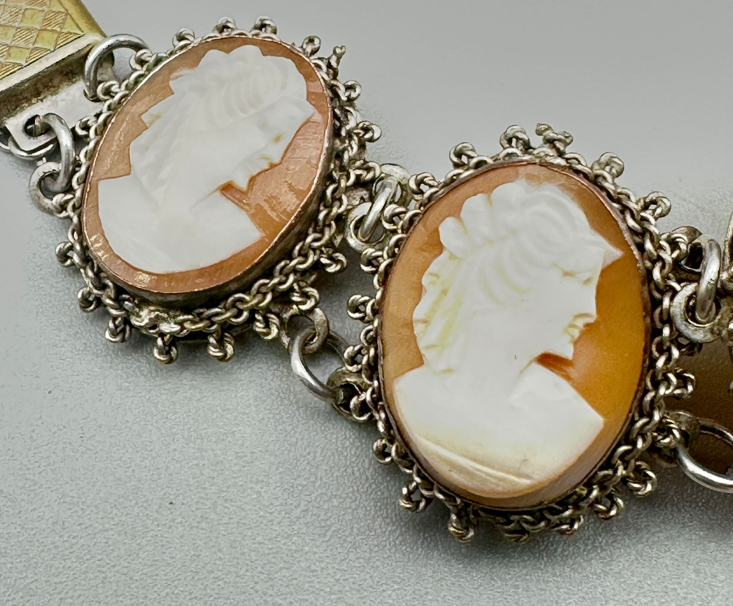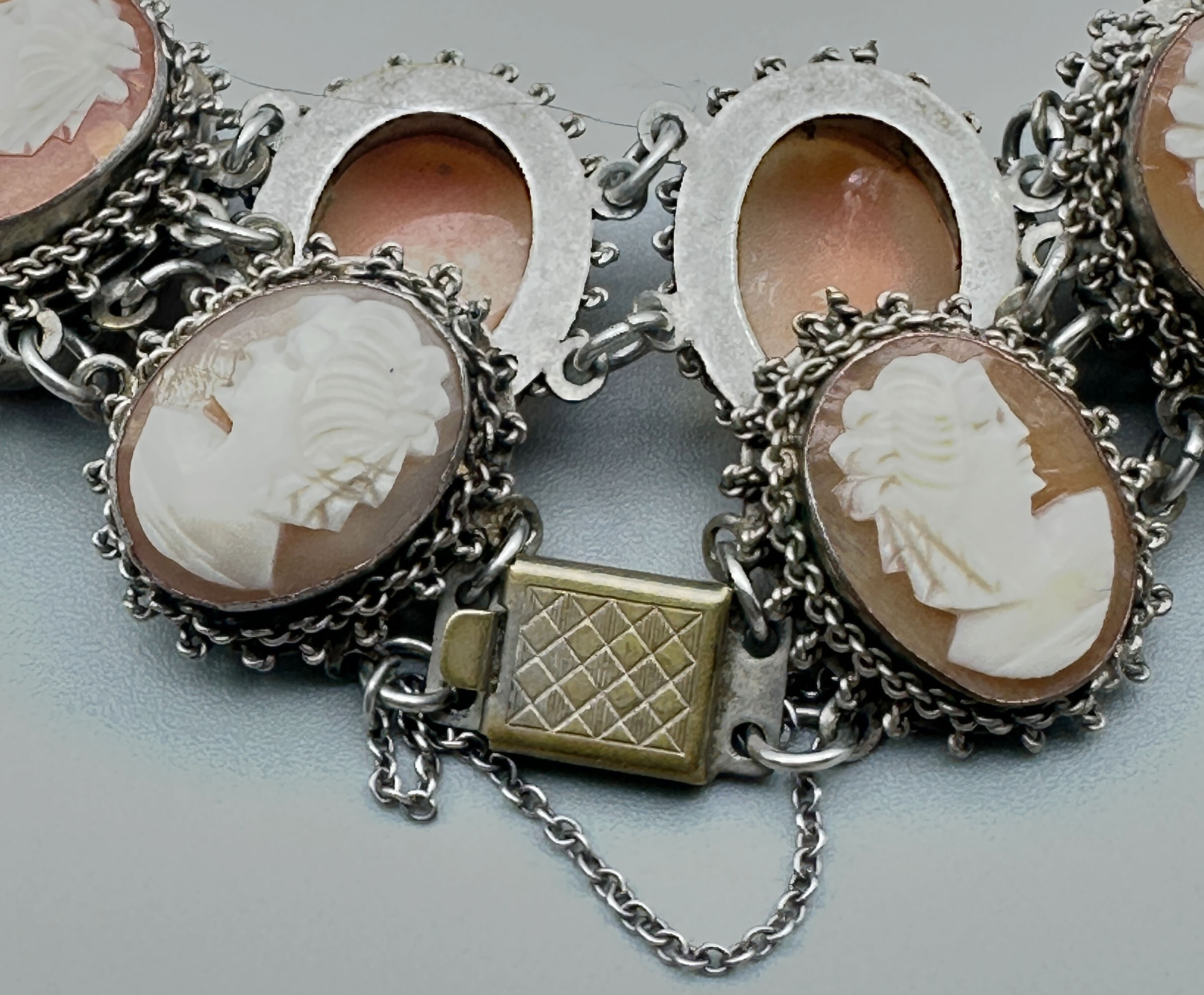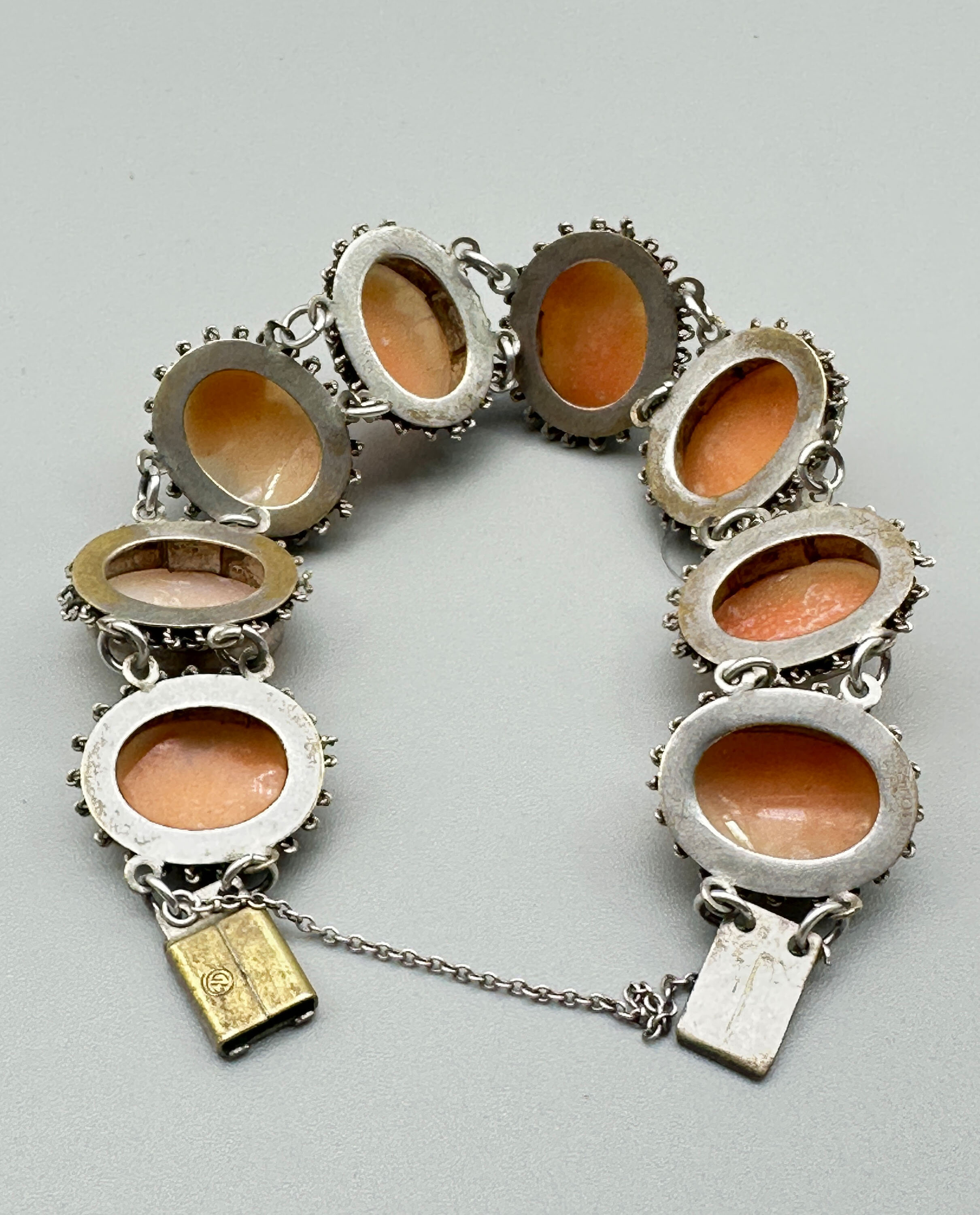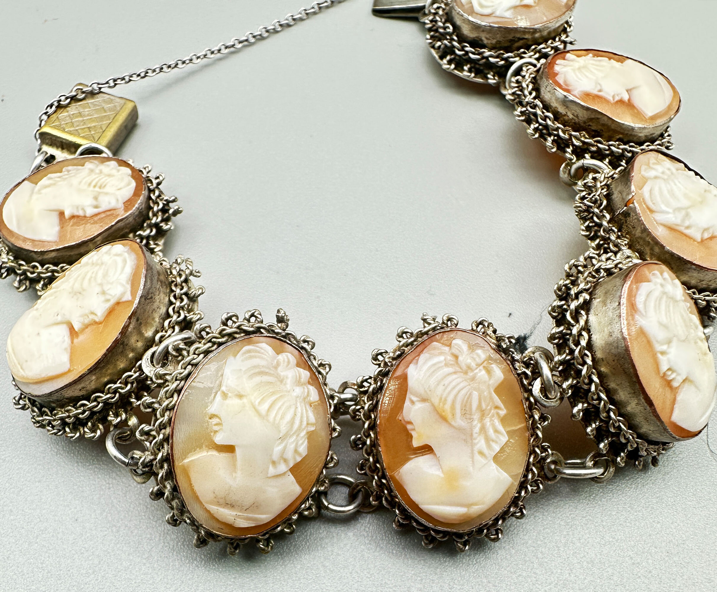 This is lovely bracelet that features stations set with eight cameo plaques. It is set in white metal that is in a filigree design with box clasp and safety chain. The clasp looks to be a replacement.| Size: | Plaques are 22 x 18mm, Bracelet length is 18 cm |