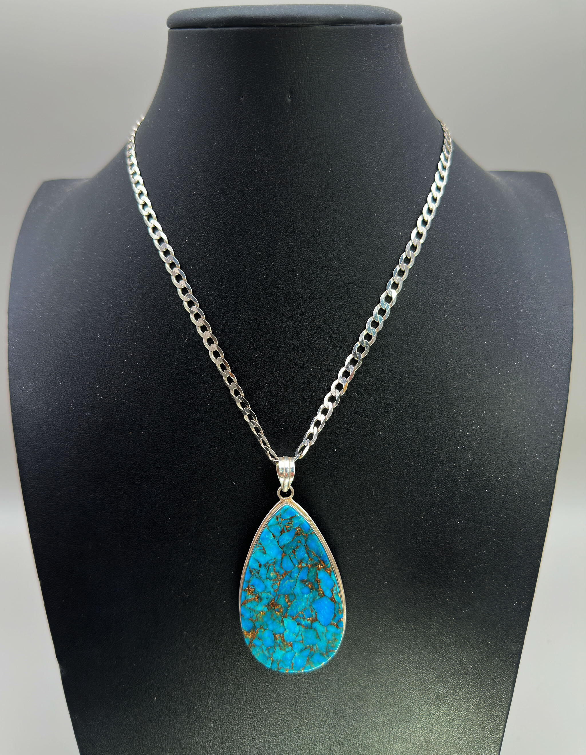 This is a large pear shaped pendant set with a turquoise stone. The stone is an excellent example of copper matrix turquoise form the Kingman mine in Ariizona. This type of turquoise has been treated and stabilized with copper instead of resin to create this dramatic effect. Kingman turquoise is known for this type. It is paired with a complementary flat belcher chain. Both are marked 925.| Size: | Pendant without bail is 57.7 x 35, Necklace is 42 cm long and 5 mm wide |