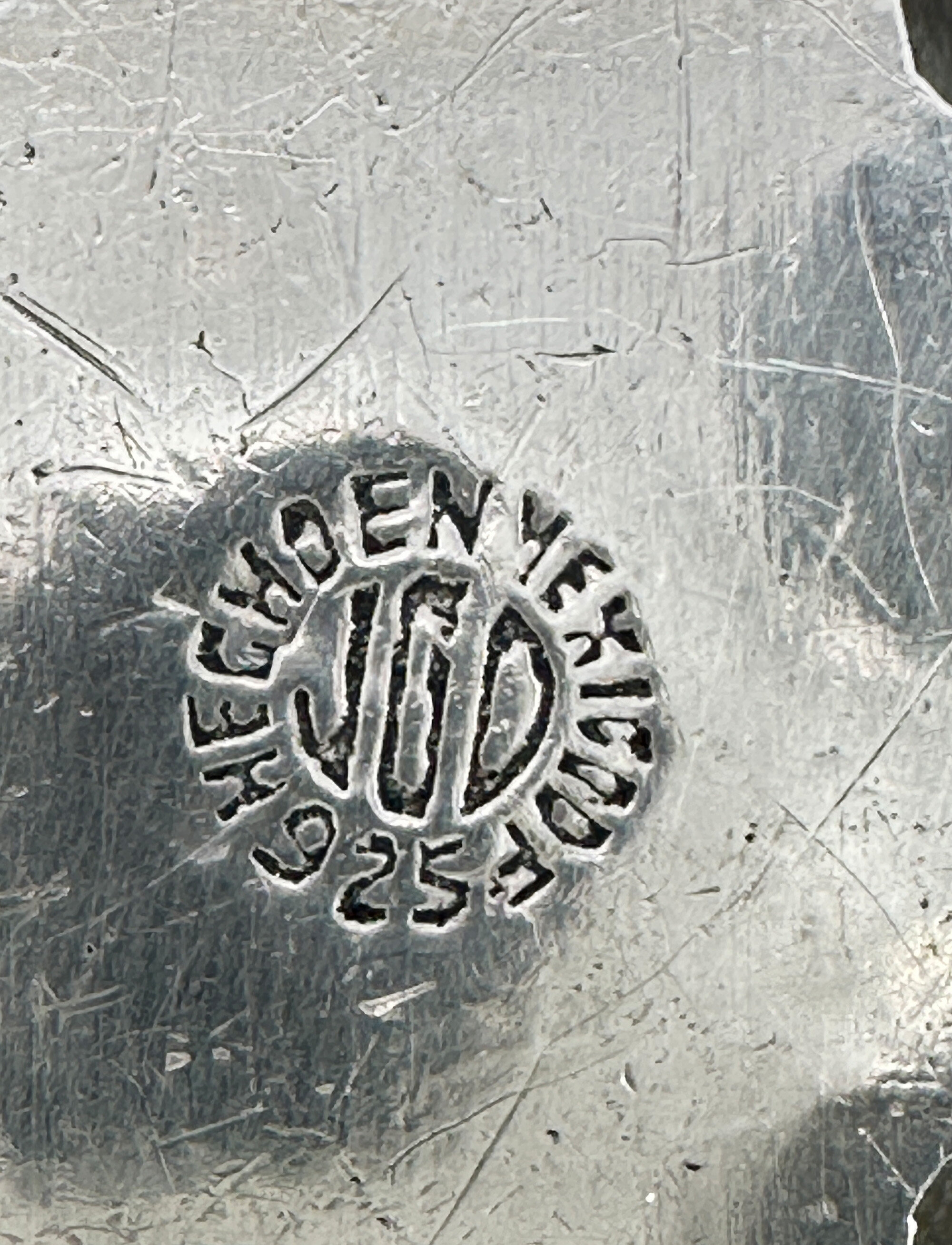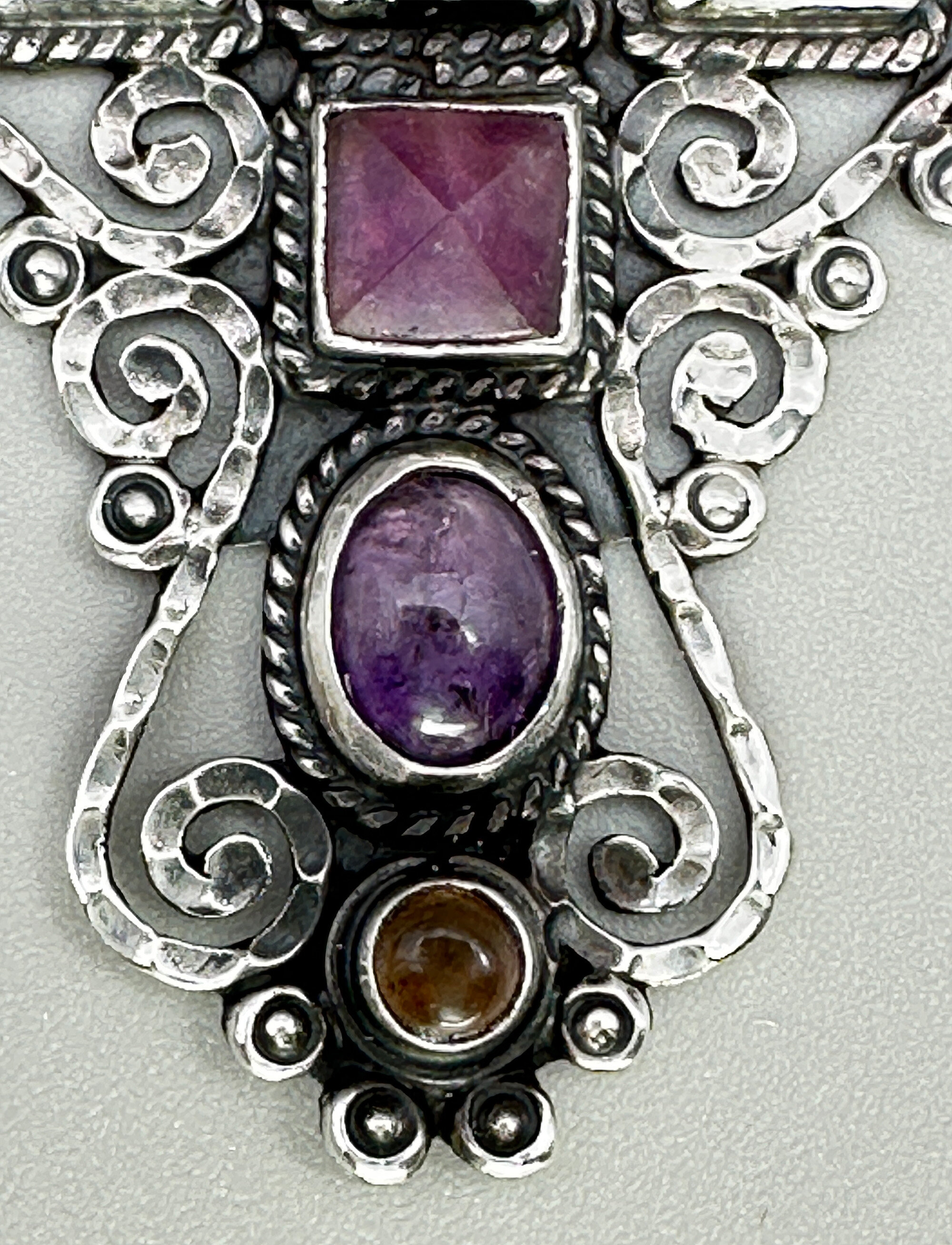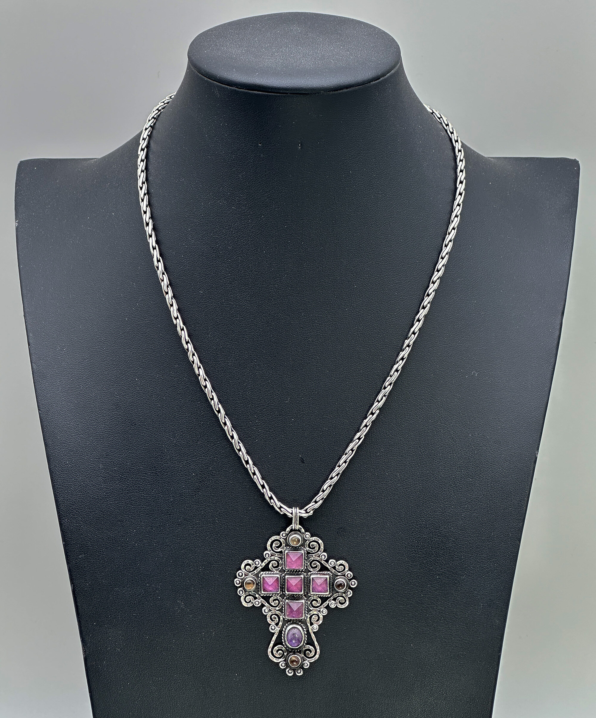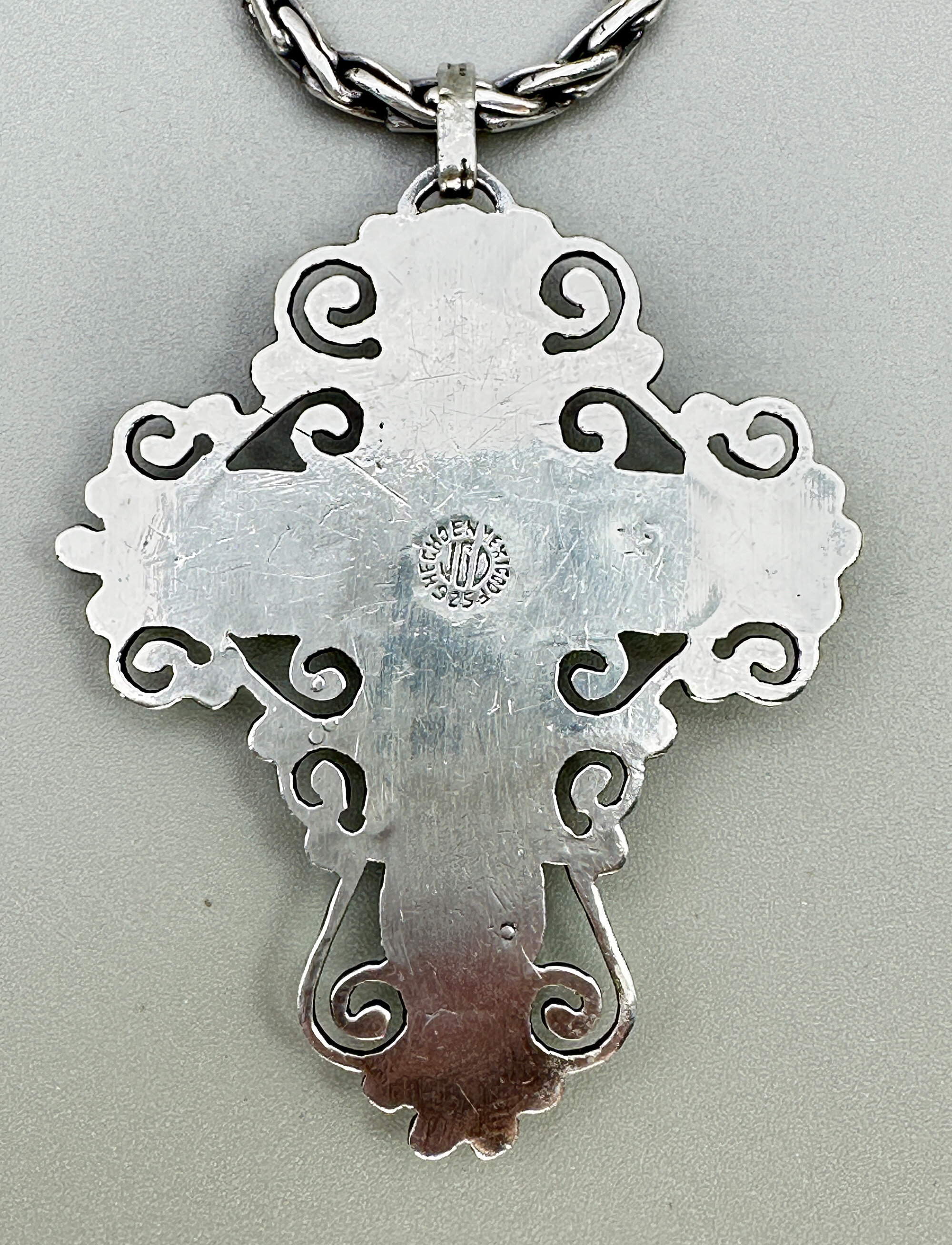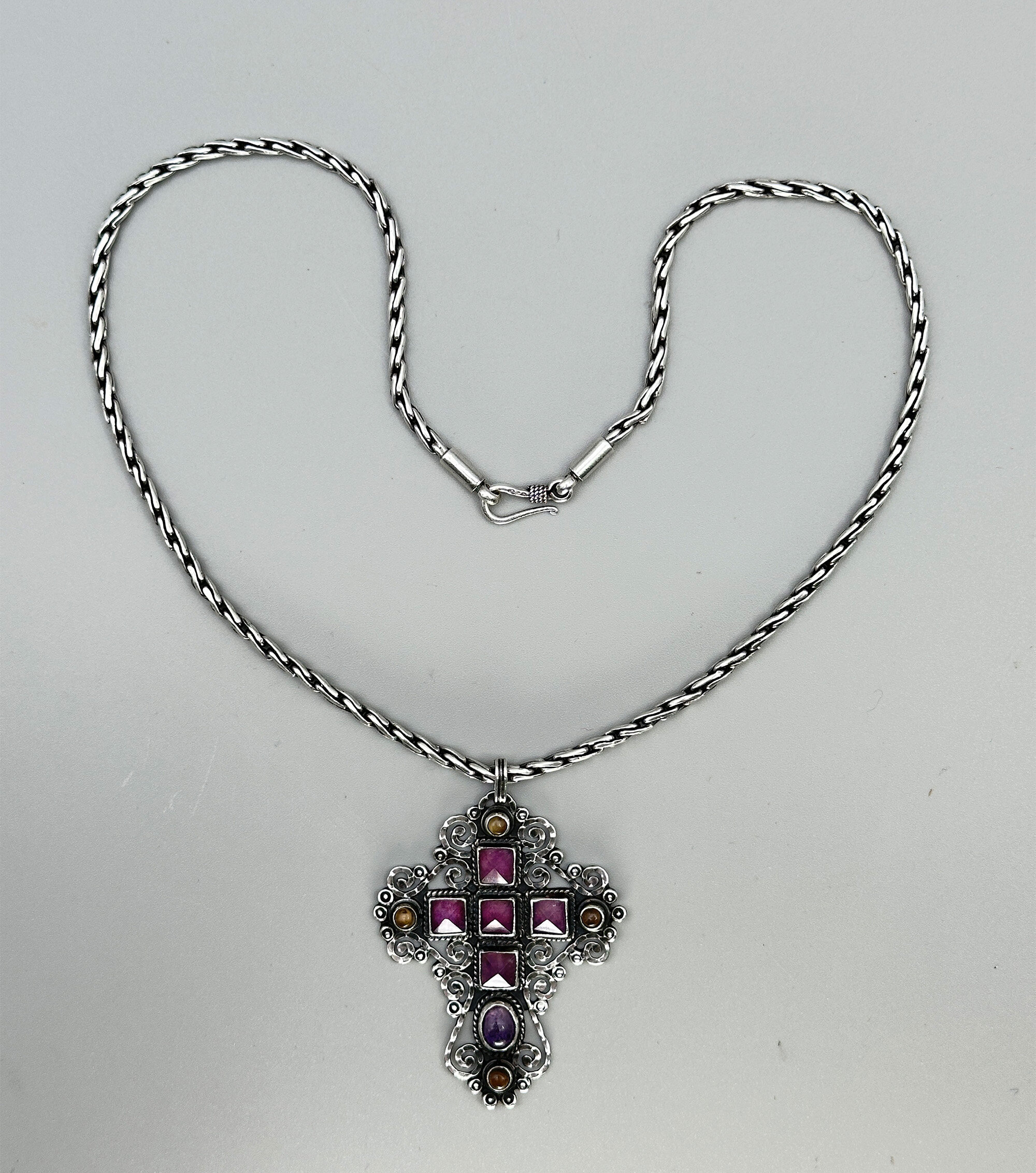 This is a very traditional Taxco design in the form of a cross. It is set with rose cut and cabachon amethyst stones. It is marked Made in Mexico with makers mark JGD and 925. It has been paired with a complementary heavy chain that is Indian in origin.| Size: | Cross is 59 x 47.6 mm, Chain is 48 cm long |