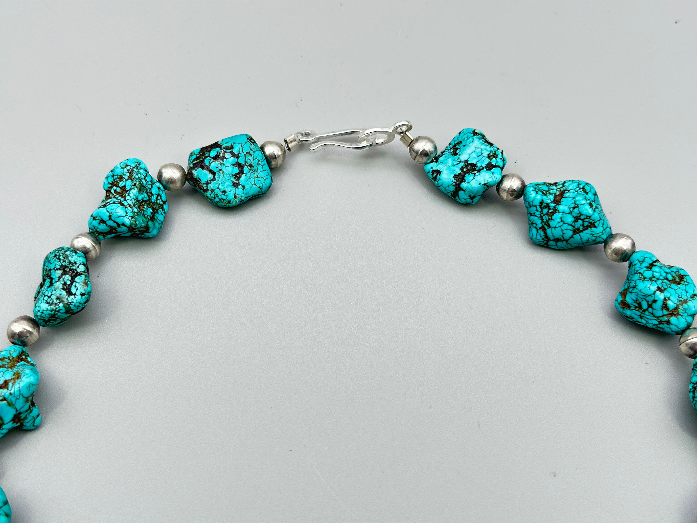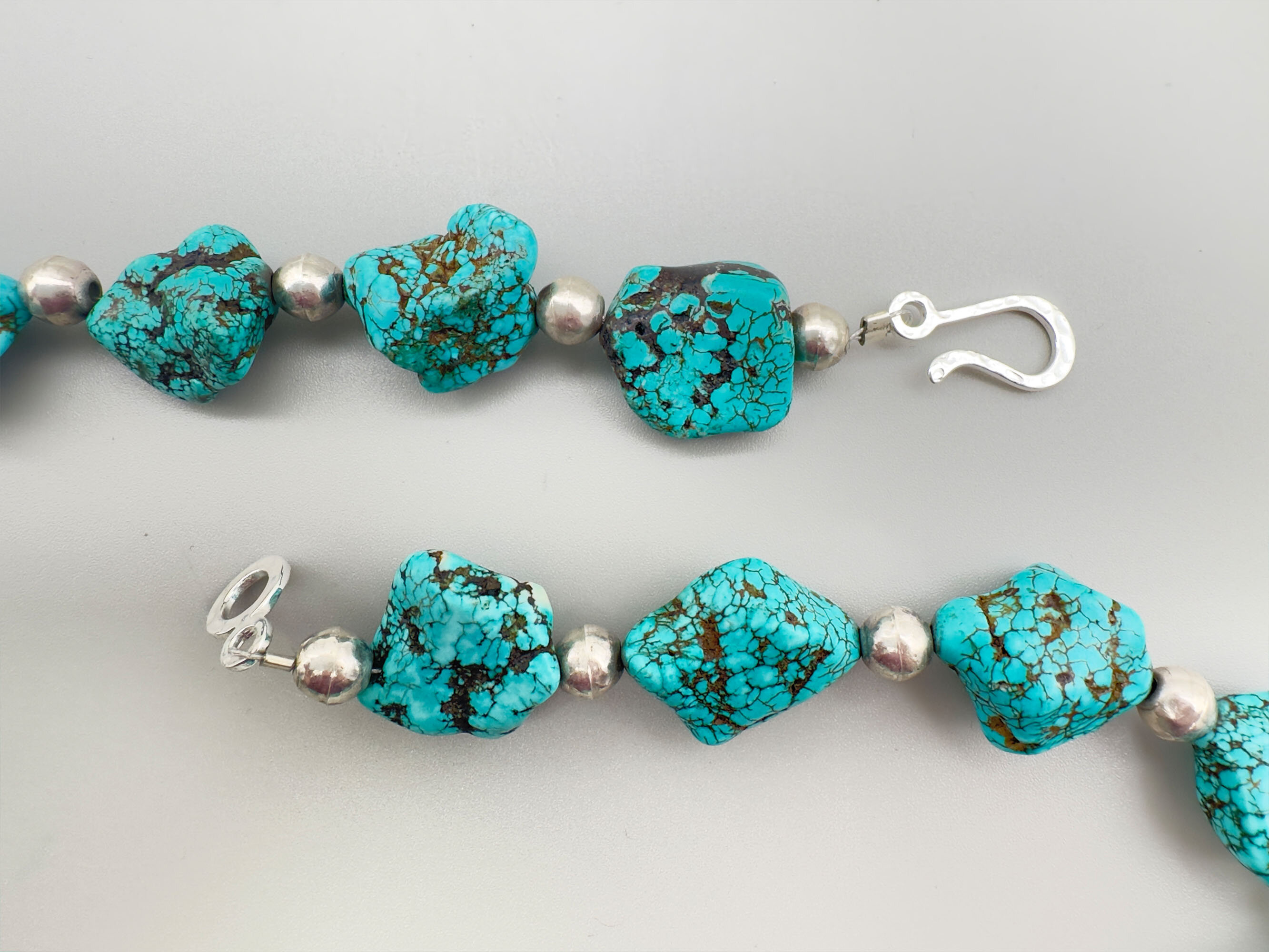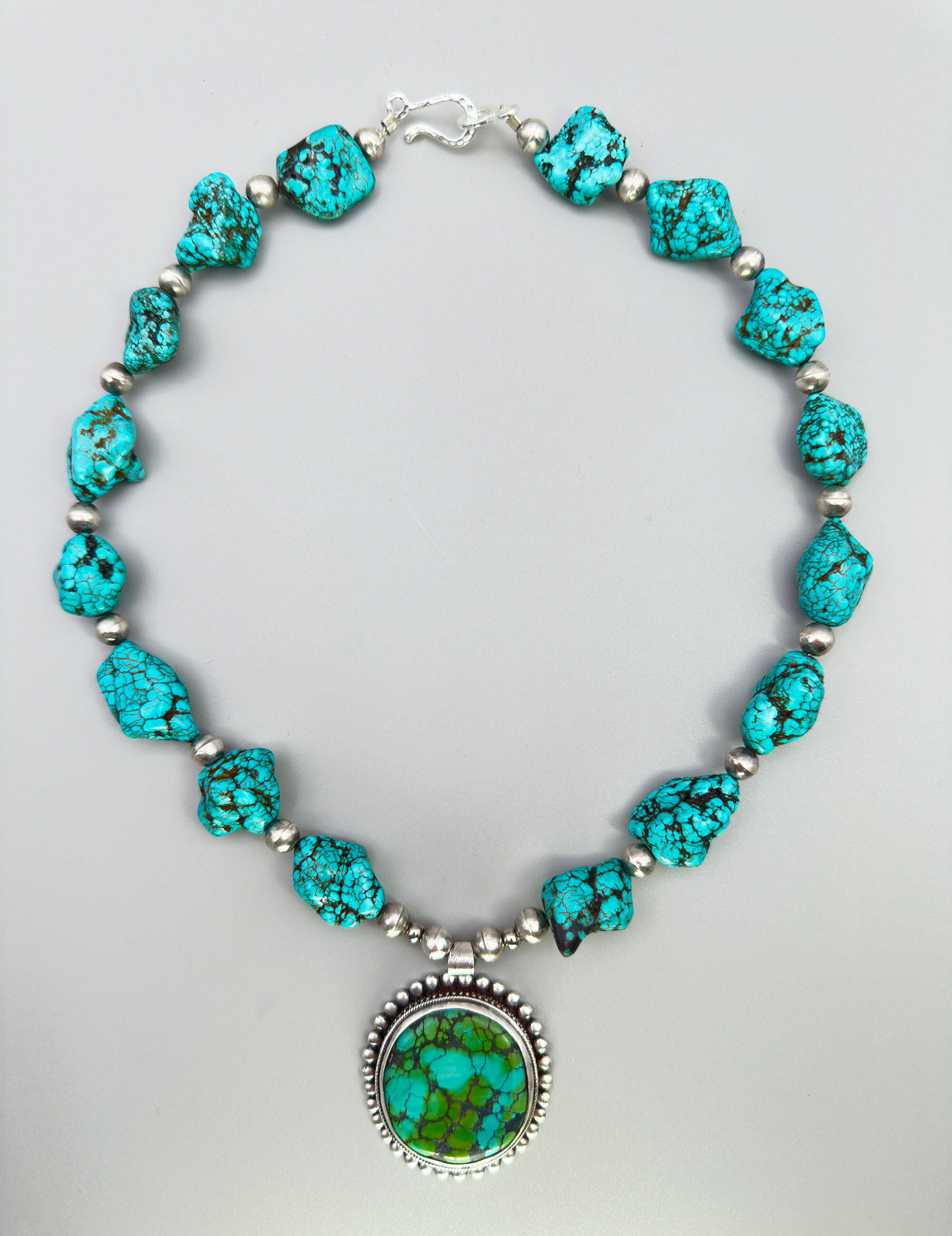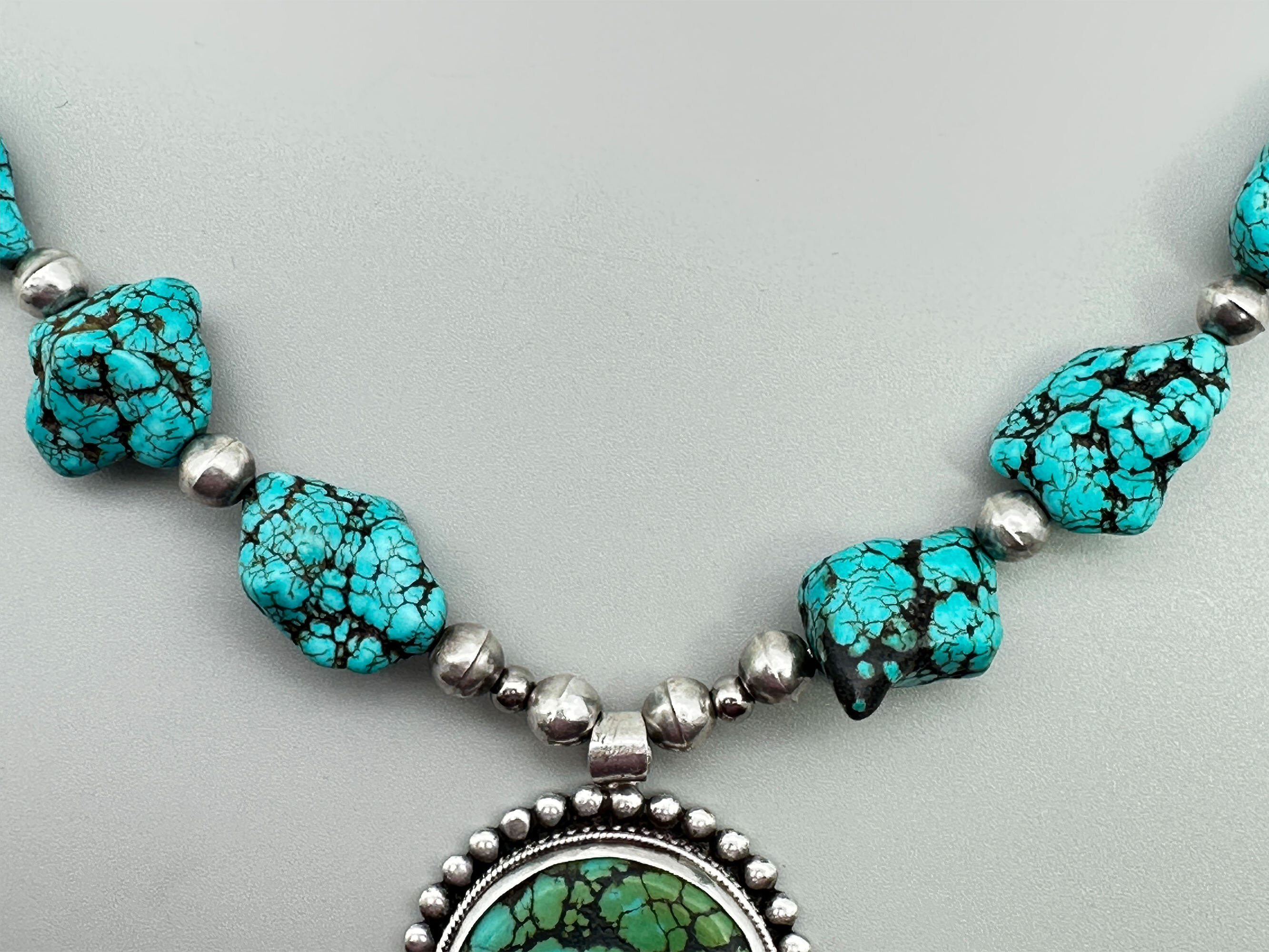 This is a very striking large turquoise necklace comprising a large pendant strung with turquoise nuggets and silver beads. The origin of the beads and pendant appear to be China, Hubei province. The silver beads are old navaho beads from the US. The pendant is set in a setting with beadwork and it is marked 925. This necklace has been constructed using different elements. It has recently been strung on steel wire with a new silver clasp.| Size: | Pendant without bail is 47.6 x 43.9 mm, Necklace is 58 cm long |