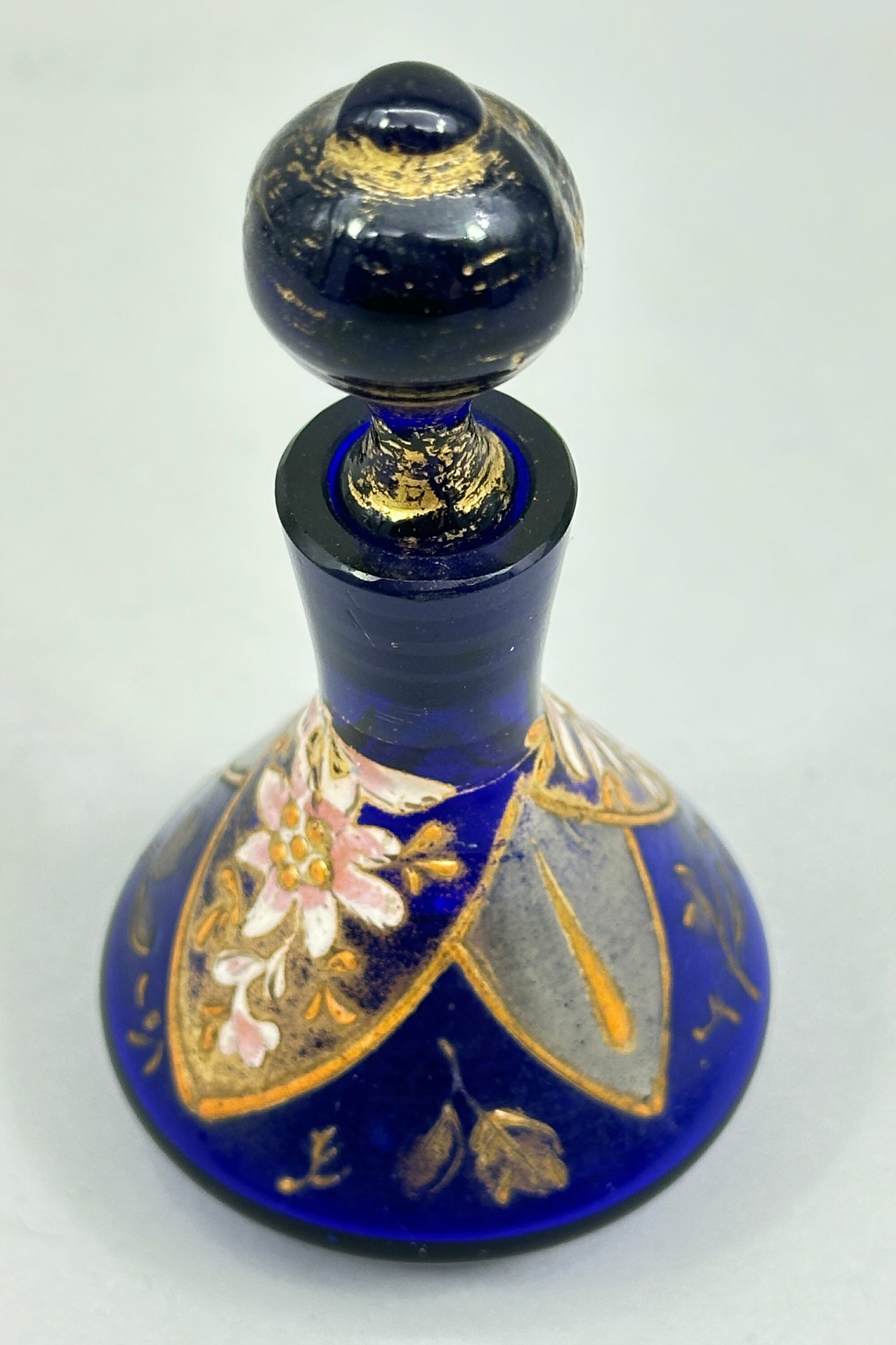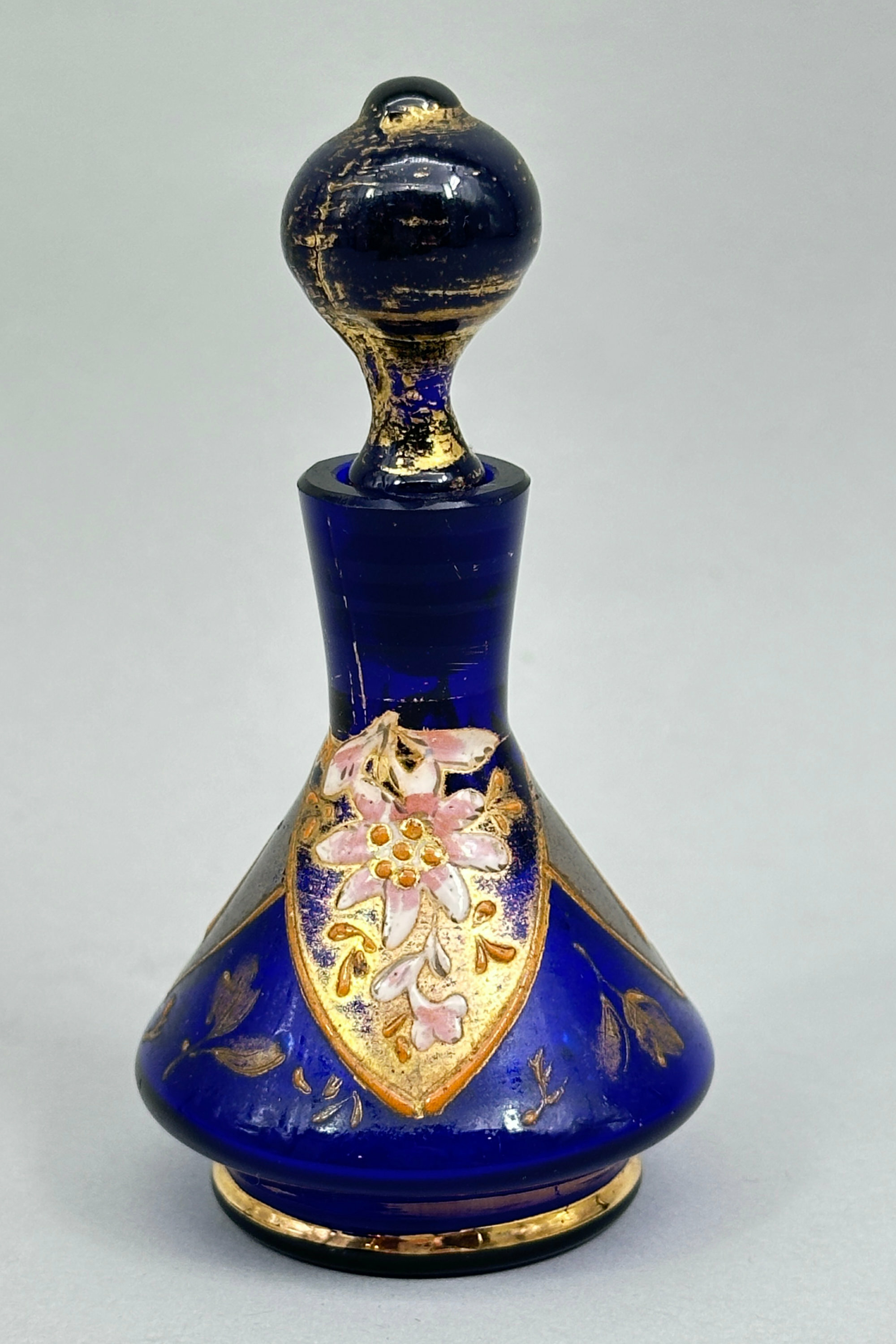 A perfume bottle and stopper, the body of rounded conical form with a short foot and a slightly flaring neck, the stopper ball shaped with a concave base, the cobalt blue glass with enamel and gilt decoration comprising four leaf shape panels, two with flowers, with gilt foliage sprays and gilt detailing to the stopper. The style of decoration here suggests this was made by one of the glassworks in Bohemia.So called ‘Bohemian’ glass was produced for export from the second half of the nineteenth century onwards by the workshops from the regions of Bohemia and Silesia, now parts of the Czech Republic. With its origins in the renaissance, Bohemian glass with its elaborate forms and colourful decoration of thickly enamelled floral subjects was made in substantial quantities to satisfy a keen demand from both Europe and America. The angular shape here along with the geometric elements to the decoration reflects the Art Deco style and suggests a dating to the 1930s.