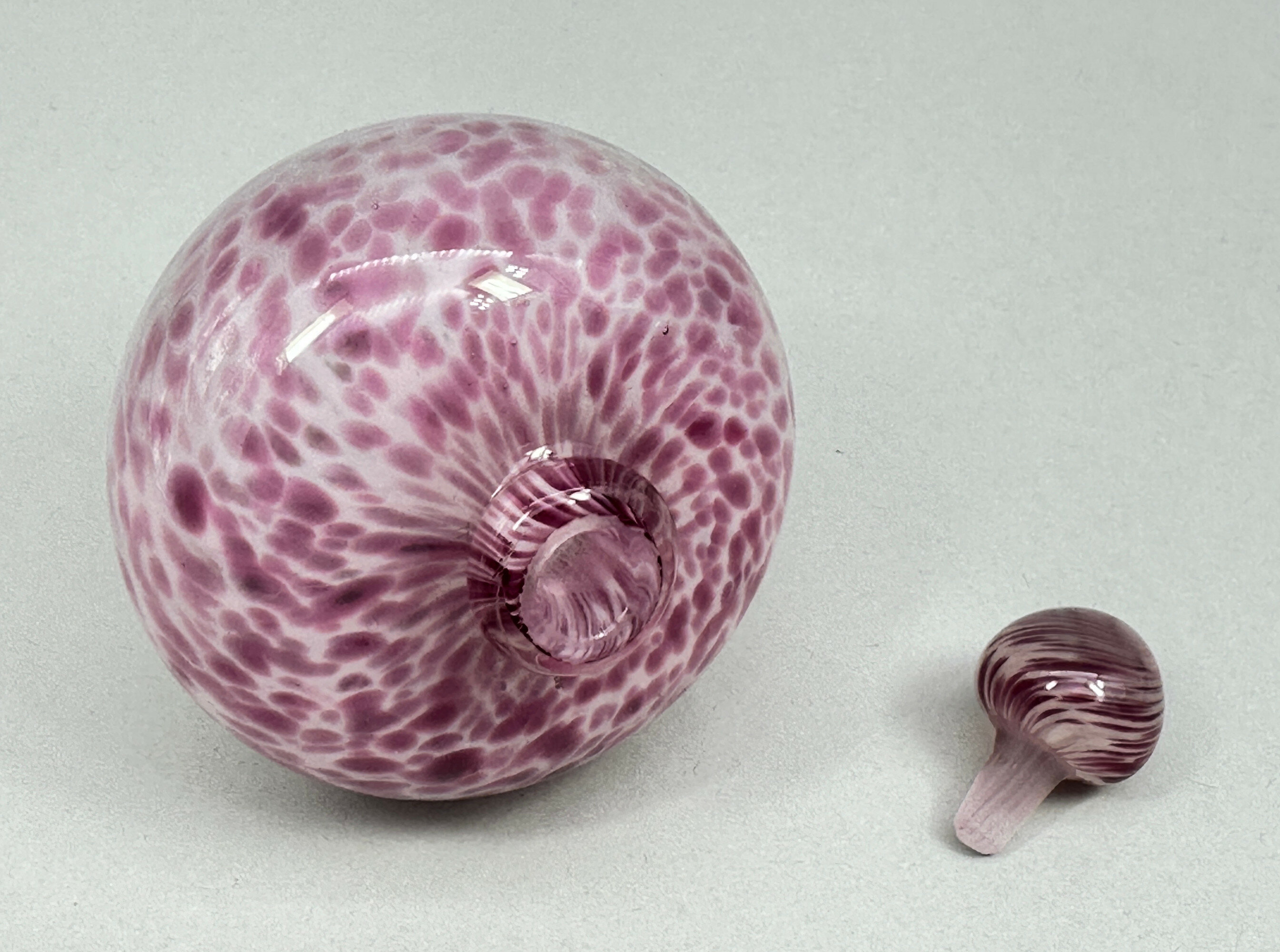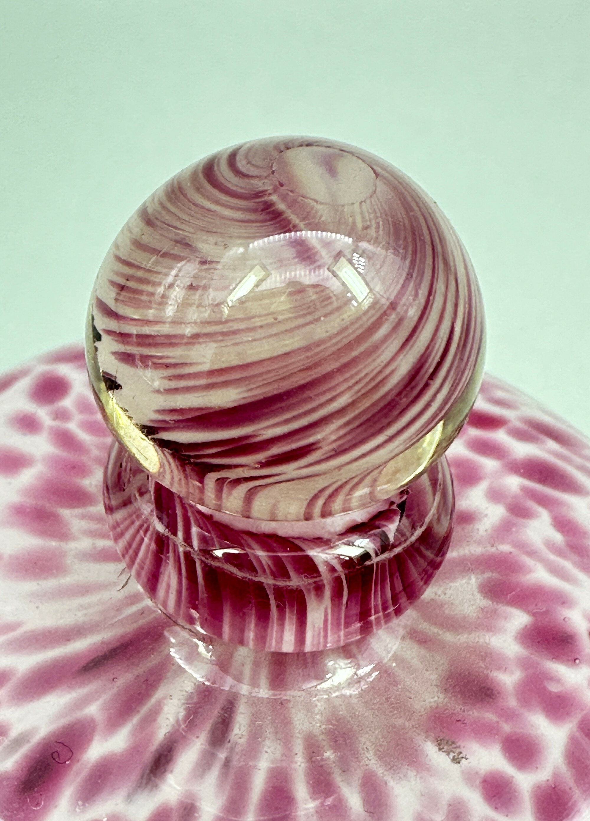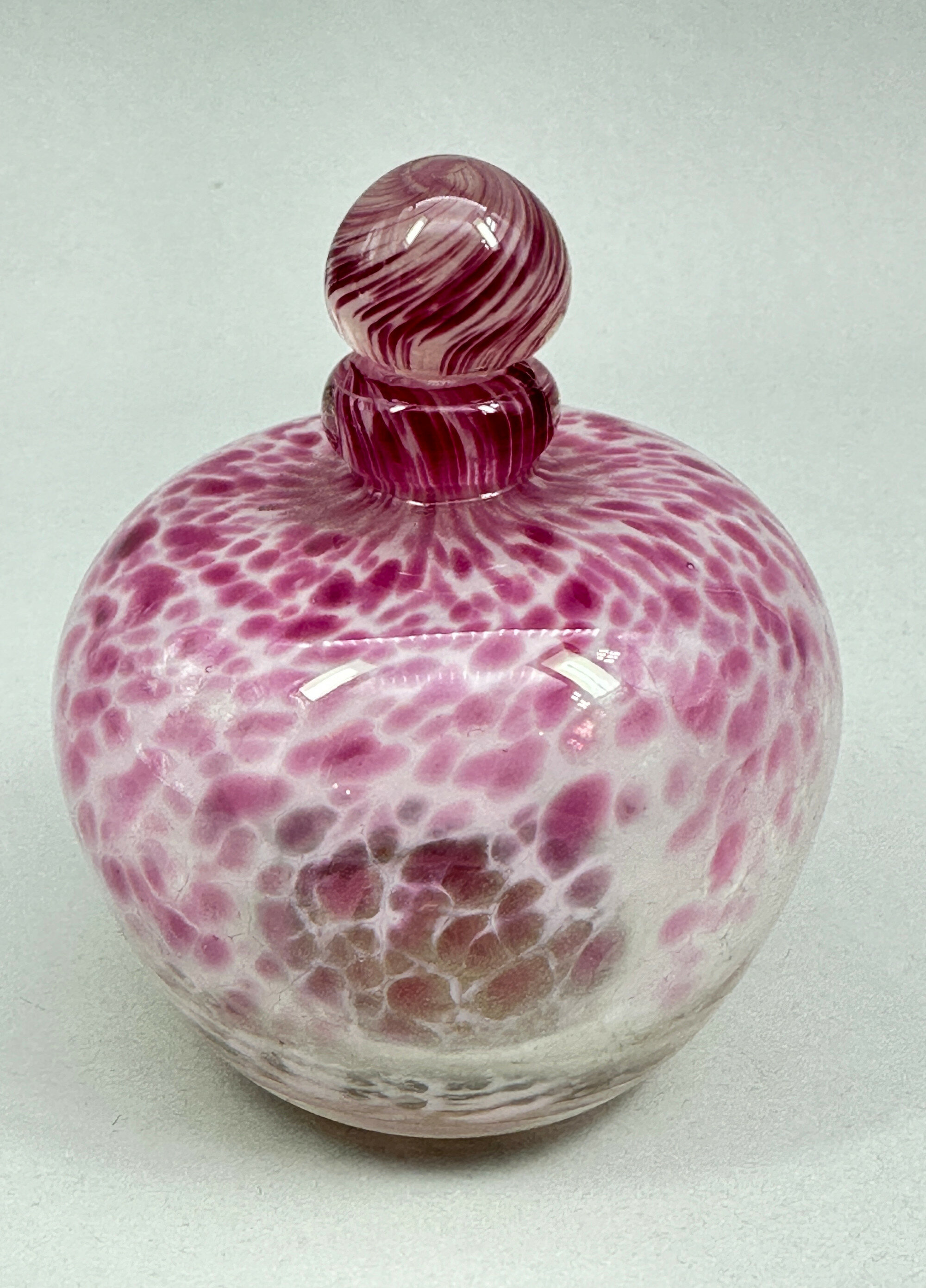 A perfume bottle and stopper, the broad pear shape body with a flaring neck and fitted with a ball shape stopper, the glass blown with swirling flecking effects in apricot and white and the stopper plain. The pattern and design of this perfume bottle is typical of pieces made by the Caithness glass factory in Scotland and similar pieces can be found with their label attached. The Caithness glass factory was established in 1961 at Wick, Caithness by Robin Sinclair, 2nd Viscount Thurso and soon taken over by George Mackie, Baron Mackie of Benshie in 1966 who remained its Chairman for twenty years. Set up to provide additional employment in the area, the company also was intended to exploit the availablity of sand for glassmaking in Caithness, although this did not prove suitable for the manufacture of clear glass. Paperweights became a speciality and the firm received a Royal Warrant from the Queen Mother in 1968. Twice driven into receivership in the early years of this century, it was eventually bought by Dartington Crystal in 2006 and continues the manufacture of paperweights today.Size: | Ht 9cm high, Width 8cm |