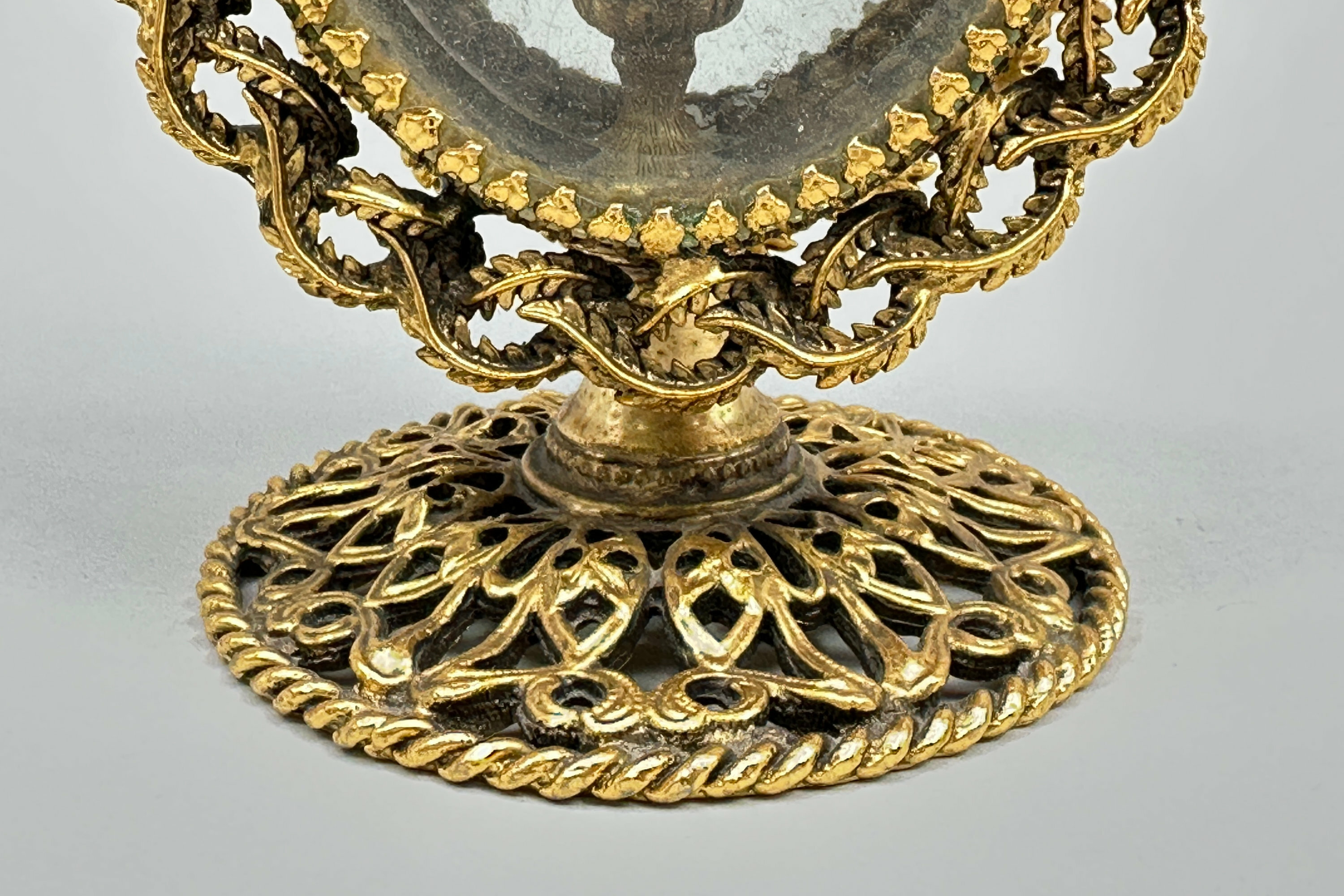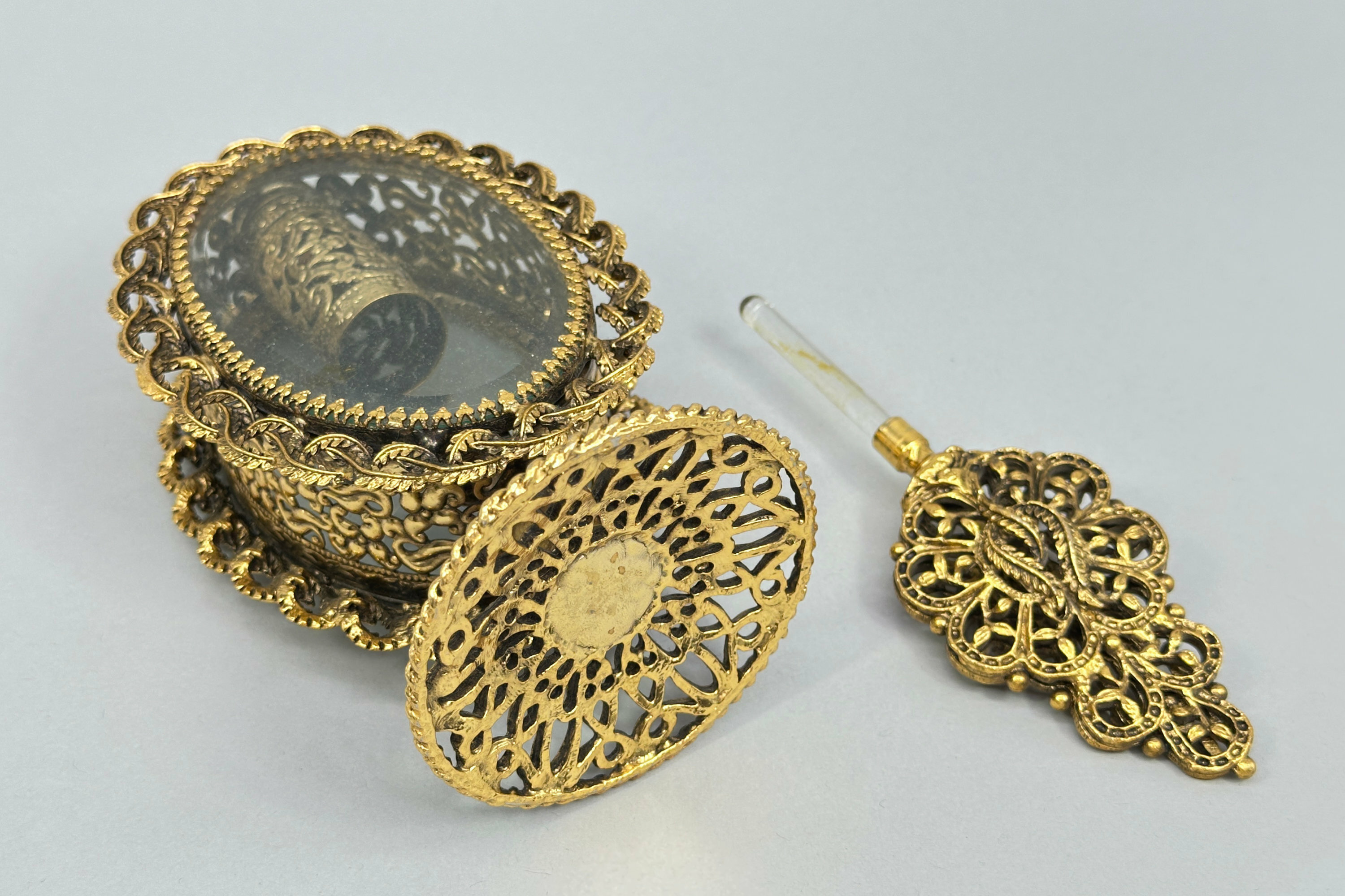This is a classic example of the decorative pieces produced in the ‘Hollywood Regency’ style which evolved from the work of designers furnishing the homes of film stars and actors from the 1920s onwards. Opulence was the key here with recollections of and variations on the design styles of earlier years particularly those of the rococo era. Dressing table pieces were made to be intentionally luxurious with elaborate gilt metal decoration and bevelled glass panels combining to produce ornaments of showpiece quality. The scent bottle here has two oval bevelled glass panels set in a gilt metal case with elaborately cast sides, a spreading foot and a crown knob stopper, all with twisting and interlocking stylised floral decoration. The body of the piece was refillable and the stopper has a glass rod for application. Similar pieces were made by the New York firm ‘Stylebuilt’ which was founded in 1946; many carry an impressed mark but some have just a paper label reading ‘Stylebuilt Accessories’ ‘NEW YORK’ ‘’24 K GOLD PLATED’ ‘GUARANTEED NOT TO TARNISH’. The style here is so close that we may well have a genuine ‘Stylebuilt’ accessory here missing its original paper label, but there is no certain proof of this. Accessories from the firm seem to date from the 1950s to the 1970s and this is most likely the time of production of this particular piece. It survives in perfect condition with the gilt work bright and shining, definitely living up to the claim of remaining untarnished, and is a fine memento of an extravagant style, once so popular.Size: | Ht 24cm (overall) 18cm (bottle), Depth 4 cm |
