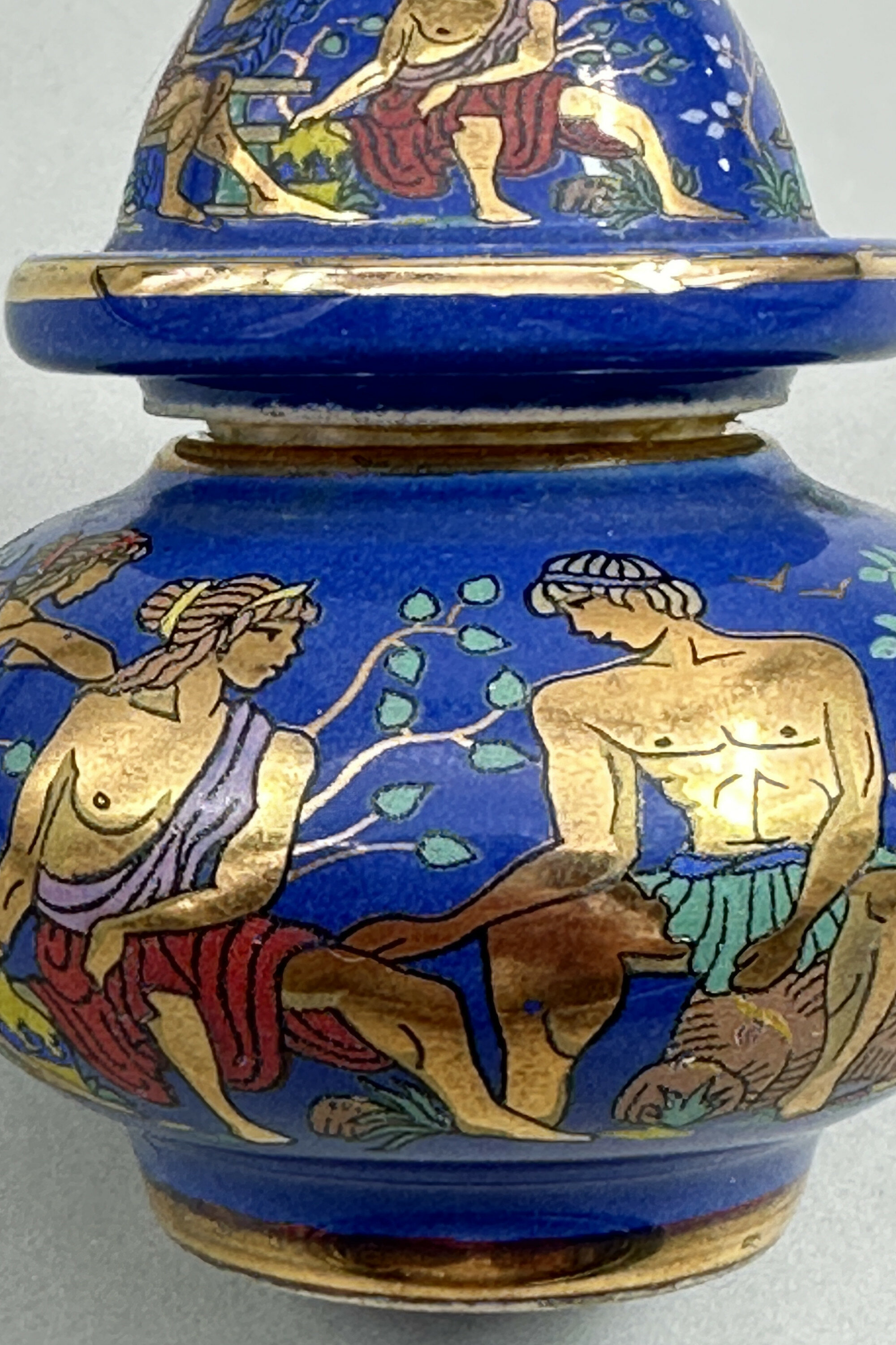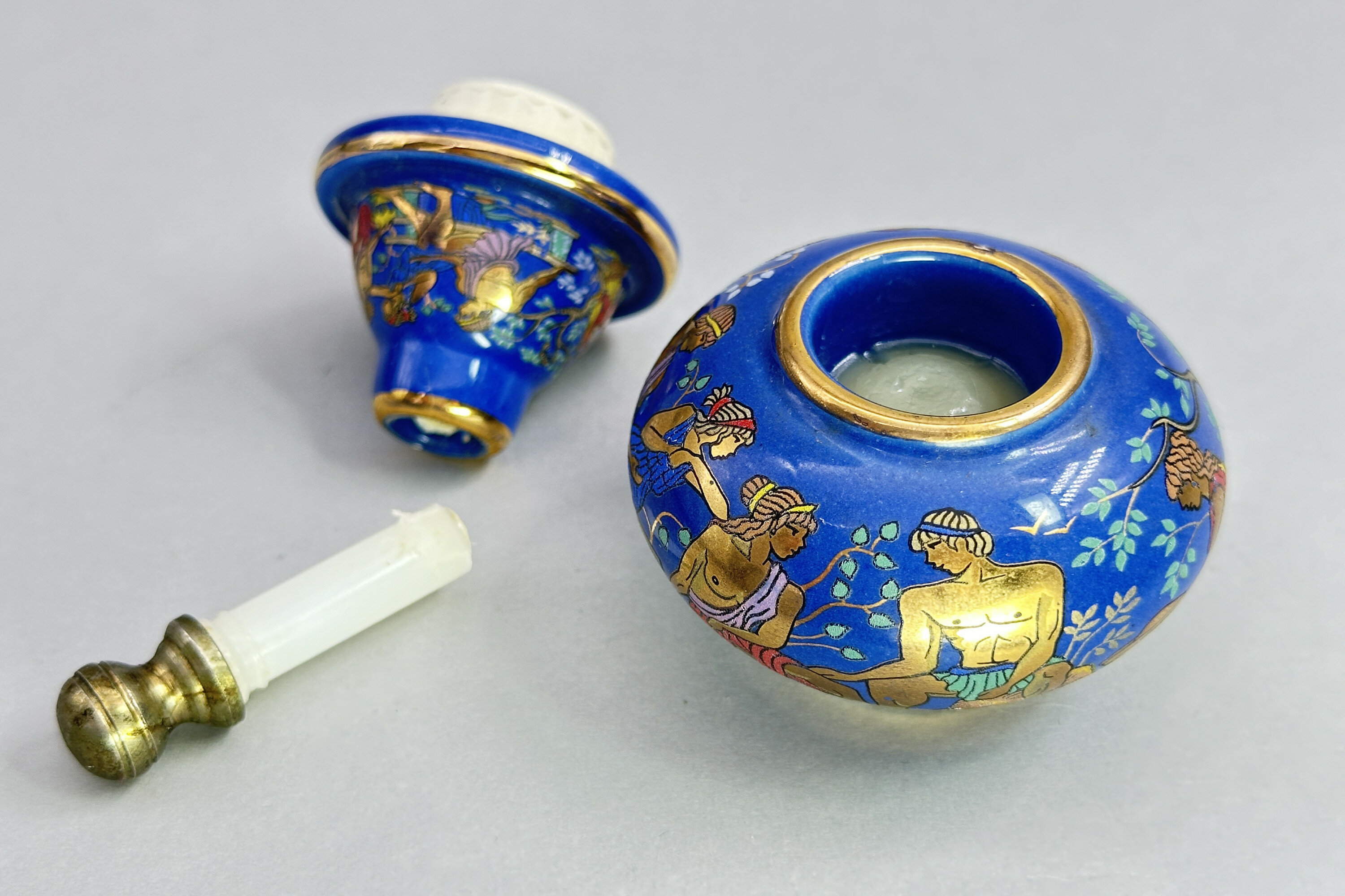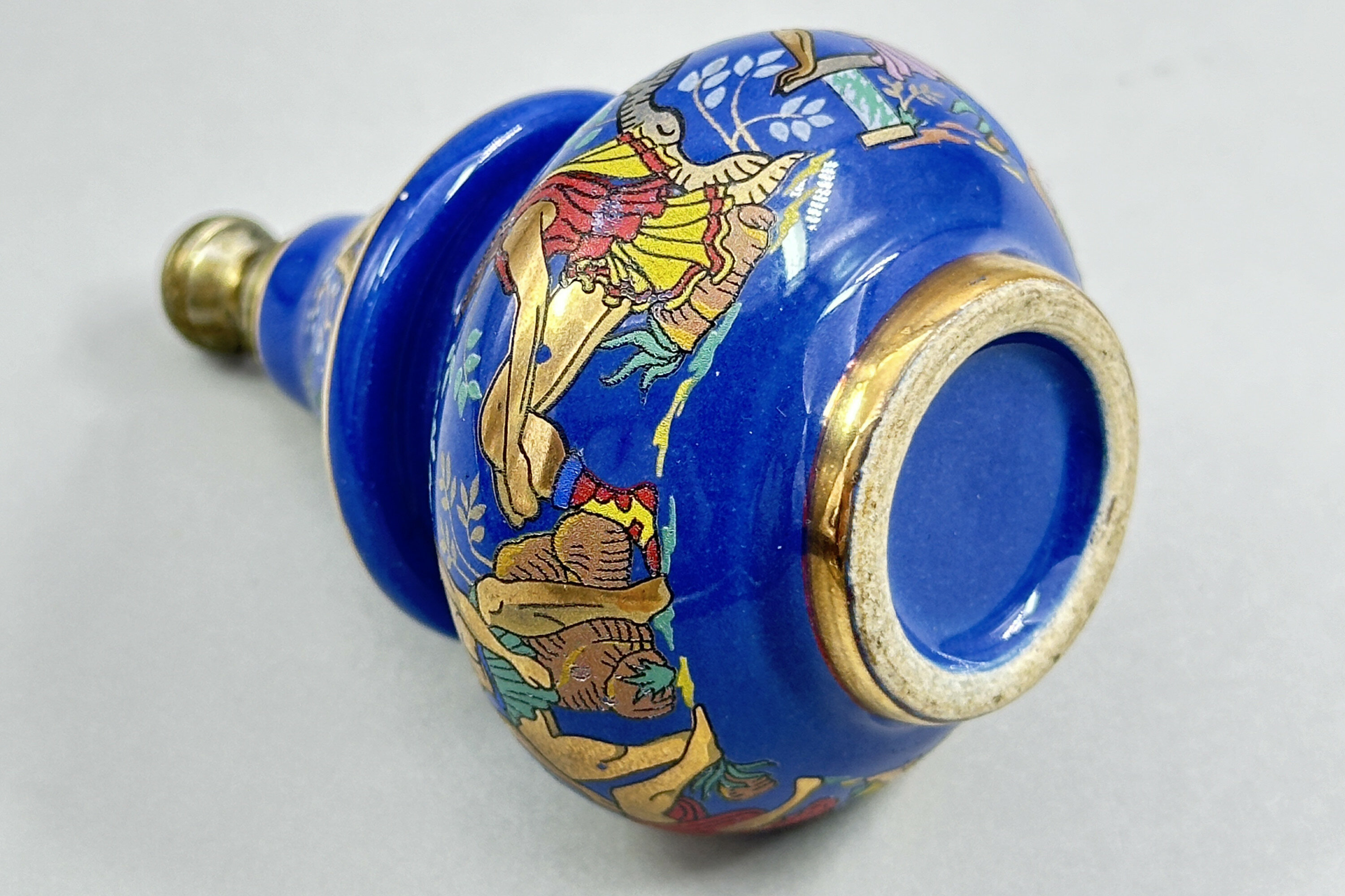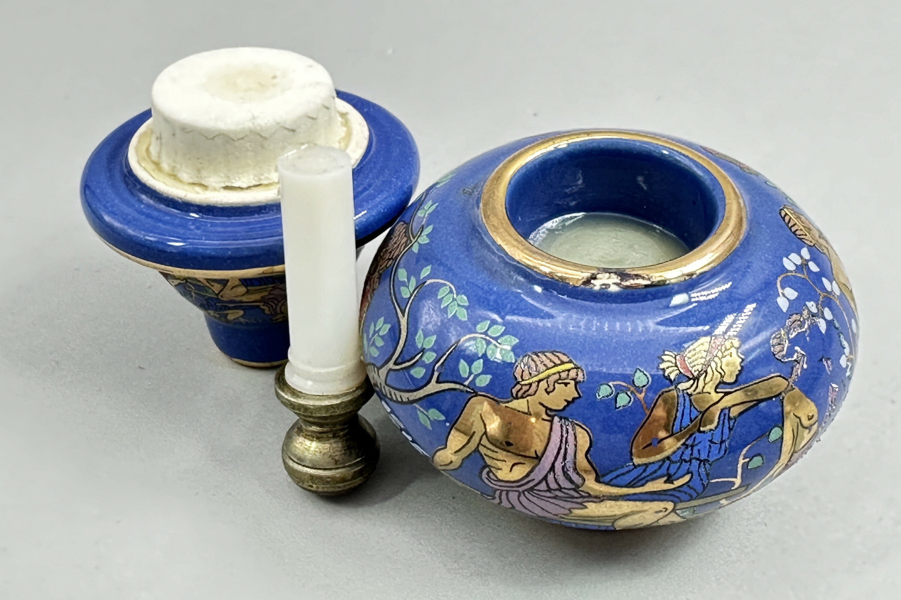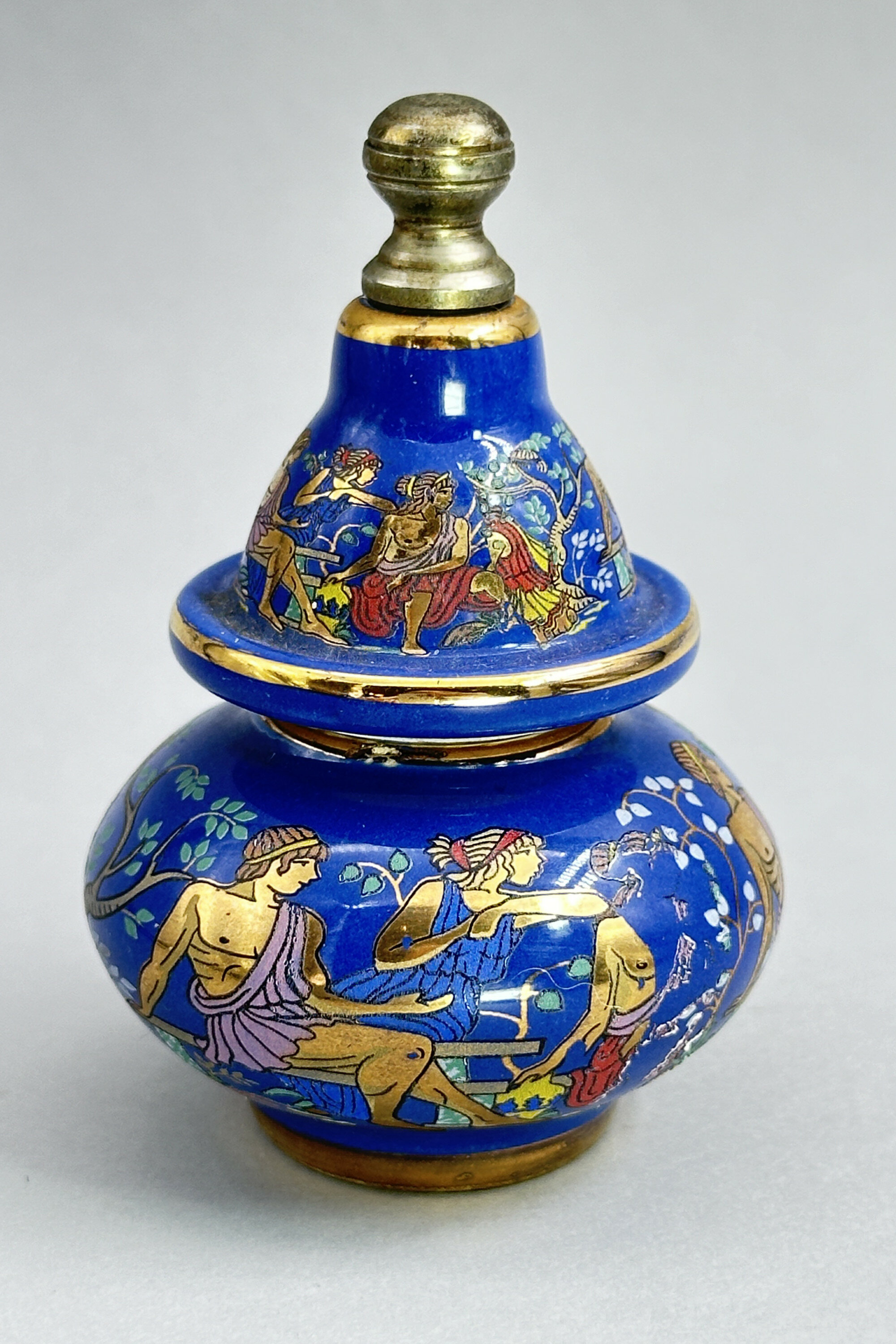 A ceramic perfume bottle the compressed bulbous body fitted with a high domed cover and a separate ‘dipper’ finial, the rich blue glaze brightly decorated with polychrome and gilt figures in a pseudo classical style reclining and conversing, the interior with traces of perfume cream. The Greek manufacturers of perfumes seem sometimes to have turned to the Classical era as inspiration for the decoration on the vessels containing their products. Similar bottles can be found with packaging labelled ‘Anapal by Anastasios’. The designs are pastiche in the extreme but the effect is opulent and no doubt reflects the luxury of the contents inside!Size: | Ht 9cm, Width (max) 6cm |