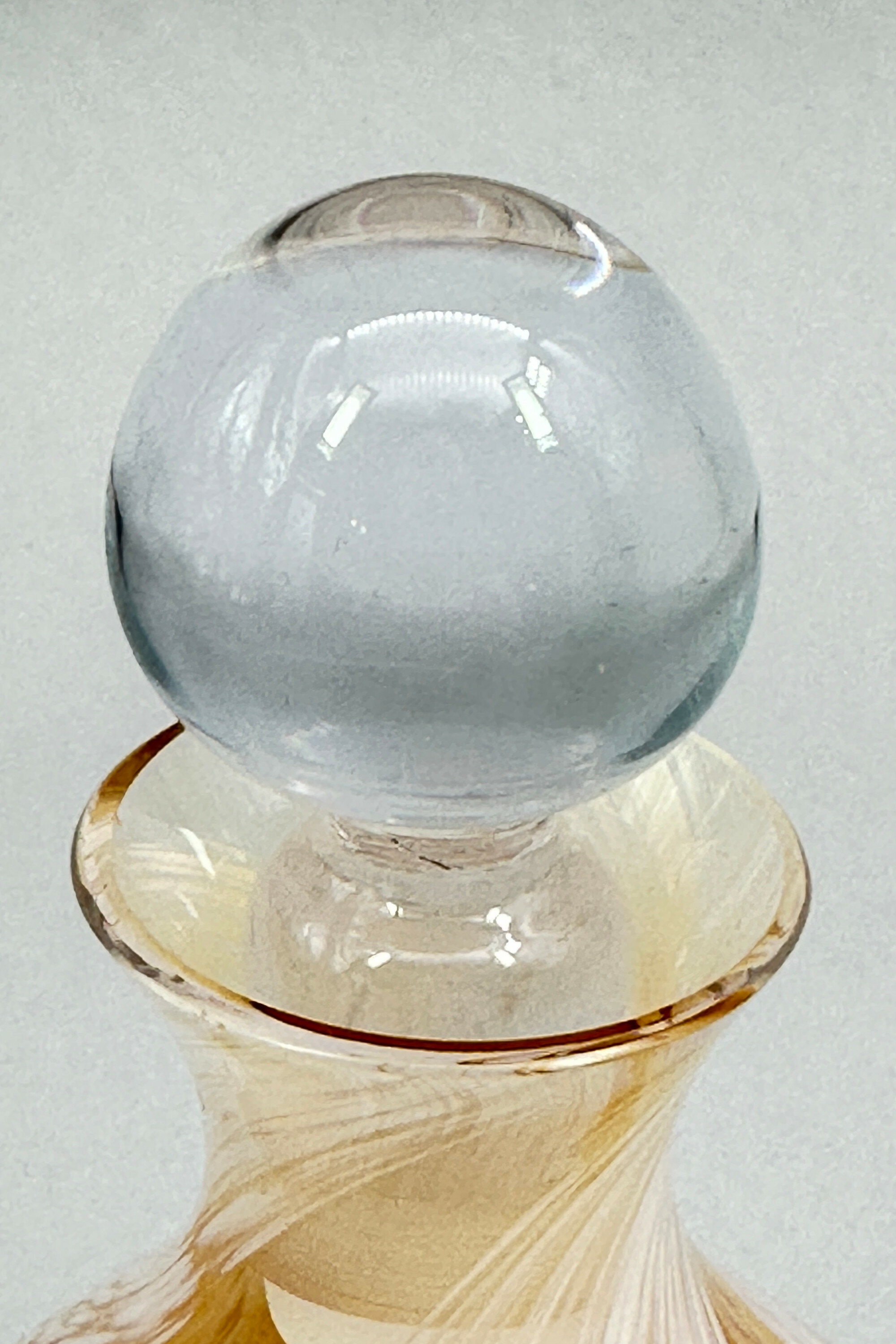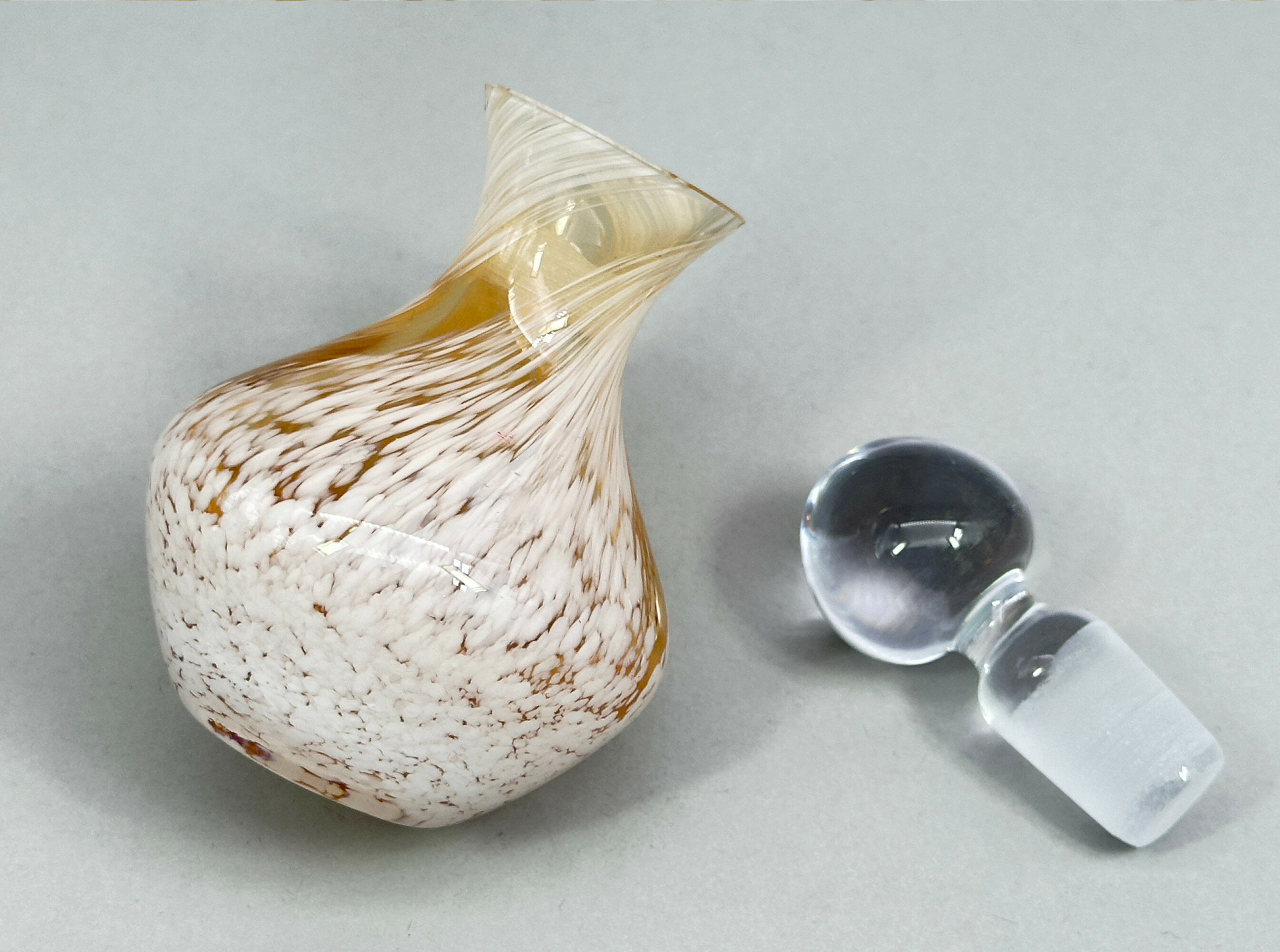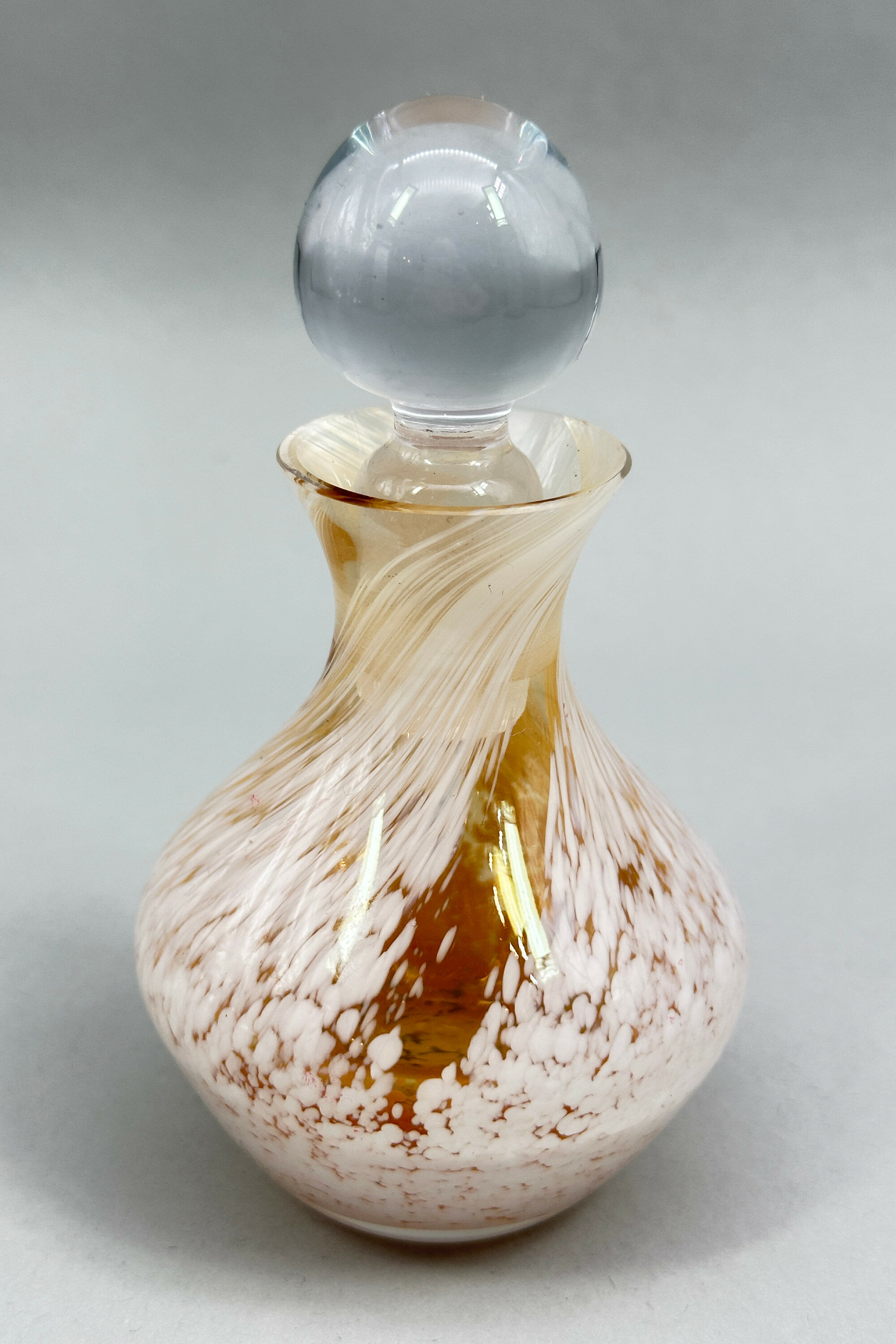 A perfume bottle and stopper, the globular almost spherical body with short collar fitted with a rounded stopper, the glass blown with purple and white flecking effects merging into a swirling design at the top which continues to the stopper. Similar pieces can be found with the label 'Island Glass, Guernsey', and one of these also has the moulded mark on the bottom which appears here and may represent trees and waves. Island Glass was a glass studio based in Guernsey which seems to have had a very short existence in the late C20th. It is believed that one of the employees there was Chris Dodds who was later to set up his own studio in Selkirk, Scotland. Little is known of this firm but they were clearly capable of making pieces of high quality and appeal.Size: | Ht 13cm, Width 8cm |