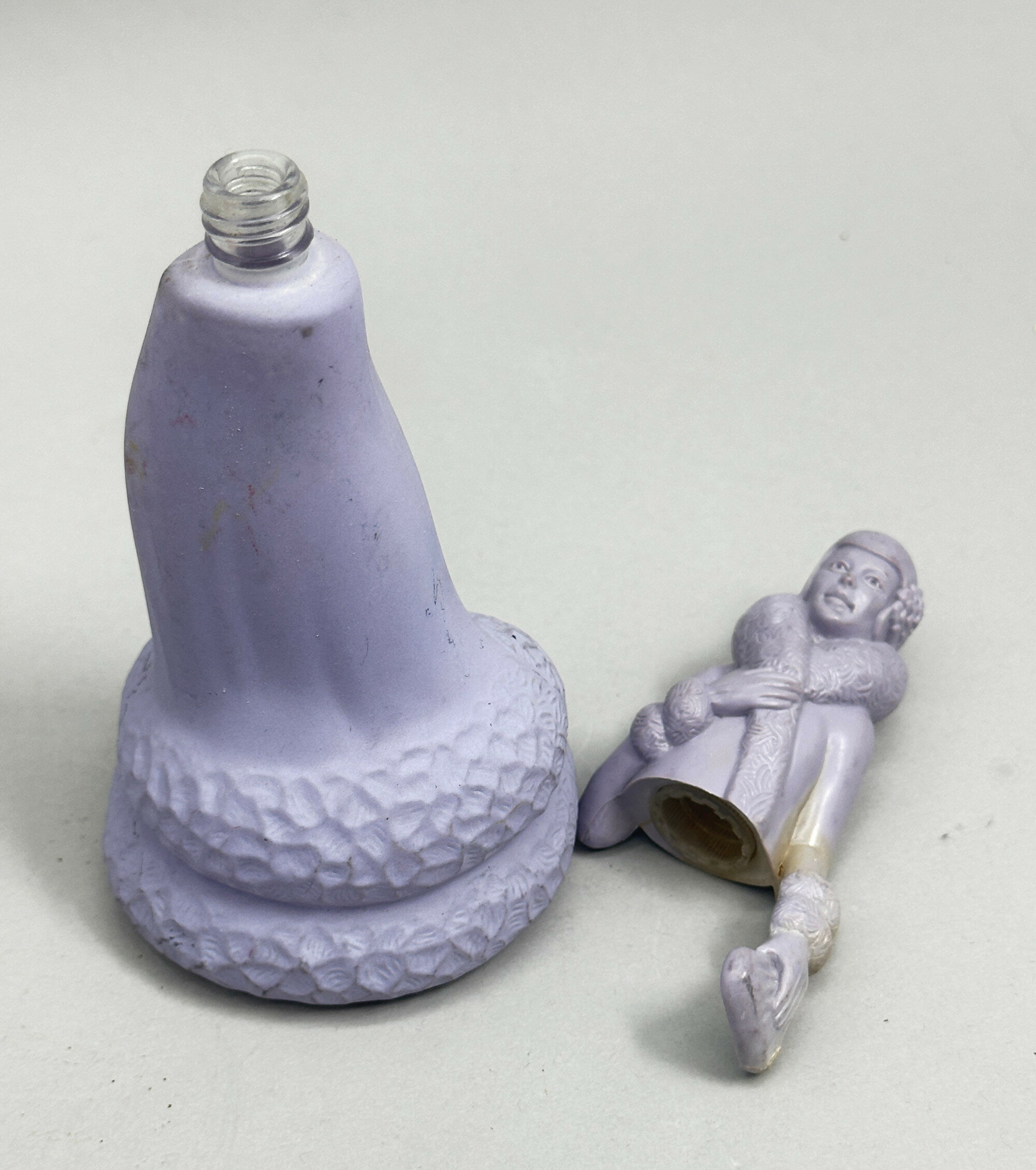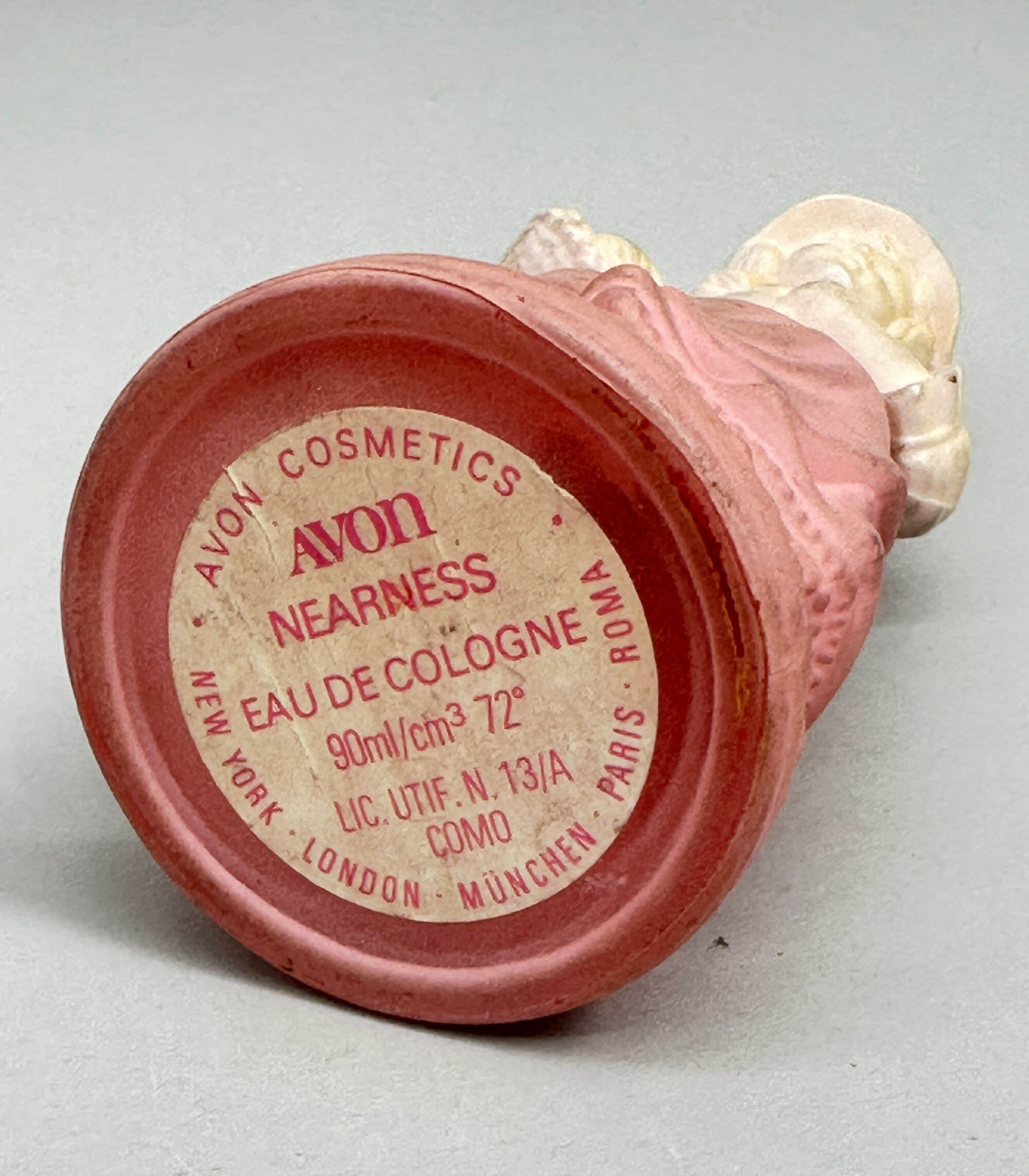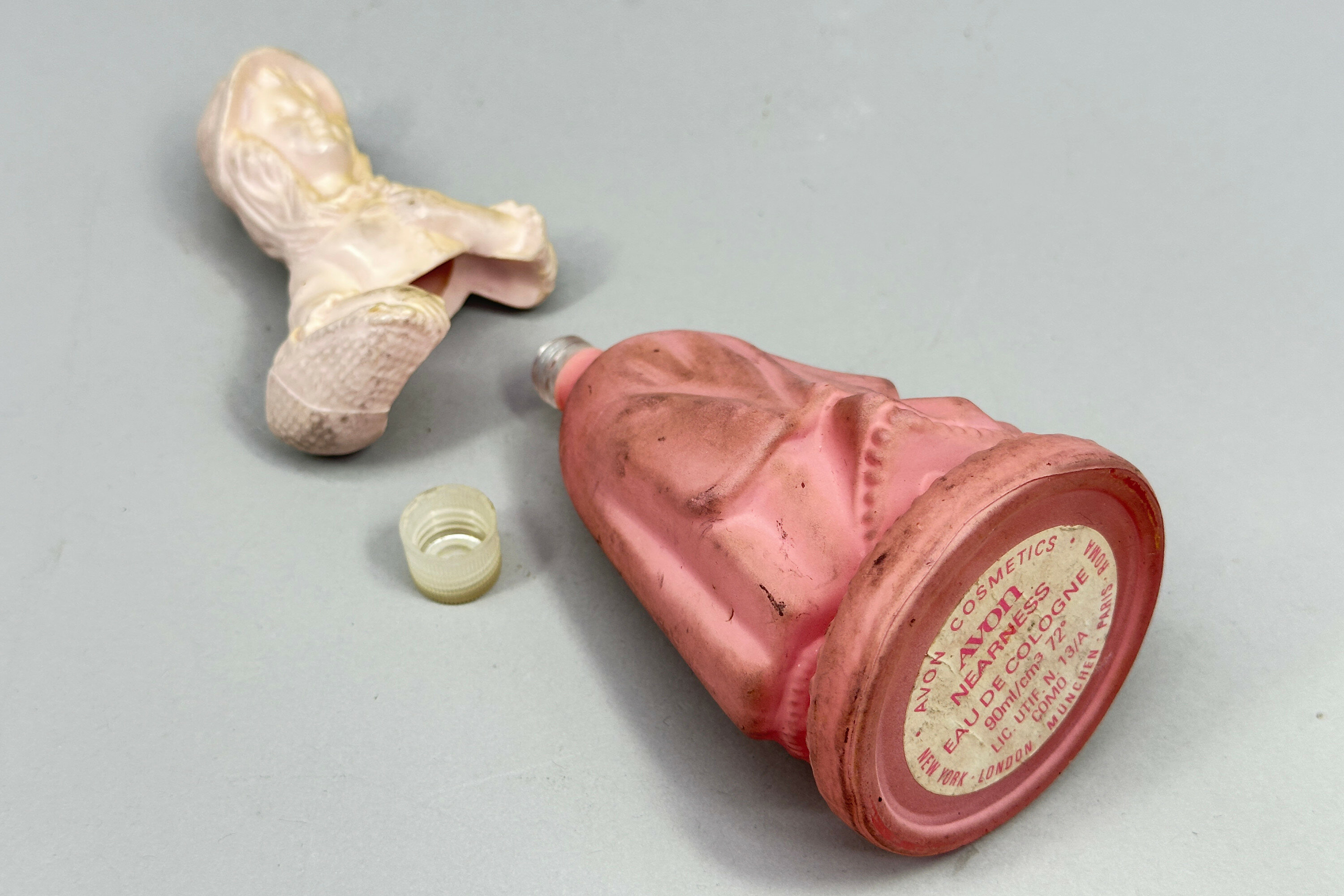 These are two from the series of perfume bottles in the form of ladies or young girls issued by Avon in the 1970s. The first represents a figure in 1920s dress and is sometimes found with a label (missing here) which reads ‘Roaring Twenties’ followed by the name of a perfume. The second is a country girl complete with its label which reads ‘Avon’ ‘Nearness’ but the same model is found with other labels, indicating that both these containers were used for more than one brand of perfume. These bottles were an amusing marketing ploy which doubtless contributed to many successful sales.Size: | Lavender 17 cm high, Pink/Cream 15.5 cm high |