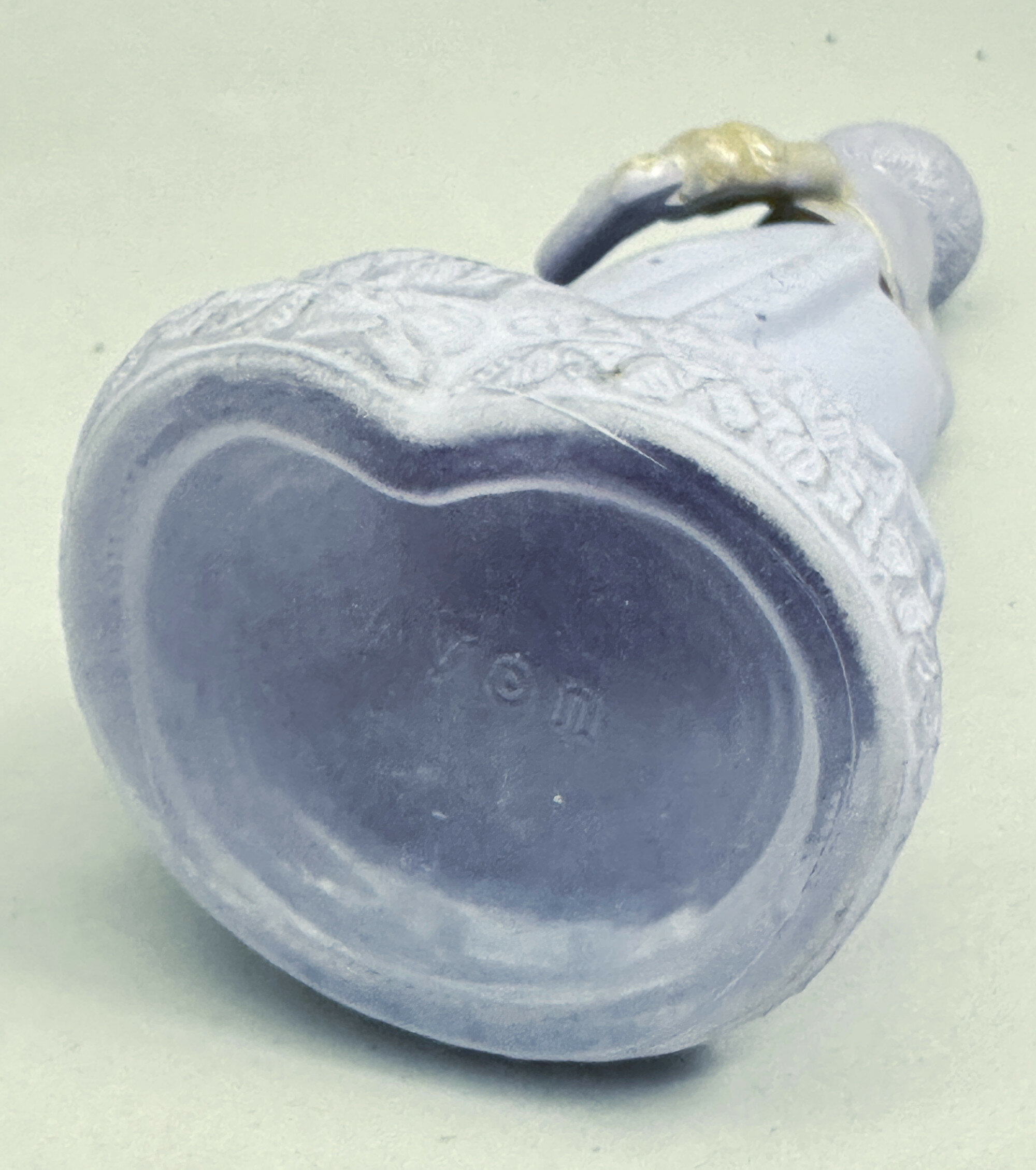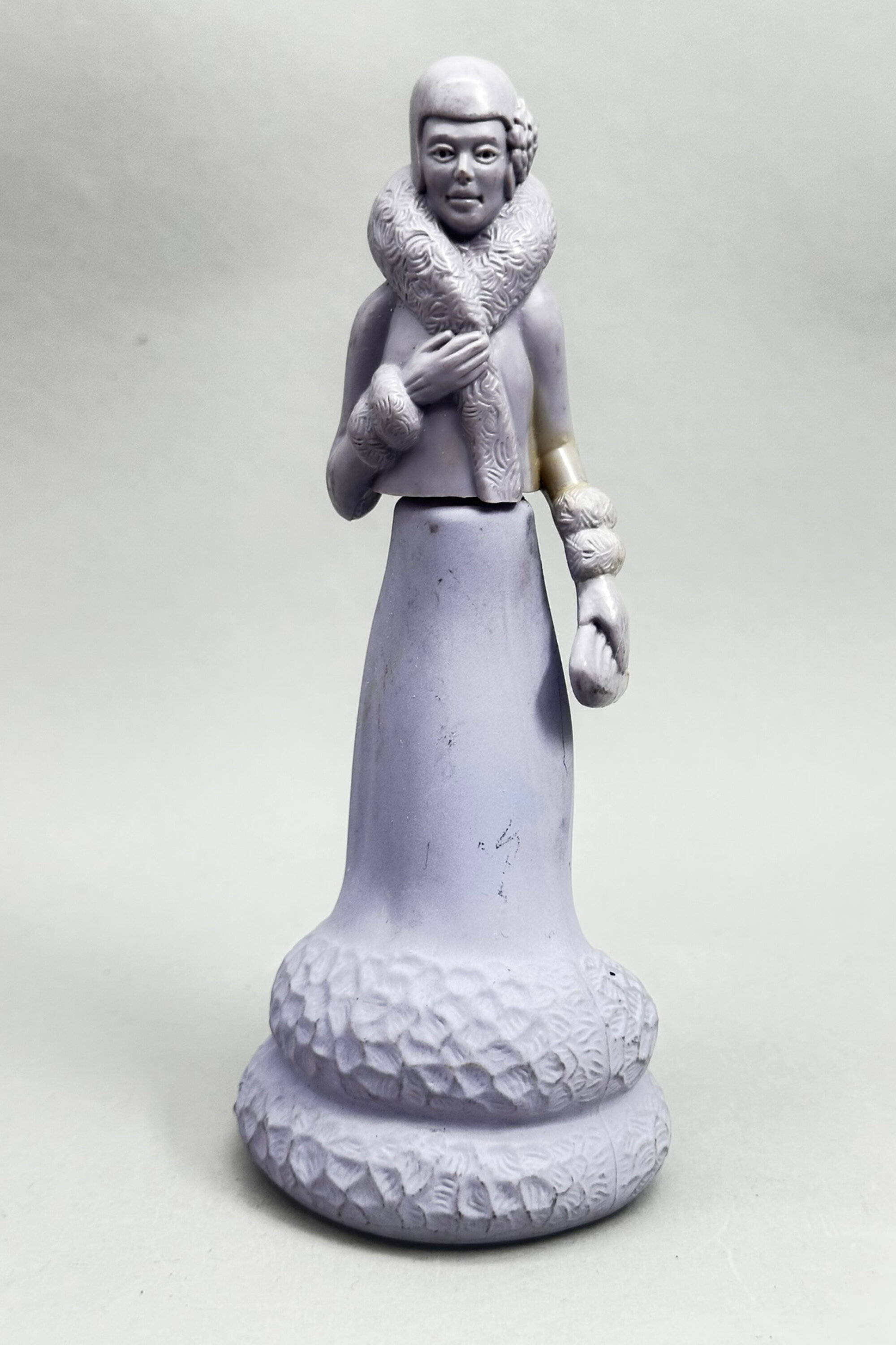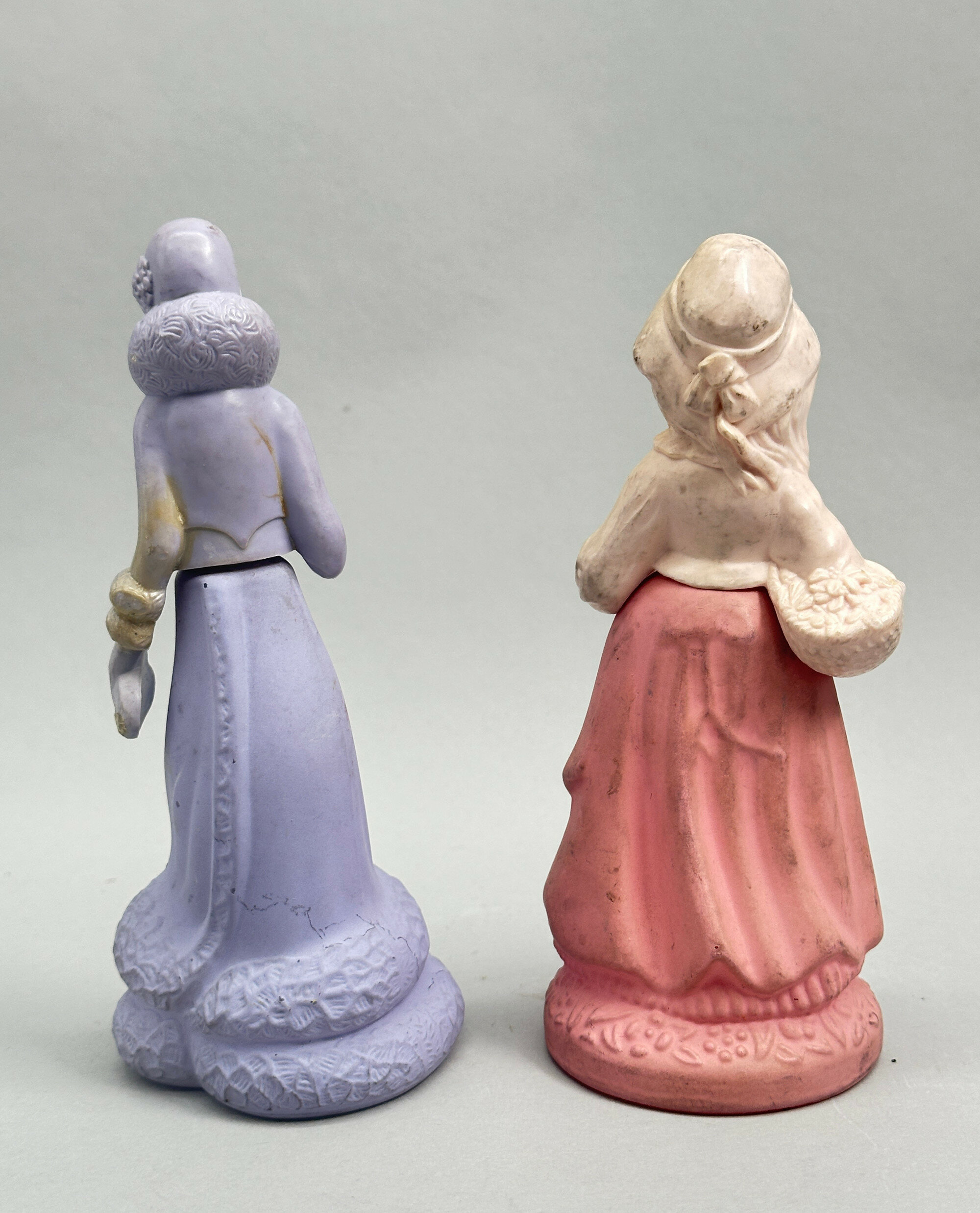 These are two from the series of perfume bottles in the form of ladies or young girls issued by Avon in the 1970s. The first represents a figure in 1920s dress and is sometimes found with a label (missing here) which reads ‘Roaring Twenties’ followed by the name of a perfume. The second is a country girl complete with its label which reads ‘Avon’ ‘Nearness’ but the same model is found with other labels, indicating that both these containers were used for more than one brand of perfume. These bottles were an amusing marketing ploy which doubtless contributed to many successful sales.Size: | Lavender 17 cm high, Pink/Cream 15.5 cm high |