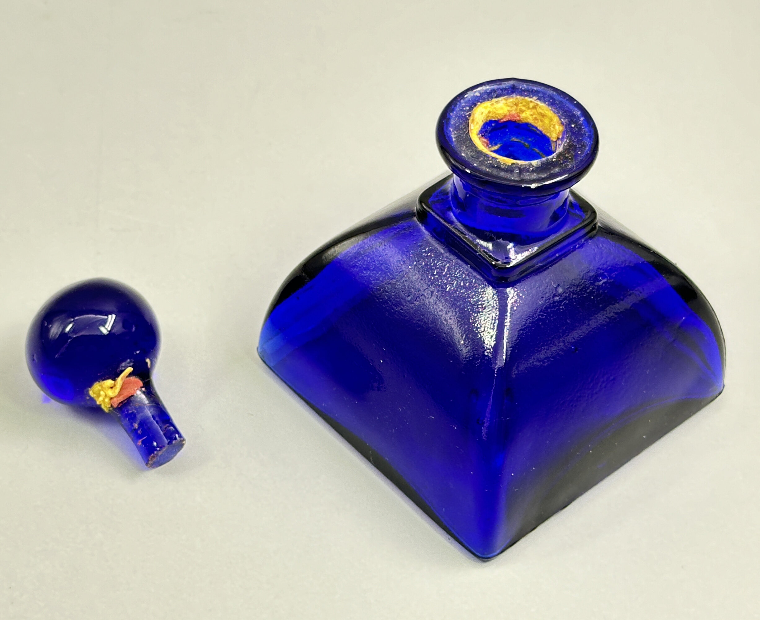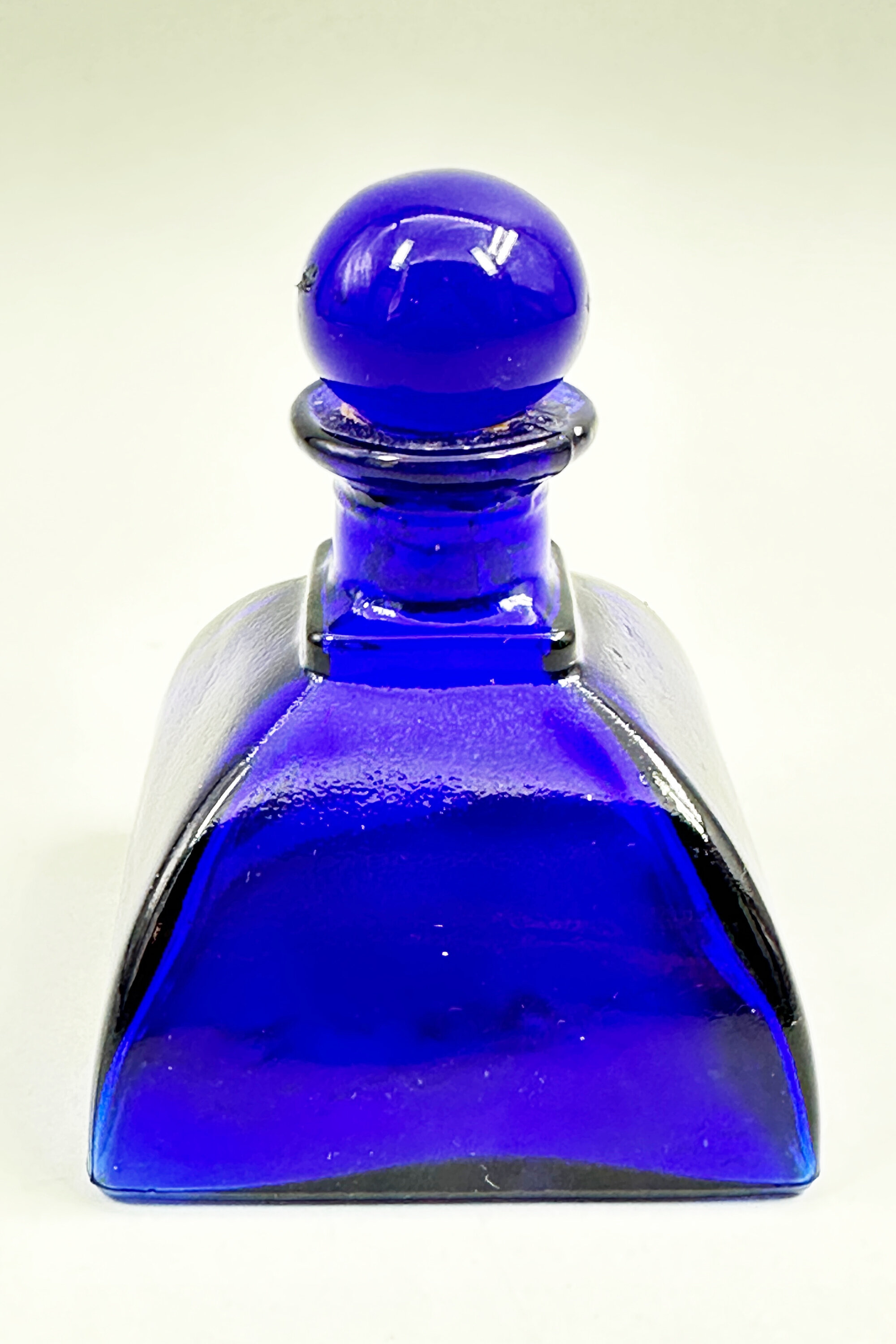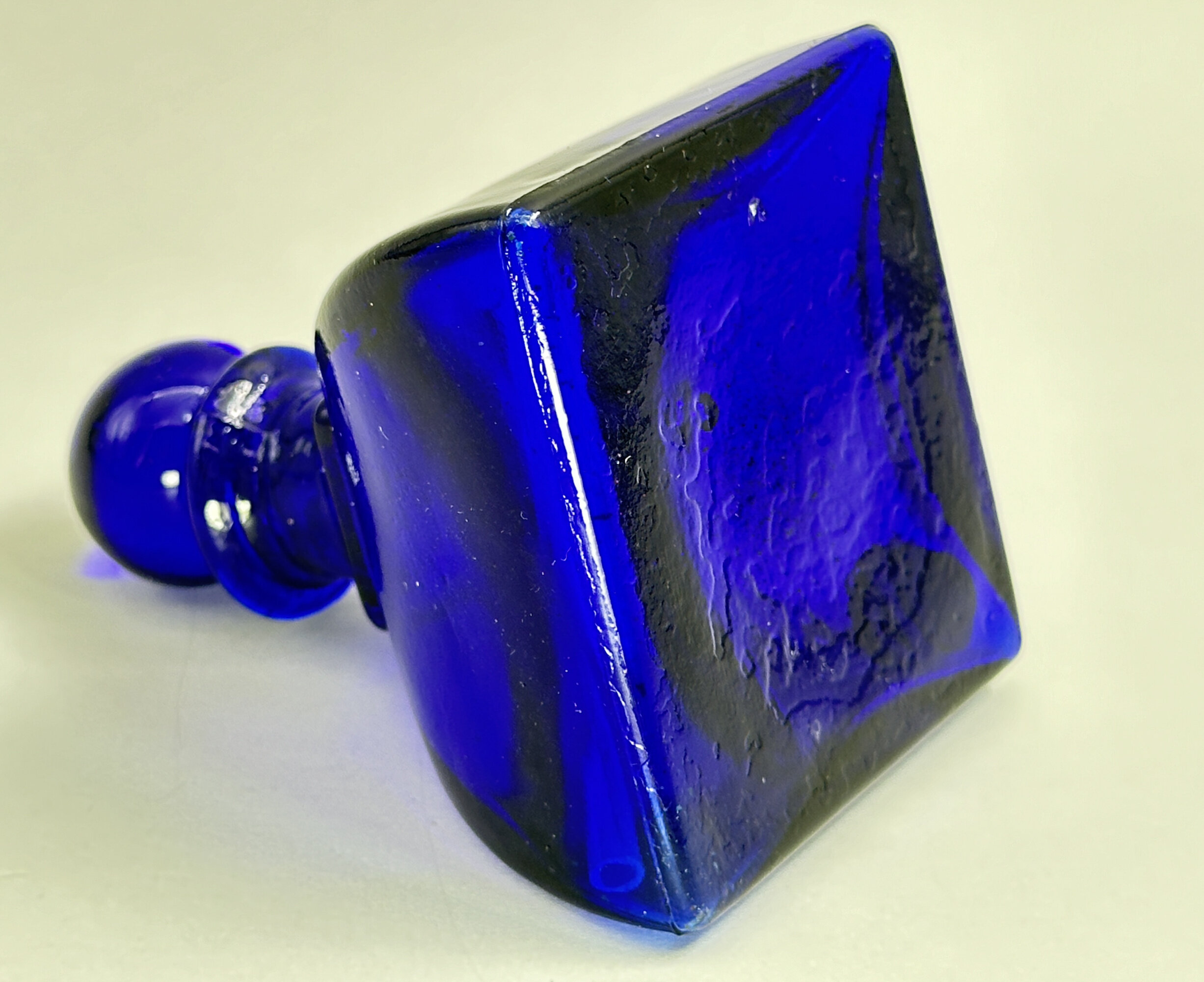 A blue glass small bottle and stopper in deep cobalt blue of squared and rounded pyramid form with a stepped concave neck. The shape suggests a perfume bottle and similar examples do exist including one with a gilt Chloé mark which would mean a post 1952 date of manufacture. The technique here, though, resembles the ‘pressed glass’ pieces made in England during the 1930s, for example by the firm Davidson, suggesting a more likely dating to that period. The slightly Art Deco feel to the form fits in with this. While it has slight damage, it is, of course, more unusual to find this shape with its original stopper.