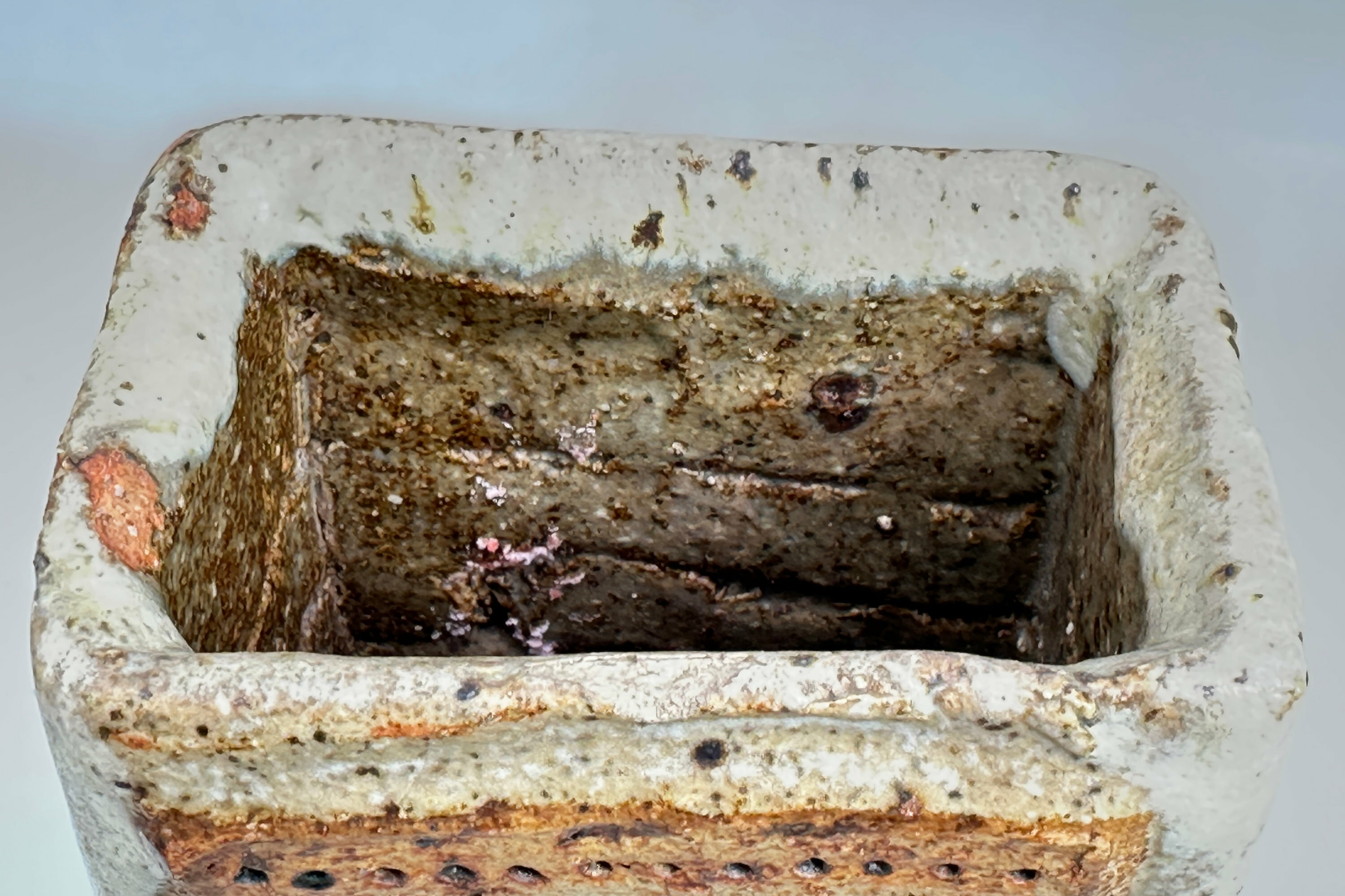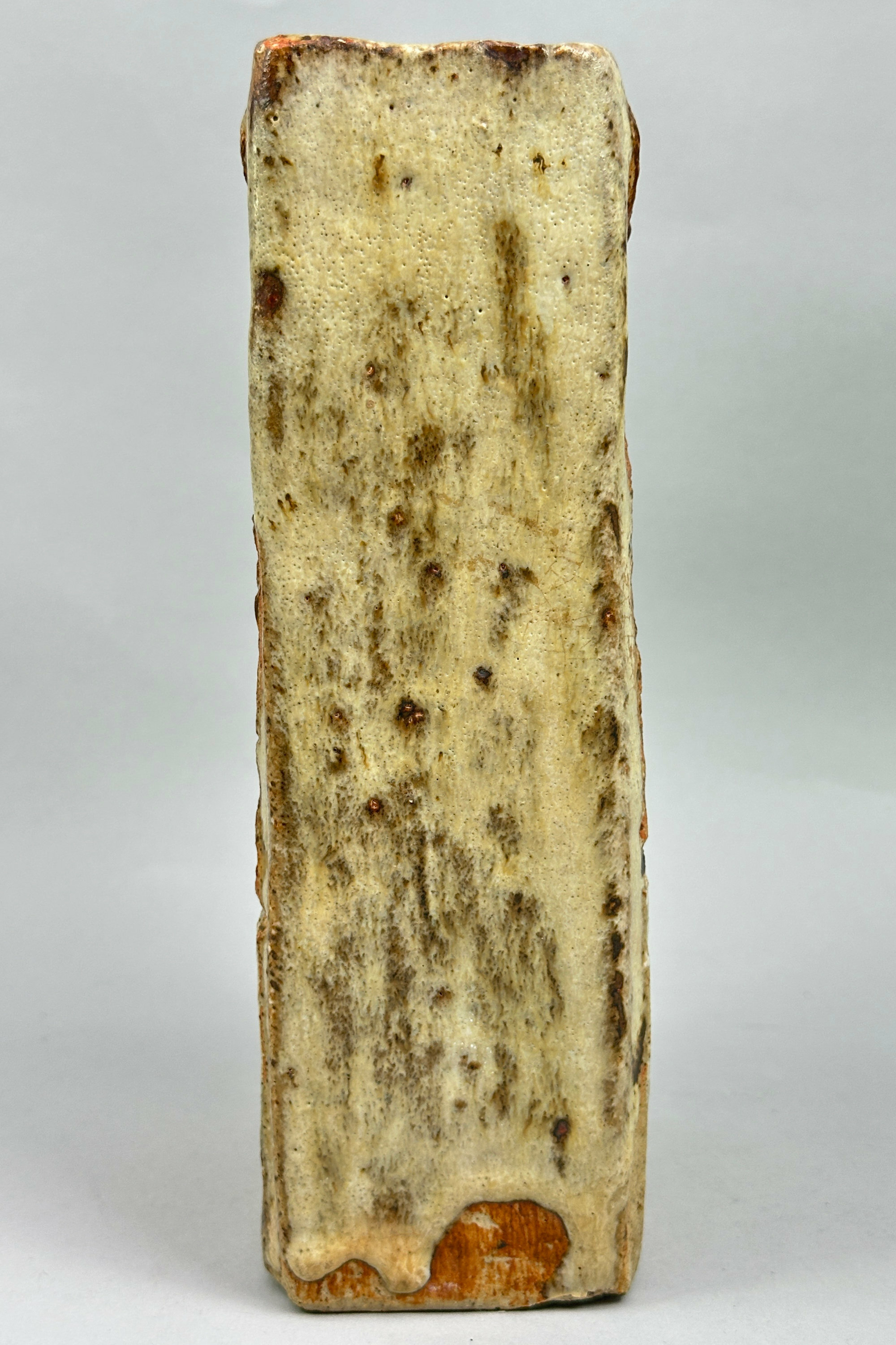 A slab form ceramic vase, rectangular with a slightly countersunk base, the thickly potted walls decorated to the front and reverse with abstract incised designs, a hemisphere, circles and the neck of a vase, the sandy glaze in tones of buff and brown, the sides plain and the base unglazed with a scratched mark ‘W’ to the centre.This is a classic example of the early work of the distinguished British studio potter Alan Wallwork whose pieces now appear in many collections and galleries (see images 15,16). Born in Watford, Hertfordshire, in 1931, Wallwork’s training included a one year spell at Goldsmith’s after which he taught in local schools and then opened his first gallery at Forest Hill in 1958 where he both sold pieces by Lucie Rie and Kenneth Clark, amongst others, and also developed his own work. Eventually finding this too small he moved to a studio in Greenwich where he sold items to Heal’s and the Craft Potters Association, moving yet again to Dorset in 1965 where he continued production for many years. After an illness in the late 1990s, Wallwork opened yet another studio in France in 2004 where he continued to pot but with a rather reduced output. In his last years, his health unfortunately declined and he died in Dorset in 2019.