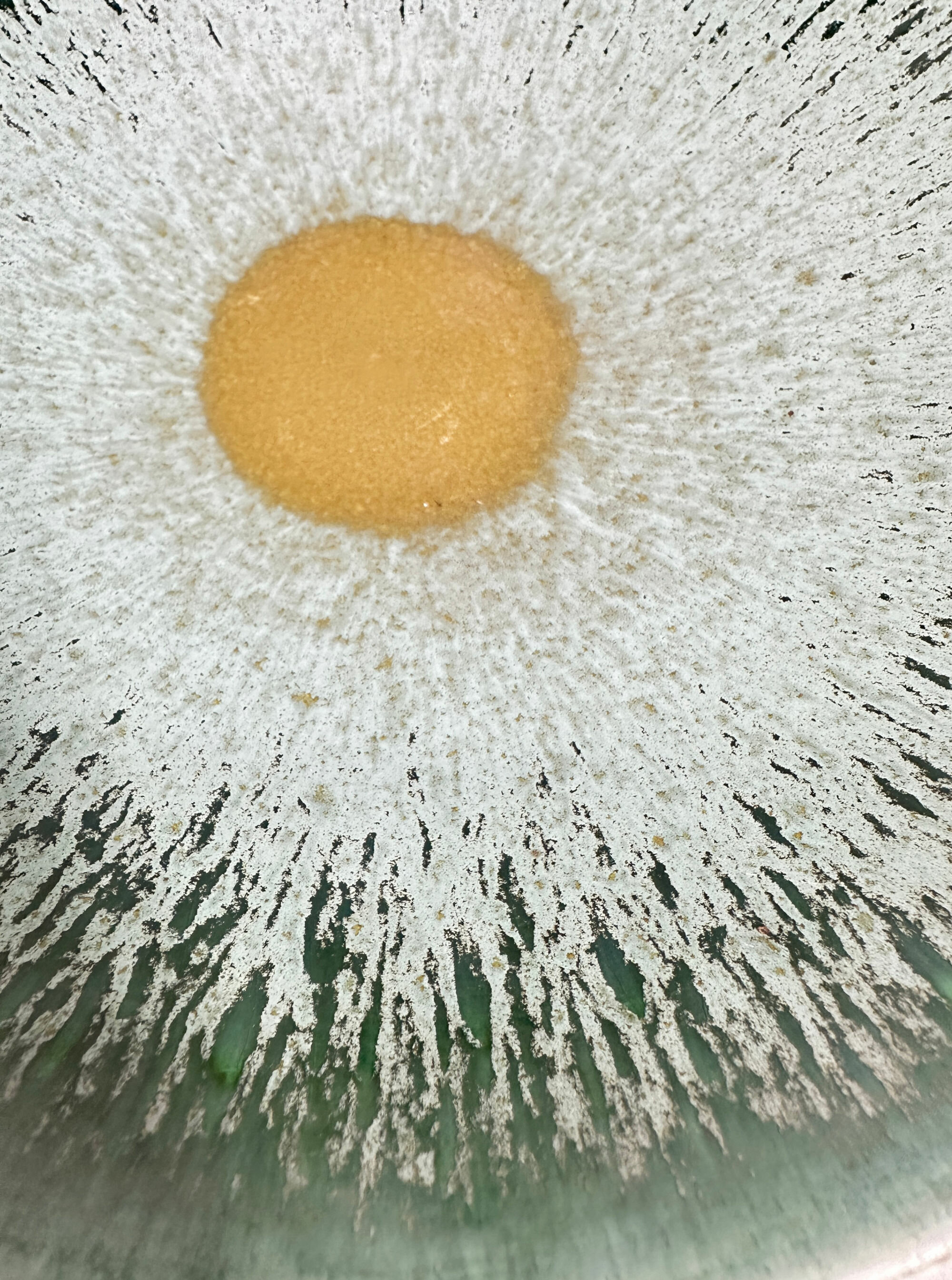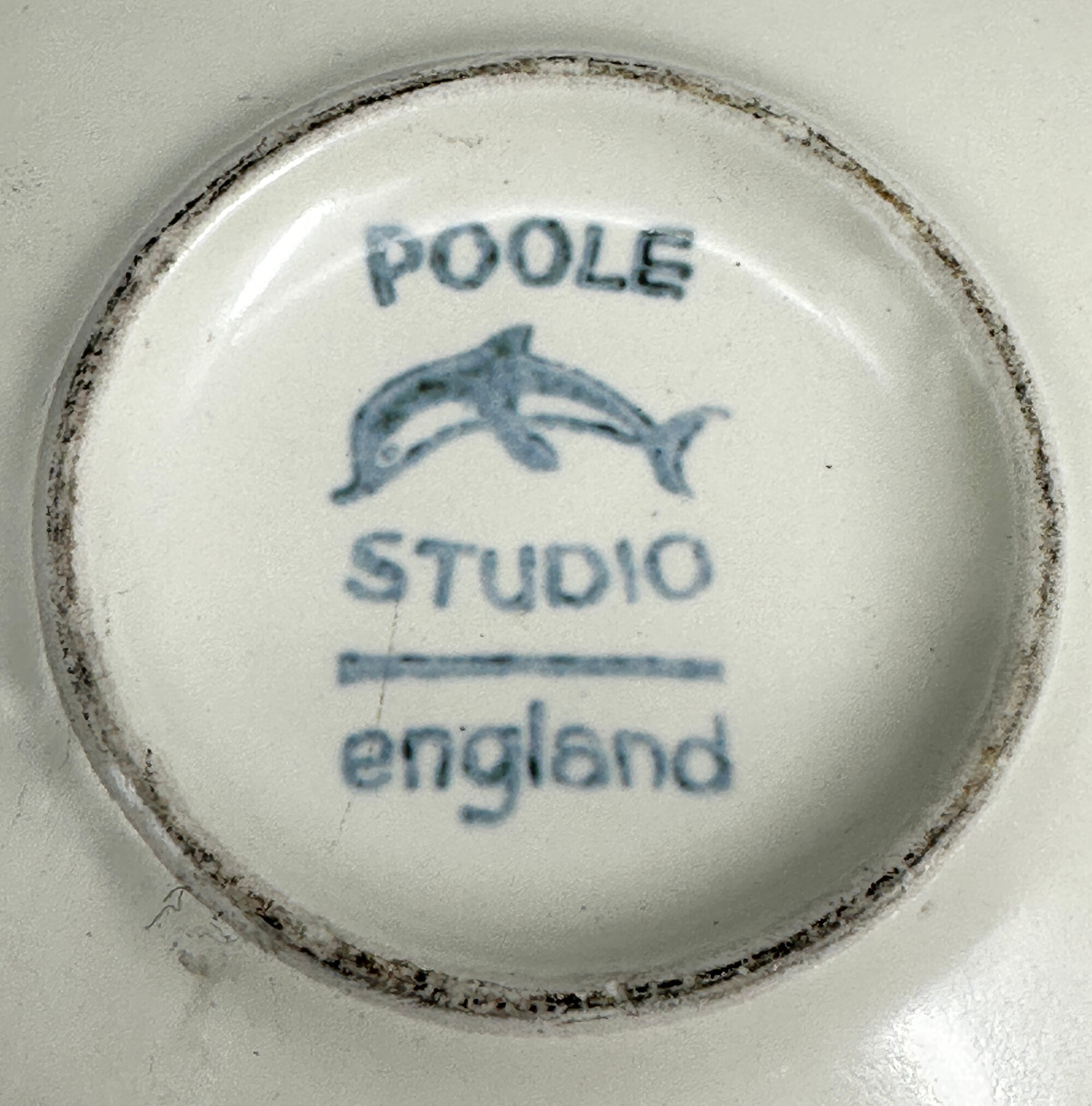 A shallow bowl of flattened near inverted conical form, the surface decorated with light green splash glazes on dark green splash glaze ground surrounding a central speckled gilt glaze disc, the reverse plain with a dark cream glaze and underglaze blue marks to the centre of the foot ‘POOLE’ ‘STUDIO’ ‘england’ separated by a dolphin and a line respectively.Both the form and some of the glaze effects here reflect much earlier Chinese ceramic pieces which is fully consistent with the ‘studio pottery’ style of this piece. Poole Pottery established an art pottery studio within their factory in 1958 which, following the Scandinavian model, produced high quality studio ceramics alongside designs for new ranges until 1966 when they were replaced by the new Delphis, Atlantis and Aegean pottery lines which began production a year later. Dating here is therefore fairly precise and this bowl is an excellent example of ‘studio’ wares produced which could often equal the work of other independent studio potteries.