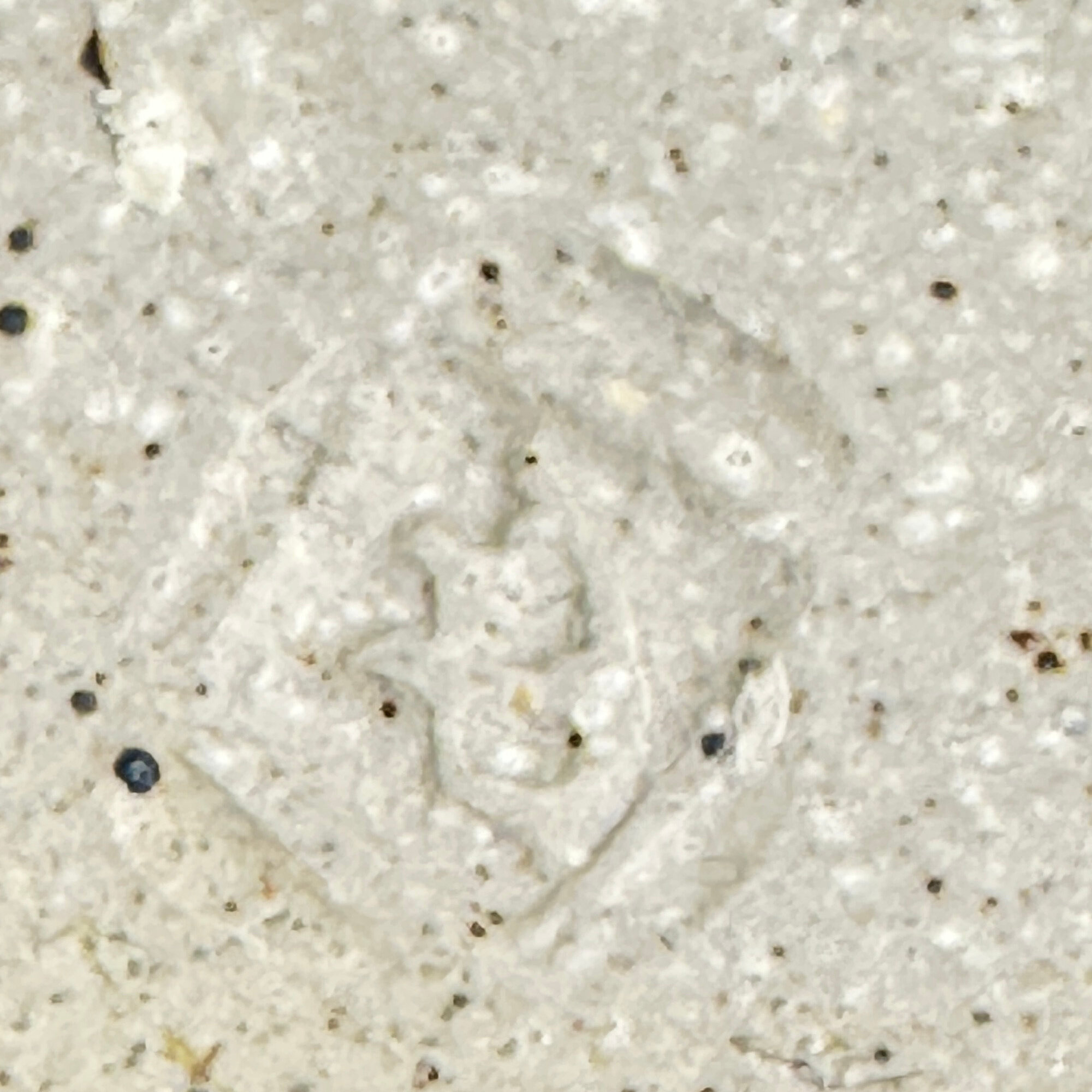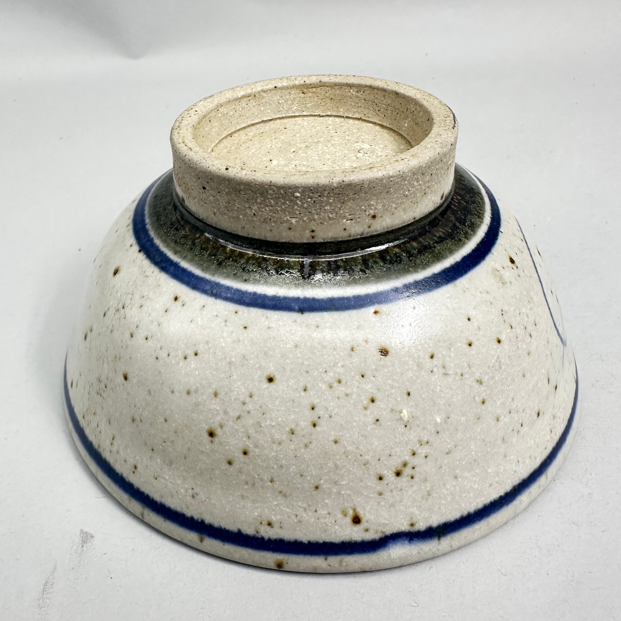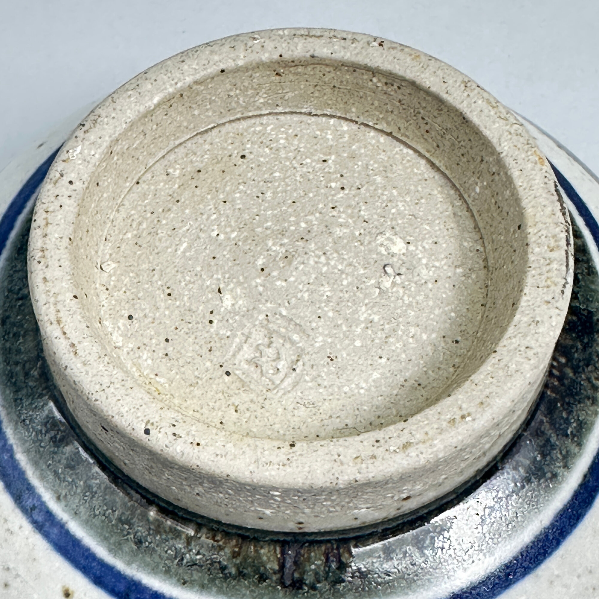 This is an elegant studio pottery bowl, the deep incurving sides above a short cylindrical foot, covered overall in an off white speckled glaze with decoration in blue, dark ‘copper’ red and grey, the exterior with leaves and berries sprouting from a branch and blue circles with a grey border, the interior with in blue, the interior with two blue circles, two berries and a grey roundel at the centre, the base with a small impressed mark.While it is not absolutely certain the mark on this piece is possibly that of Derek Clarkson (1928-2013). Clarkson trained at the Manchester college of Art between 1944-47 and Burnley School of Art from 1959-61 and then combined a successful lecturing career with the making of his own work which is now to be found in international and private collections including the Victoria and Albert Museum, London. In 1980 he retired from lecturing to focus on his work as a potter, continuing to produce pieces of great skill and attraction until his death in 2013. There are other pieces signed by him which strongly resemble the bowl here (see images 8,9) making it a possibility that this is his work. Certainly, the potter who created this piece and impressed his mark at the bottom was clearly accomplished and this bowl is more than worthy to stand comparison with pieces by more famous contemporaries.