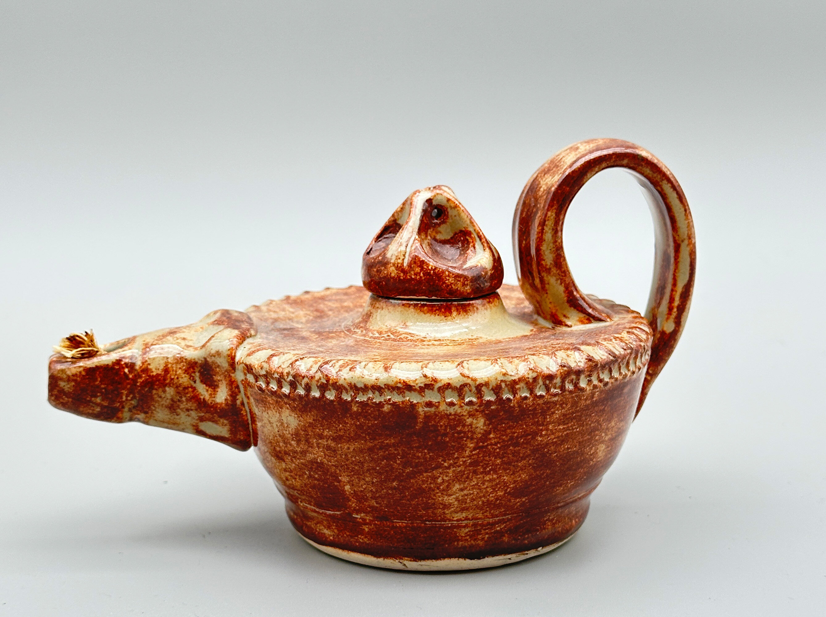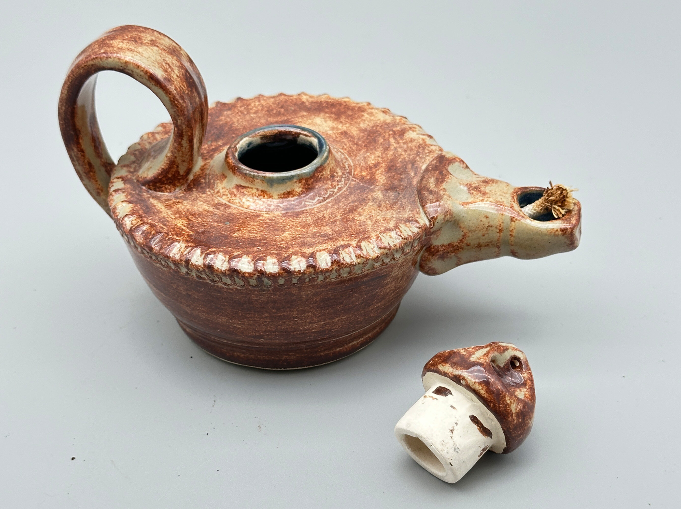 A studio pottery oil lamp of archaistic form, the low, flat circular body narrowing towards the base with an elongated spout of lobed square section containing the wick, a loop handle and a lid of lobed square pyramid form complementing the spout, glazed overall in brown wash colourings with an impressed band of geometric pattern to the top of the body, the base unglazed and with a flowing cipher mark in impressed black glaze ‘MP’ with the date 2012.| Size: | Ht (max) 9cm, Ht (to top of knob) 8cm, Width (max) 14.5cm, Diam 10cm, Base 7cm |