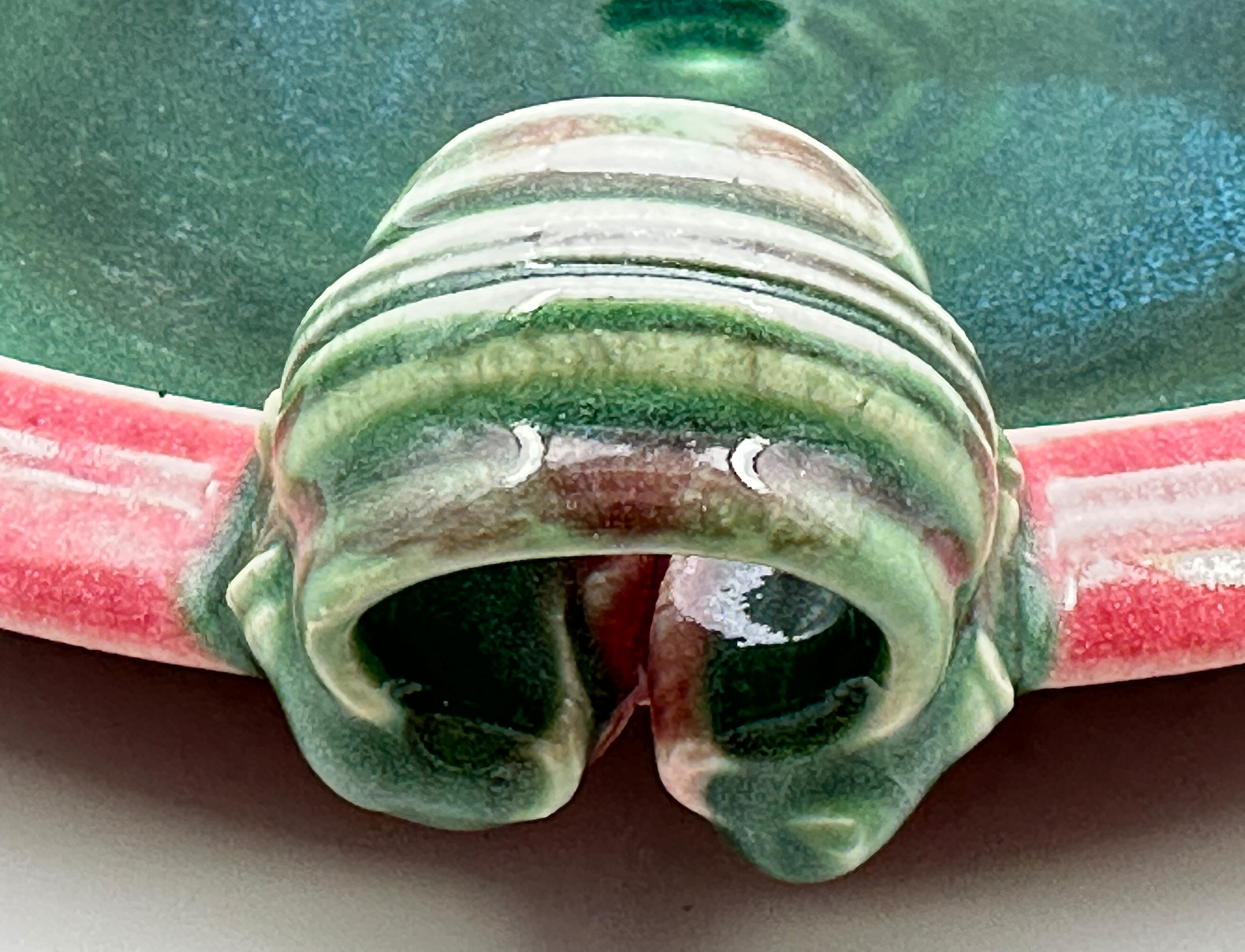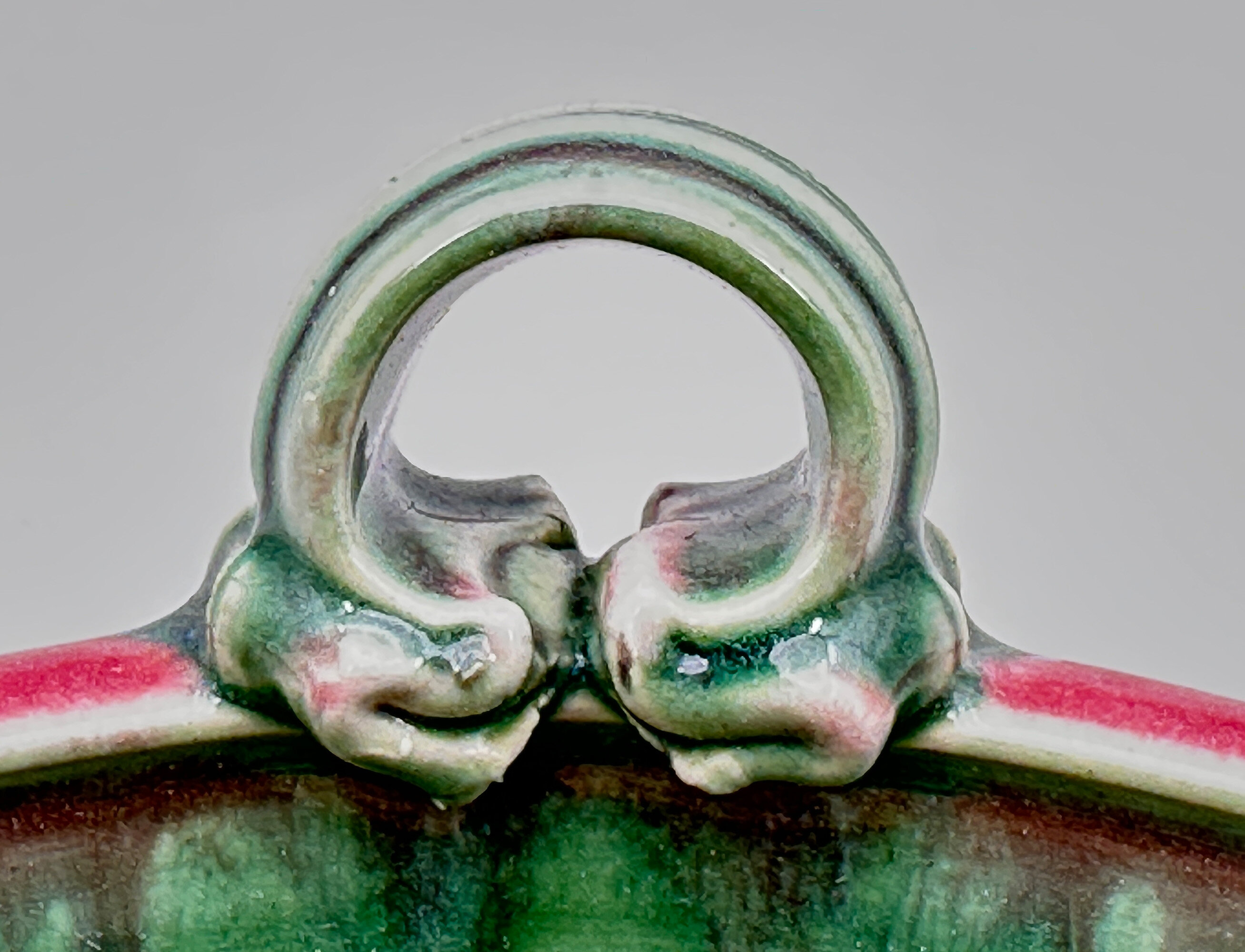 An attractive shallow bowl with sharply incurving walls fitted with two elaborate loop handles on each side, the exterior glazed in deep pink and the interior and handles in shades of green the base unglazed with wavy combed lines and an impressed mark ‘MJ’. The form of this bowl appears to be French, but its maker cannot as yet be identified. It is, though, a striking piece in itself and while probably of fairly recent date looks back to earlier Art Deco designs.| Size: | Ht (max) 6.5cm, Diam (top) 28cm, Width (max) 31cm, Base 18cm |