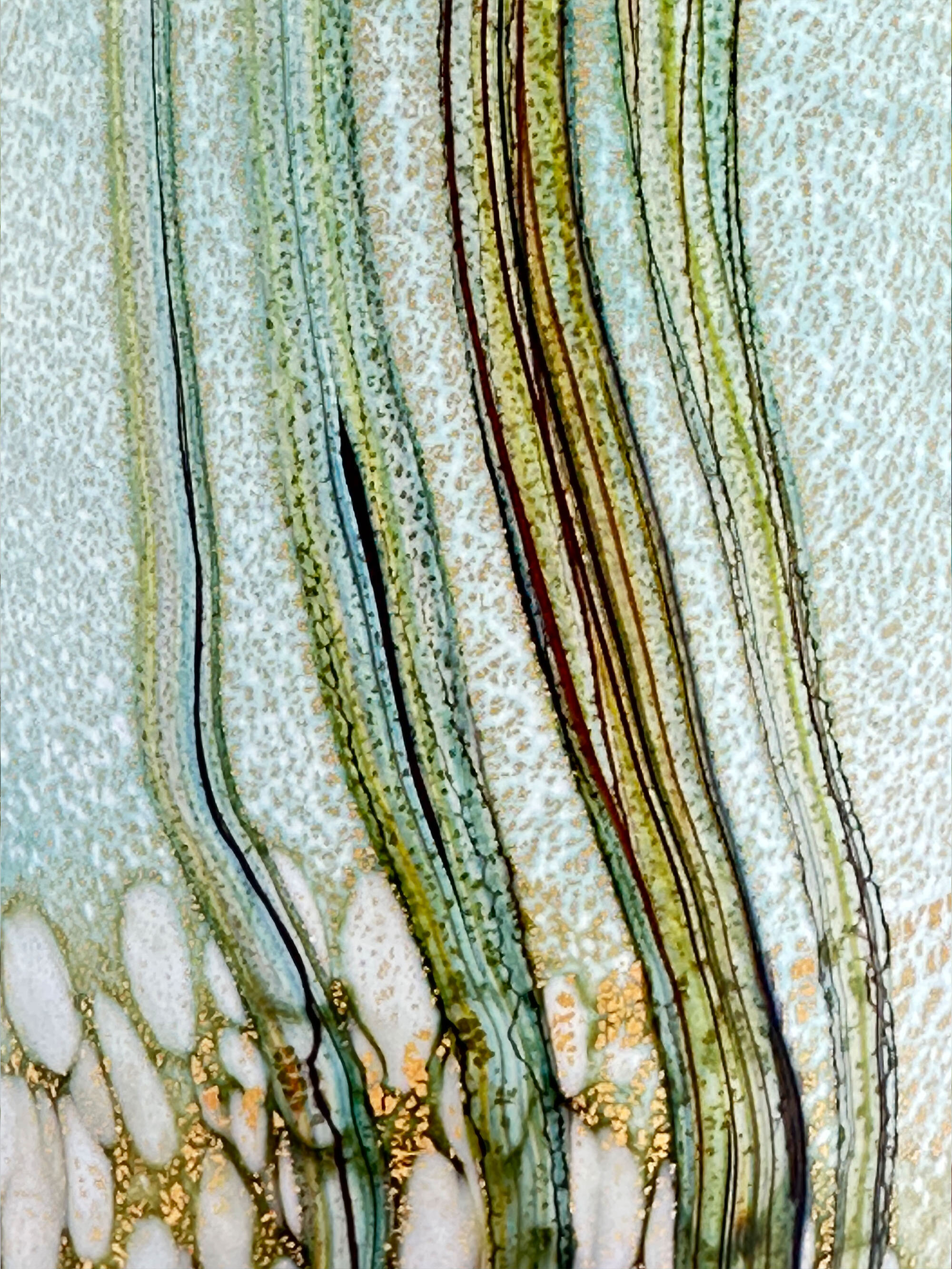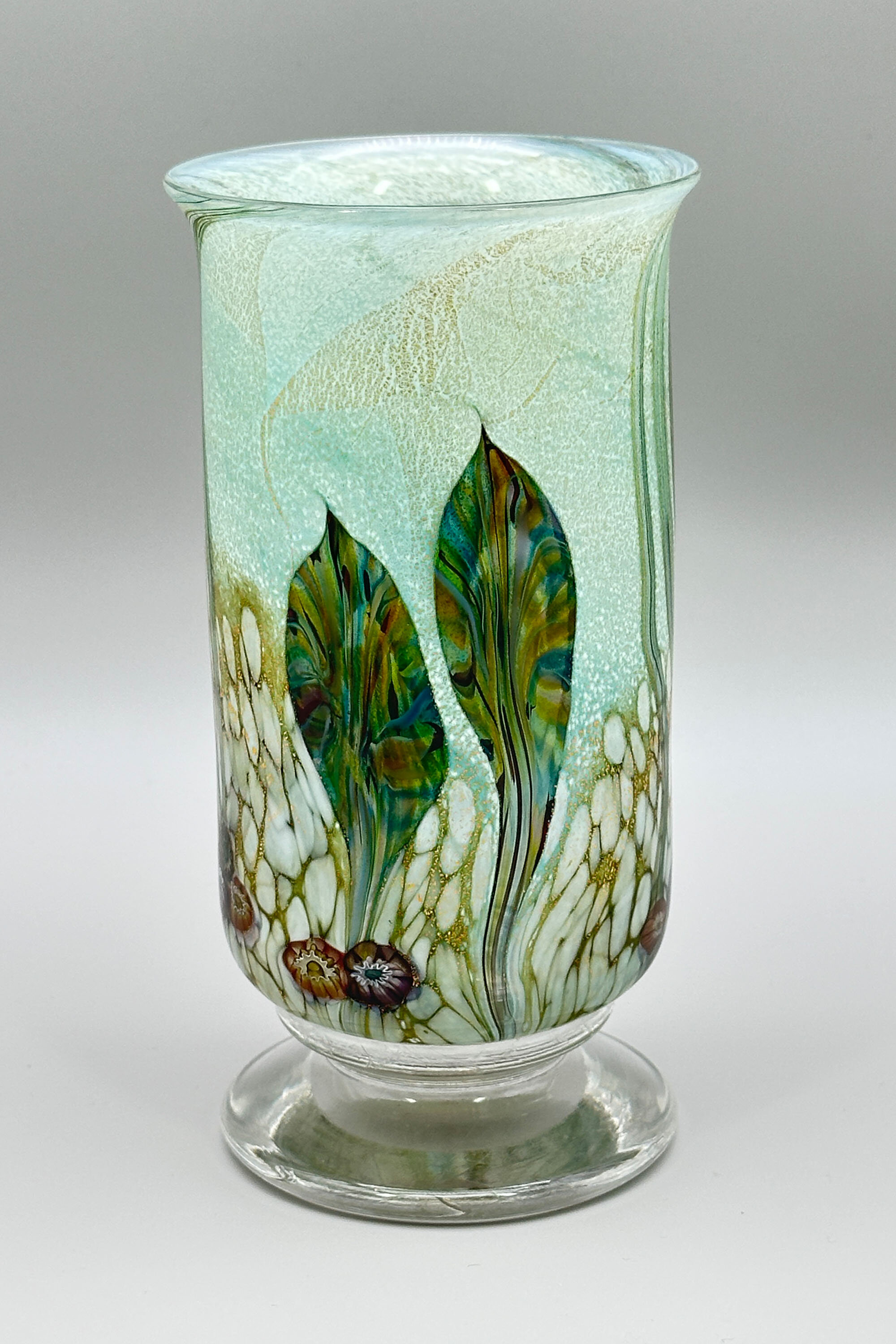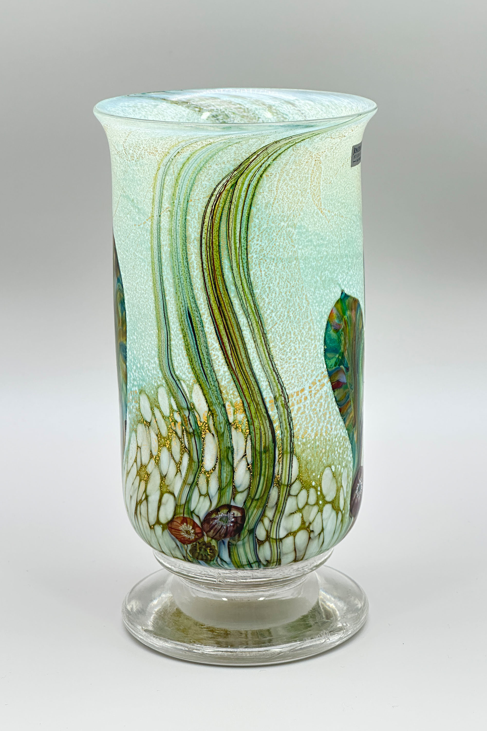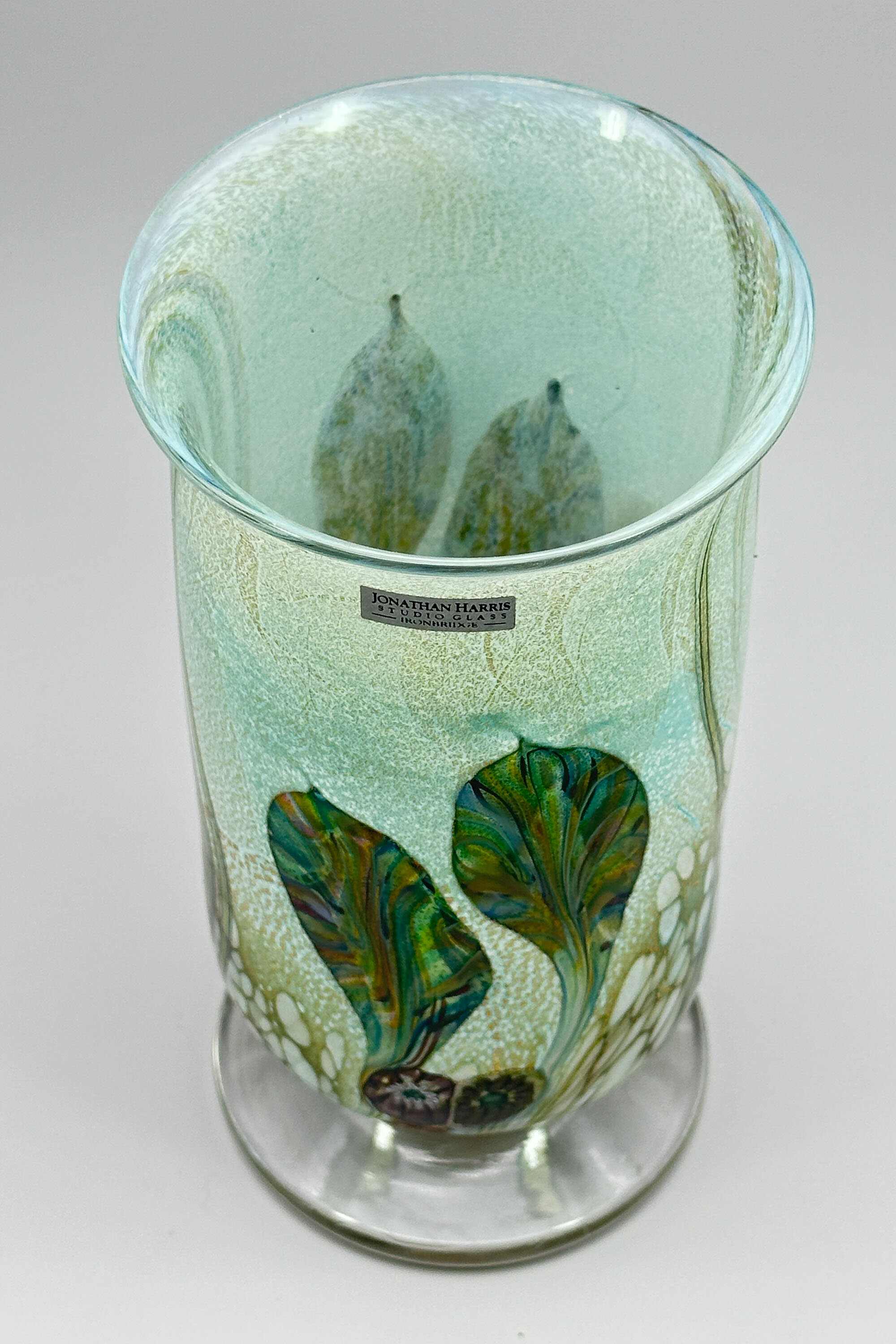 An art glass vase of upright beaker form curving inwards towards the spreading foot and outwards towards the top rim, the pale green ground intricately decorated using cameo techniques and gilt metal flakes with a design of lily leaves and reads issuing from a stylised rocky base, the ground speckled to resemble water. The base carries an etched signature for the artist ‘Jonathan Harris’ ‘Stourbridge’ ‘England’ ‘2006’ and there is also a label for the studio ‘Jonathan Harris’ ‘Studio Glass’ ‘Ironbridge’.Born in 1965 Jonathan Harris (see image 13) is one of the sons of the famous glassmaker Michael Harris who founded Mdina glass in 1968 and then Isle of Wight Glass in 1972. Jonathan worked with his Father in the Isle of Wight studio and is said, with his Father’s help, to have blown a glass fish, aged eight. After studying glass at Stourbridge college and a long spell at Isle of Wight Glass, where he became managing director 1992, Jonathan and his wife Alison set up their own studio in the Ironbridge Gorge, Shropshire in 2000 being given permission to establish their own premises within the Coalport China Museum complex.
