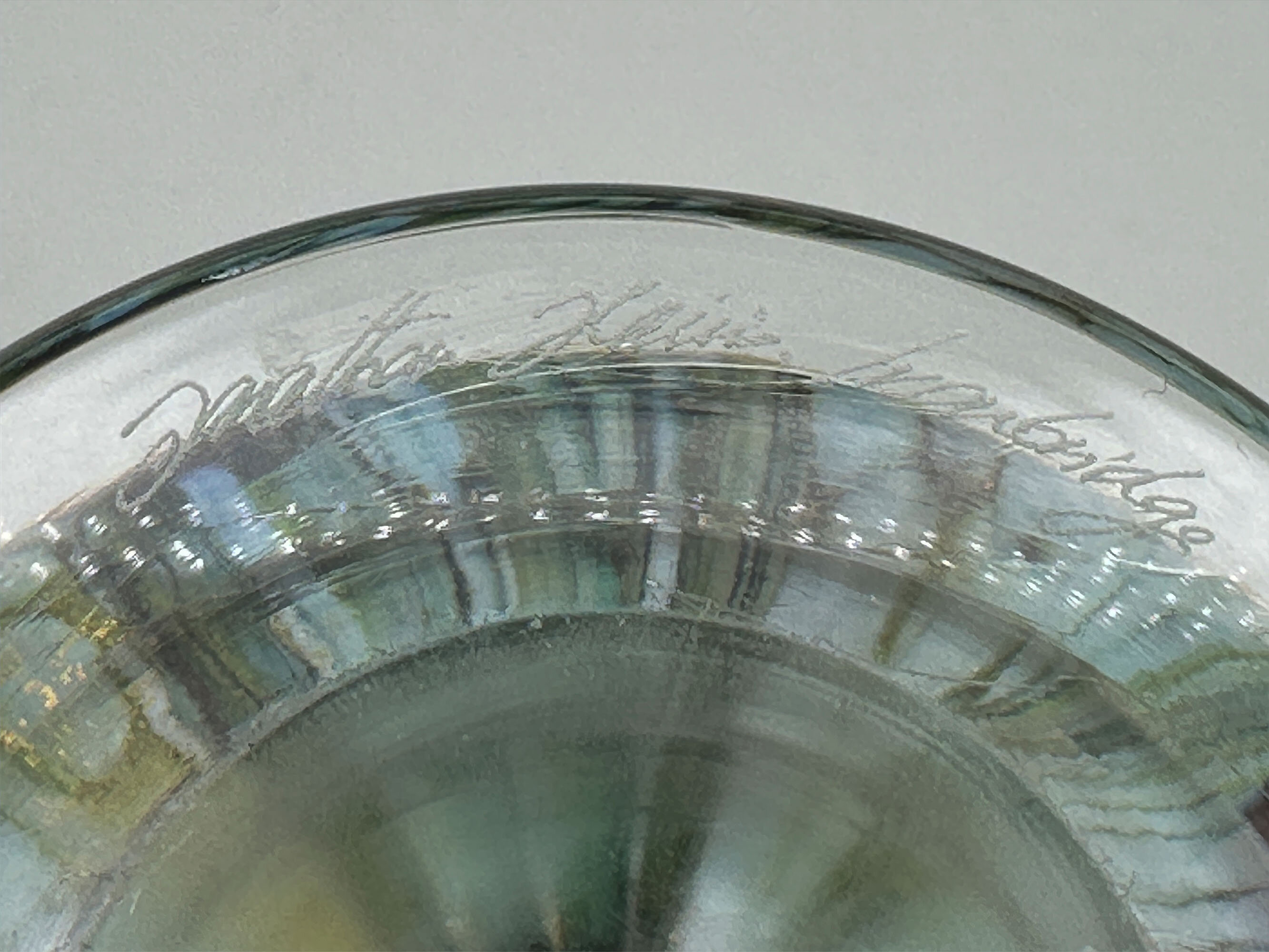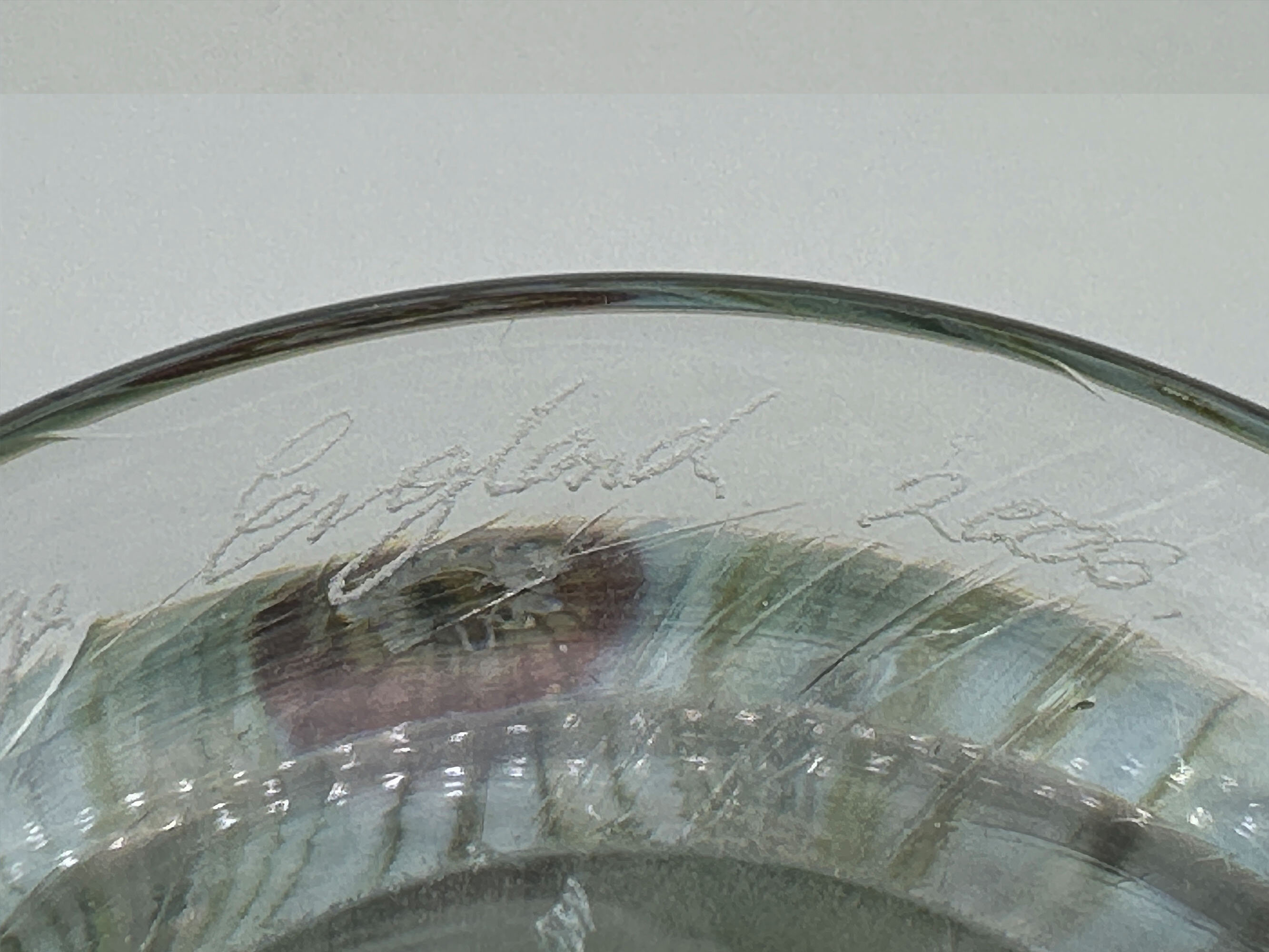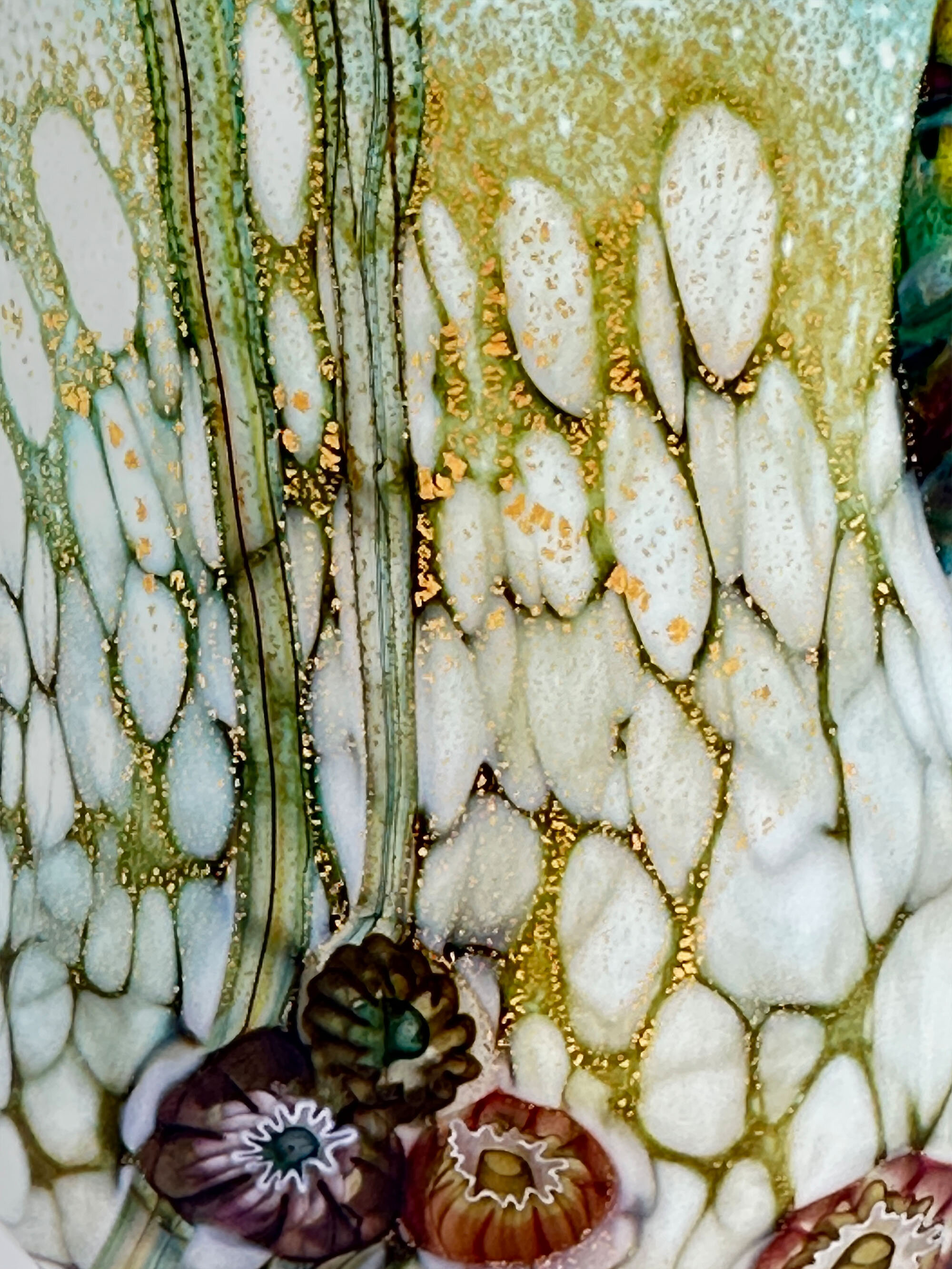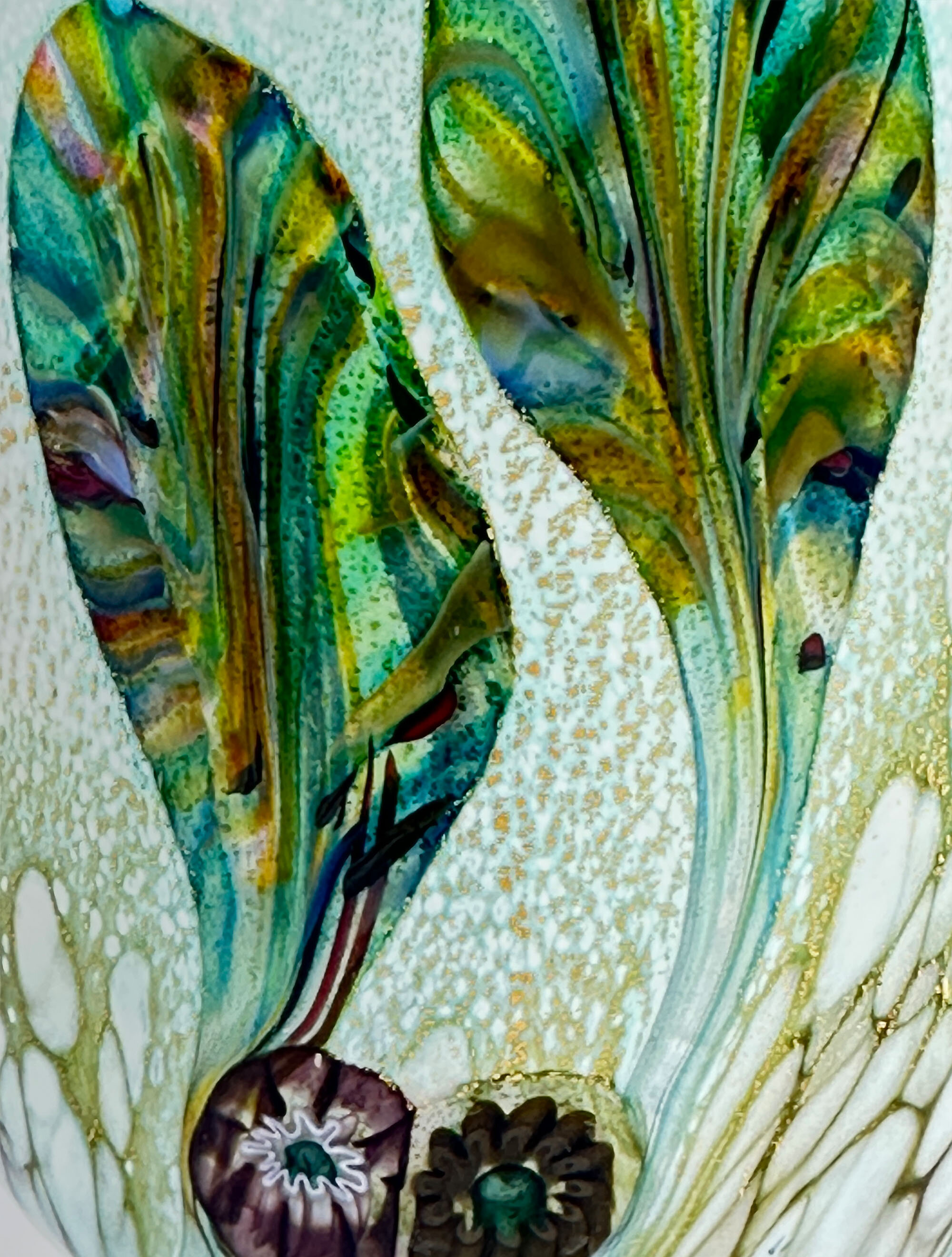 The aim of the studio was to assemble a highly talented team of glassmakers to develop complex and intricate glass making techniques drawing inspiration from such designers as Galle and Tiffany but also, like his Father, from the natural world. A wide variety of influences can be seen including Gothic, Art Nouveau and Art Deco. It is perhaps the second of these which is most closely seen here and the technique is one resembling cameo glass where the surface of the glass is skilfully carved by hand through layers of enamel colours, 24ct gold & sterling silver leaf to reveal an intricate design in outstanding detail. All the art glass pieces are unique and all hand signed by Jonathan Harris himself making this vase an impressive example of his studio’s output.