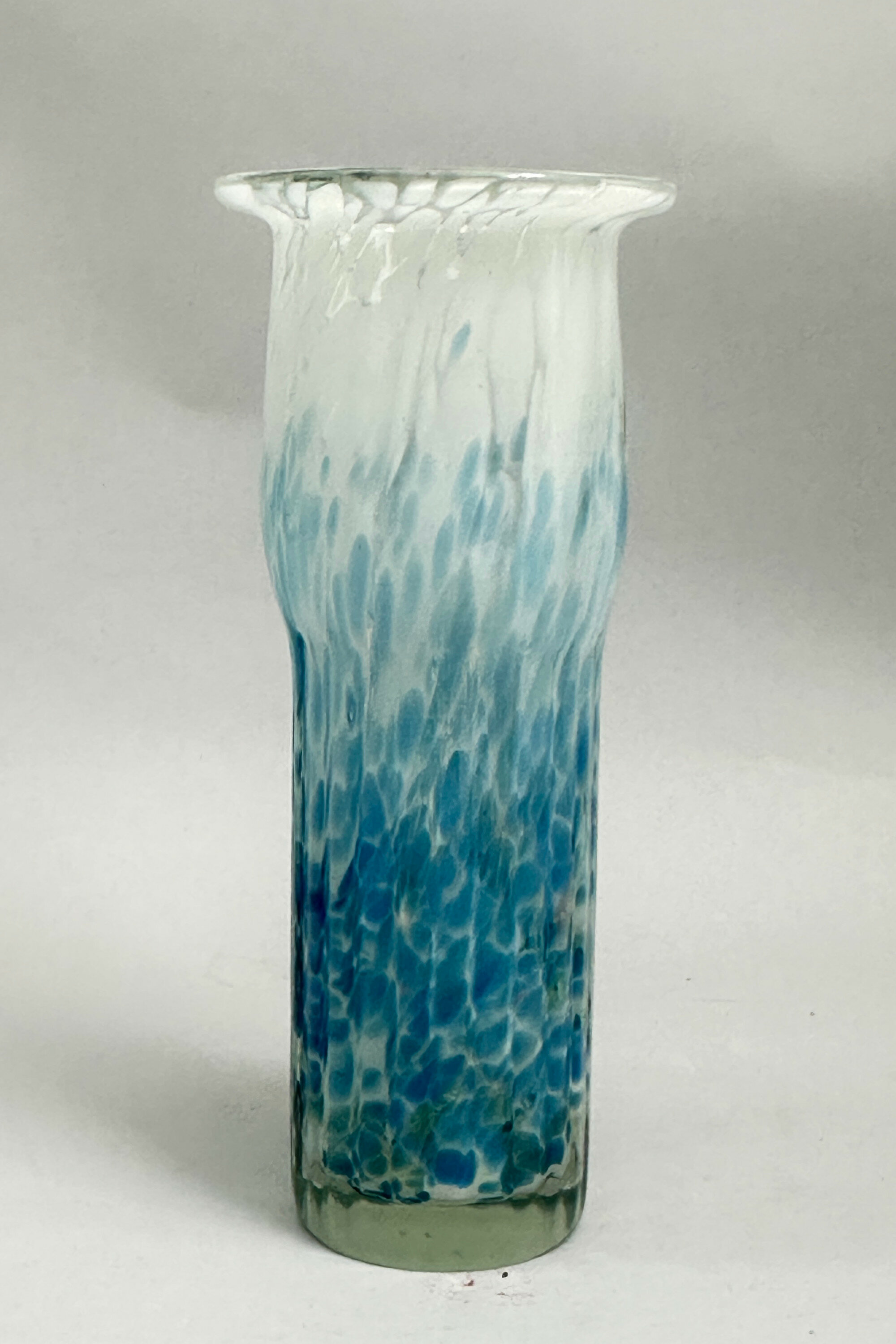 A glass vase of fluted cylindrical form slightly swelling towards the top and with an everted rim, the base flat, decorated with a ‘bubble’ design in clear and blue colours, the pattern more elongated towards the top. Both the form and decoration here can be found in other pieces which were made by the Mtarfa glassworks in Malta. Founded in 1979 by Paul Said, the brother of Joseph Said who was at the time the owner of Mdina Glass, the studio produced pieces which were similar in both form and decoration to those made by its more famous rival. Indeed, both brothers were originally trained by Michael Harris, the founder of Mdina Glass, where they both worked. As with the Mdina pieces the glassmakers at Mtarfa took their inspiration from the colourings of the sea and landscape of the Mediterranean which surrounded them. It is perhaps not fanciful to see here bubbles in water. Some of the Mtarfa pieces survive with their original labels which allows the identification of others as here. This vase was probably made in the 1980s and before the rebranding of the firm as ‘Valletta Glass’.| Size: | H 17 cm Diameter 7.5 cm |