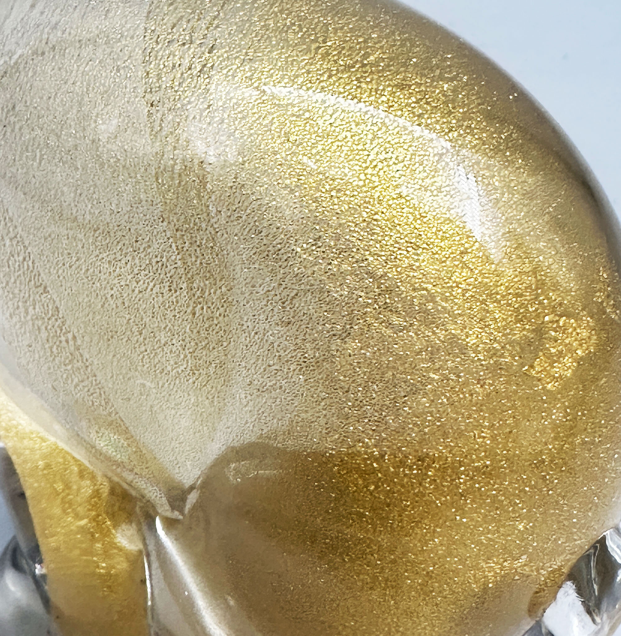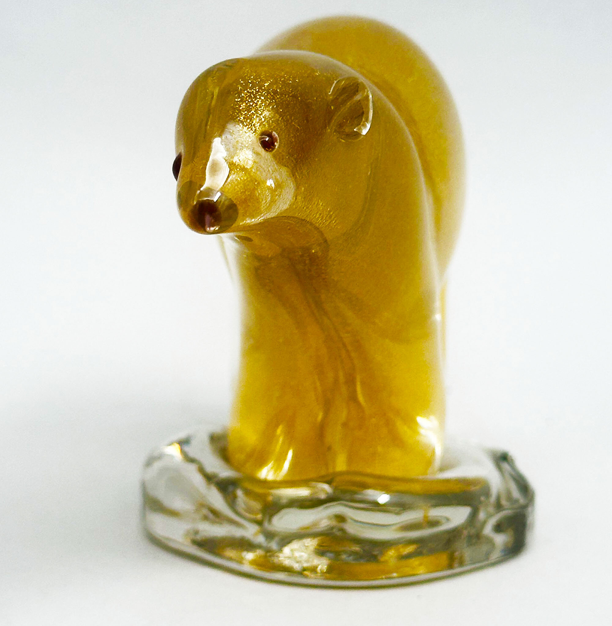A glass model of a polar bear modelled in semi abstract form standing leaning forwards on an irregular circular base, the body with gilt flecks and ‘sommerso’ effects at the head and tail, the details of the face picked out with modelled ears. This charming figure and others like it in a different colour wave was made in one of the glassworks at Murano, Italy. The design is usually held to be by Alfredo Barbini (1912-2007), one of Murano's leading artists in the twentieth century (see image 8). Born into a family with a long tradition in glass making, he worked for various of the Murano firms until forming his own business Vetreria Alfredo Barbini in 1950. His work was distinguished by a love of sculptural form and many of his pieces employ ‘gold leaf’ decoration. Both are seen here in this distinctive and attractive design which probably dates to the 1960s.| Size: | Ht (max) 10.5cm, Width (max) 15.2cm, Depth (max) 7.6cm |