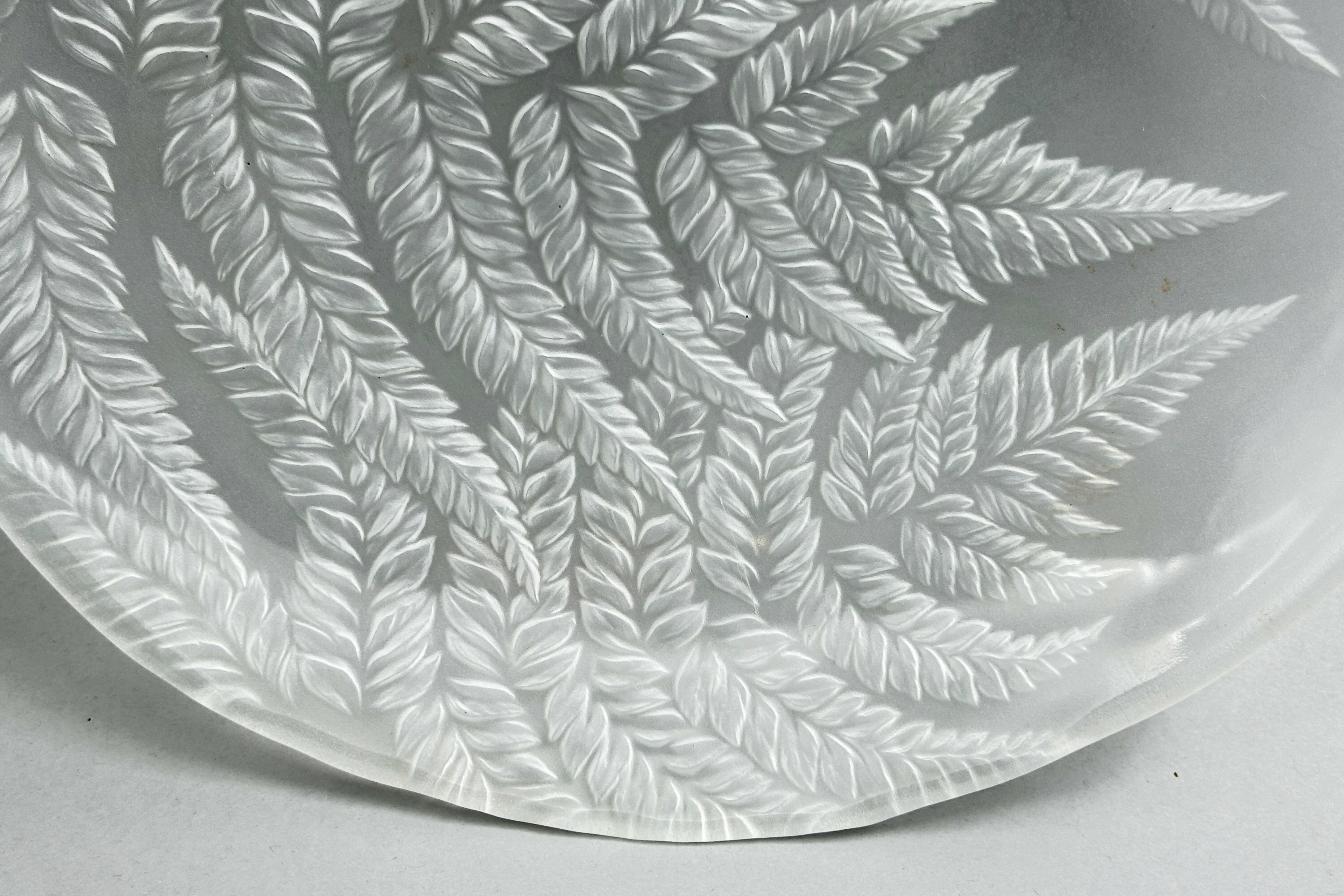 A Scandinavian glass dish of slightly irregular form decorated with sprays of fern and a pseudo Chinese seal mark. The form and technique and style of decoration of this piece resemble closely very similar dishes made in various designs by the well known Swedish firm Kosta Boda. None of these are marked but the designs are distinctive and this is most likely what we have here. These dishes seem to have been table ware and were made in a range of sizes; the dimensions here imply a serving dish. The decoration is formed by the hand pressing of the glass into a mould. The topside is smooth while the underside is modelled with the design. There is a well known series of Kosta dishes comprising a hand made set in the 'Party' pattern and designed by Ann & Goran Warff in 1975. The similarities here imply a similar dating.Kosta Boda, previously known as Kosta Glasbruk, is a Swedish glassmaking company founded by two foreign officers in Charles XII's army, Anders Koskull and Georg Bogislaus Staël von Holstein, in 1742.It is located in Kosta, Sweden. Early production consisted of window glass, chandeliers and drinking glasses. From the 1840s, the factory was at the forefront of new trends and technical developments, producing pressed glass, and in the 1880s setting up a new glass-cutting workshop. In 1903, the company merged with the Reijmyre glassworks but both retained their own names and Kosta went on to maintain its reputation as one of the leading Swedish manufacturers with a range of fine art glass and tableware by distinguished designers such as Vicke Lindstrand, artistic director from 1950-1973.