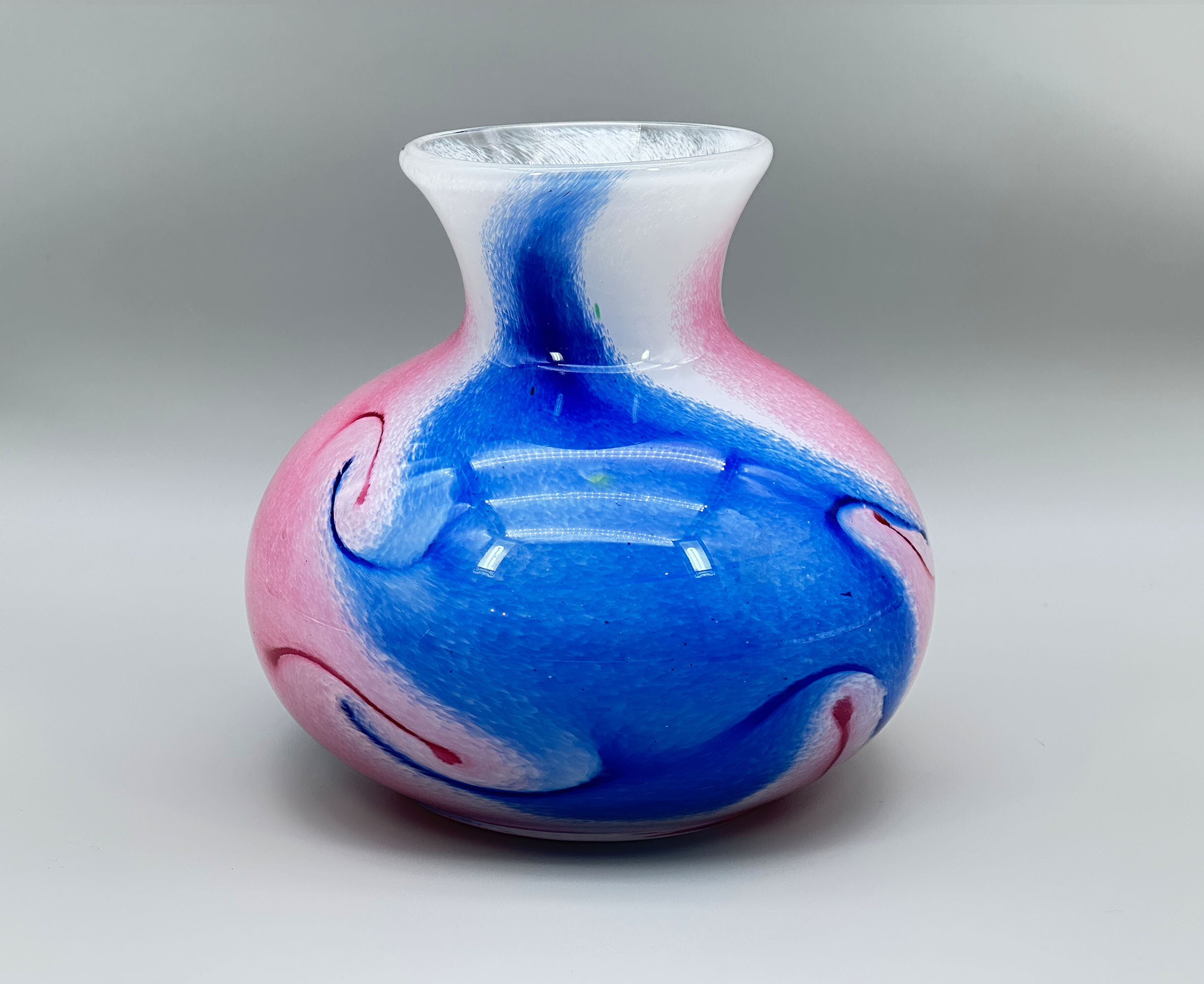 An impressive art glass vase stoutly blown and of compressed globular form, the concave neck rising to a flaring rim, decorated in mottled blues and pinks with a continuous swirl design merging into white at the top, the interior rim with white flecks and the decoration continuing to the base with an irregular circle to the centre, possibly a pontil mark indicating that the piece has been hand blown. There are no direct parallels for this finely made piece but the work seems to be Italian if not, perhaps, from the glassworks at Murano itself. Both the form and decoration indicate a maker of some skill and the vase is extremely heavy which is an additional sign of quality in the manufacture. Dating is probably to the 1960s or 1970s but this highly decorative vase would be a fine accessory for any contemporary interior.| Size: | Ht 17.2cm, Width (max) 17cm, Top diam 9.3cm, Base 10cm |