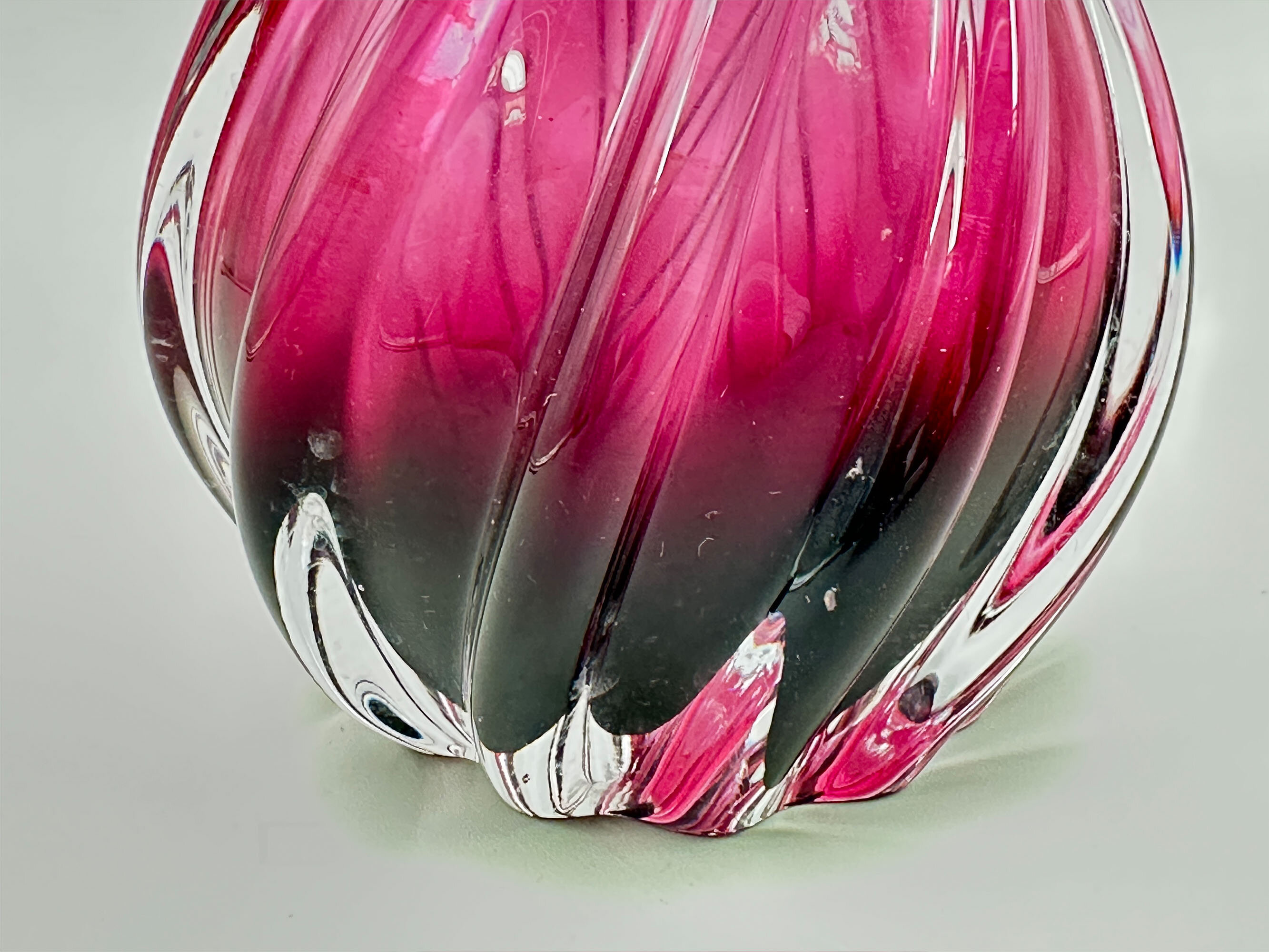 A heavy art glass vase the pear shape body with a wide neck and a flaring rim notched at the top, the cranberry glass twist fluted and with ‘ombré’ or shading effects with the coloured glass blending into clear glass, the base flat.This design is generally attributed to the designer Josef Hospodka (1923-1989) who worked for the Chřibská glassworks in Czechoslovakia from 1950 to 1970 and again from 1985 to 1989. His organic, sculptural blown glass designs enjoyed great popularity and some remained in production after his death until the factory closed in 2007. There are catalogues from the factory and some of the pieces were also illustrated in the Czech Glass Revue where they were directly attributed to Hospodka. There does not appear to be either a catalogue entry for this vase or any mention of it in the journal, but the general style is extremely close to known works by him and the attribution is reasonably safe. Chřibská pieces were distinguished by their vibrant colours, flowing forms, weight and a smooth polished base, all of which are present here making this a fine example of their productions.