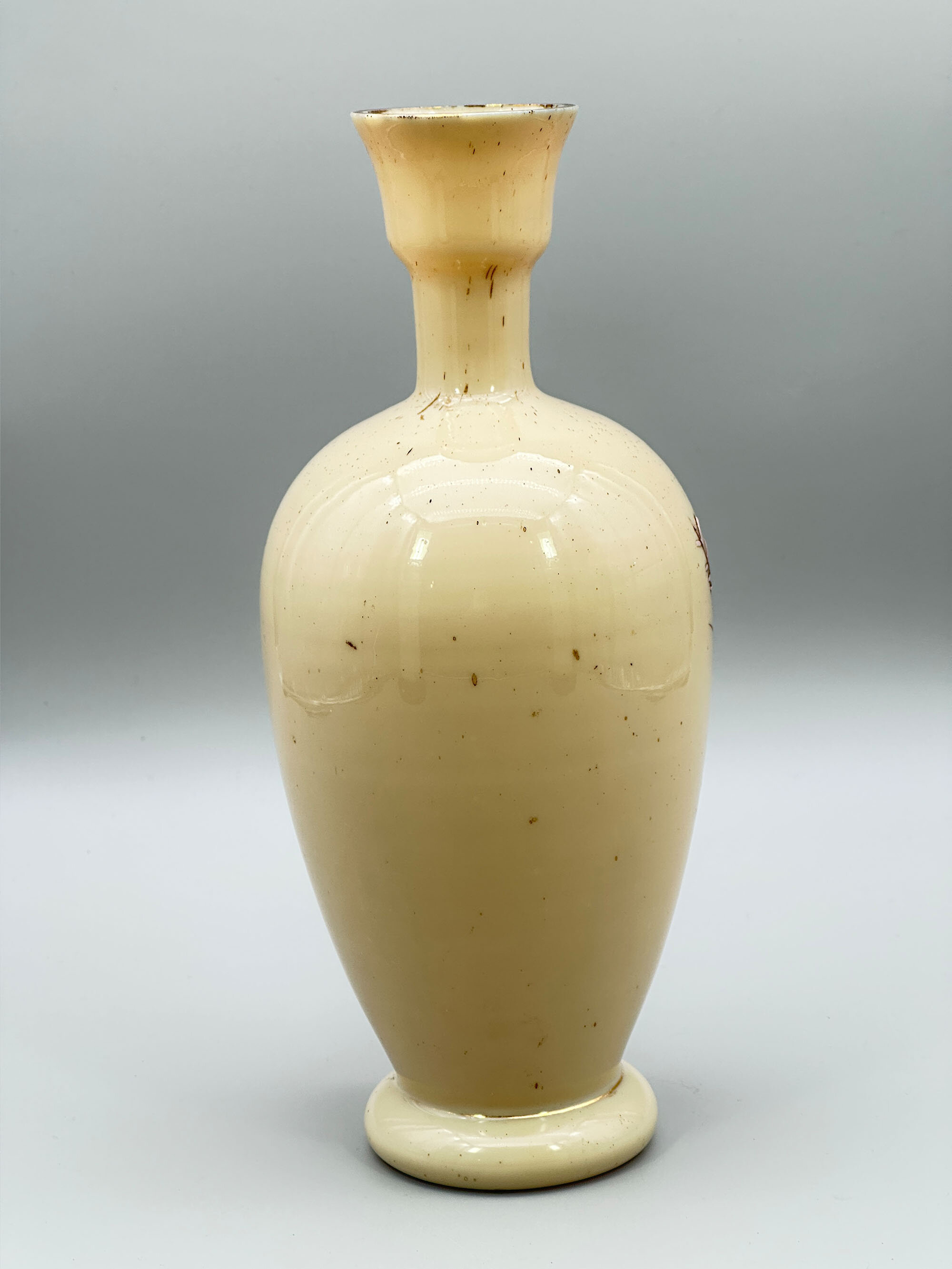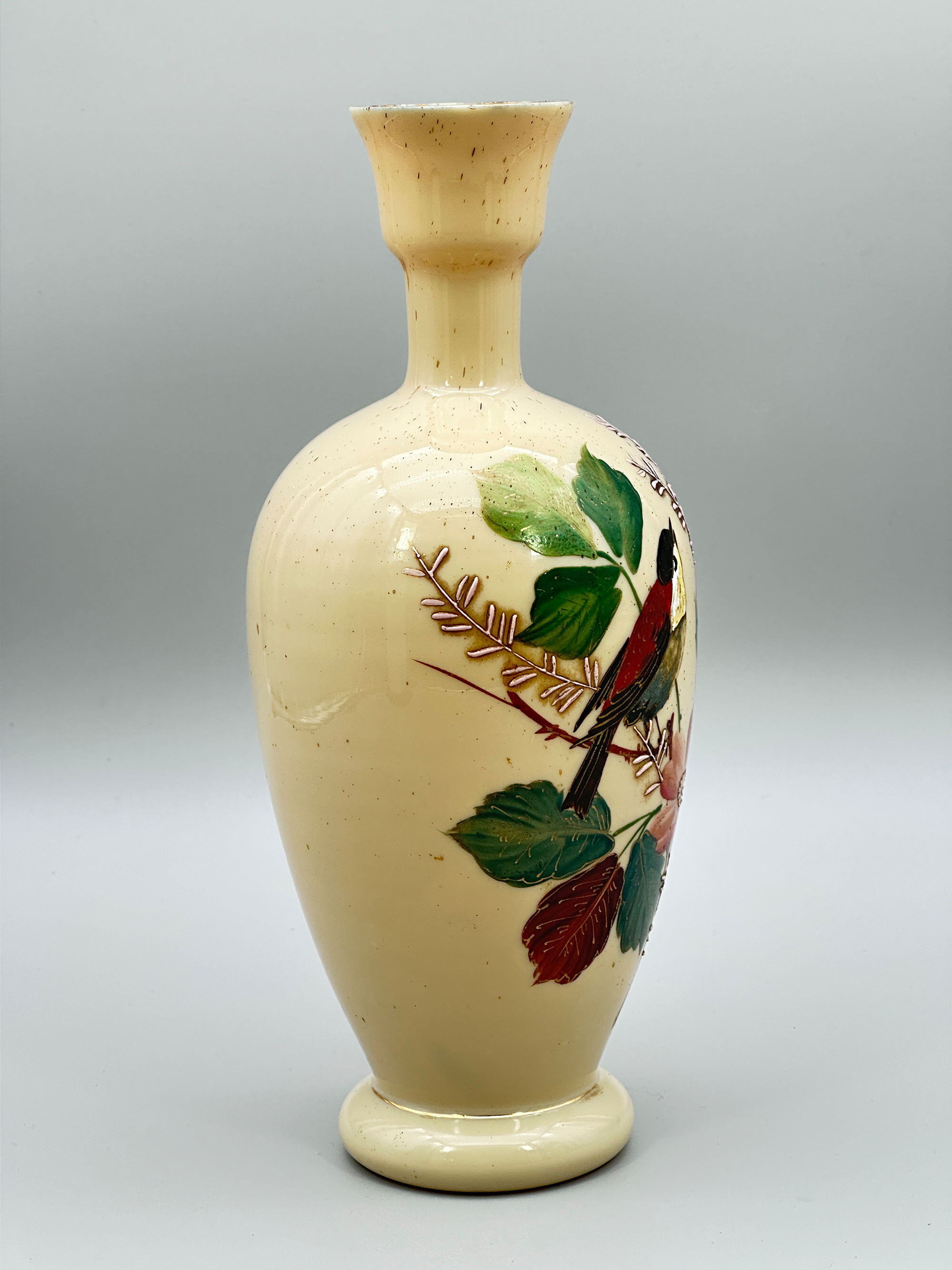 Milk glass, now so called, was developed in Venice in the 16th century as a competitor for porcelain. Opaque and translucent it was made in a wide variety of colours and was later to enjoy great popularity in the late nineteenth and early twentieth centuries when it was produced by various manufacturers in England, Europe and America. The style of decoration here suggests France and the simple design of a bird sitting on a branch with flowers is attractively combined with a slightly sandy cream coloured background. This was most likely one of an original pair designed as mantelpiece ornaments, the slightly Art Nouveau and Japan inspired design suggesting an early twentieth century dating, but its elegance remains today.| Size: | Ht 25.5cm, Width (max) 10cm, Base 7.3cm |