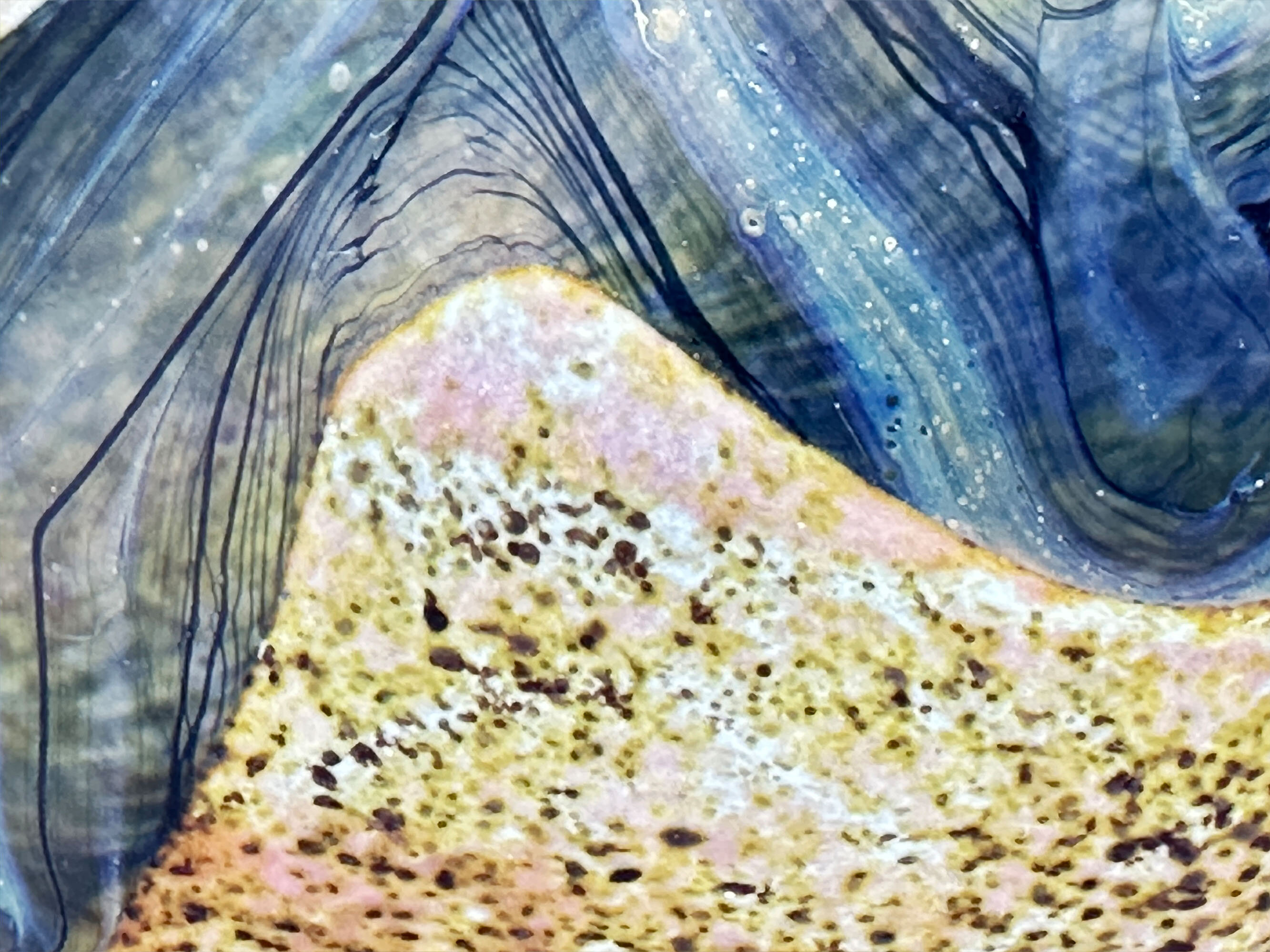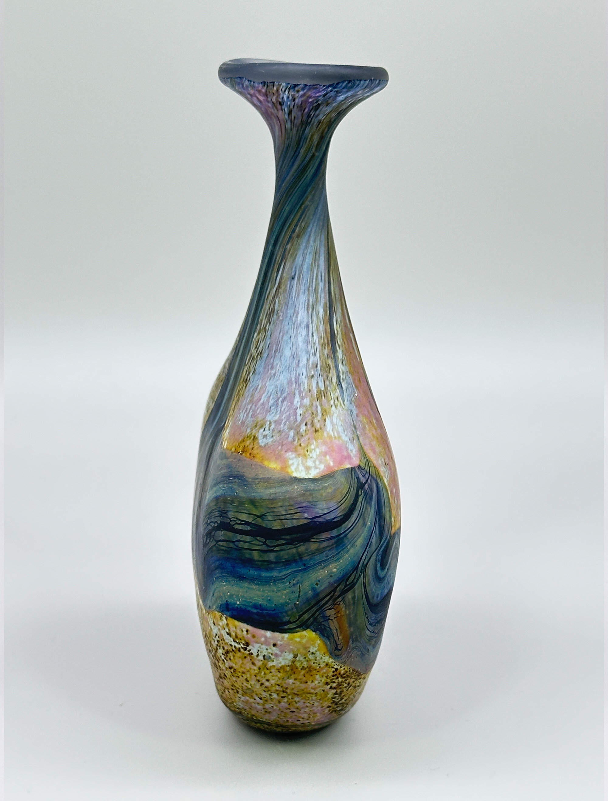 A frosted art glass vase of near ‘lollipop’ form the broad and narrow rounded body with the shoulder curving sharply inwards towards the slender neck which flares outwards to the wavy top rim, the base flat with an etched signature for Peter Layton, the decoration a mixture of abstract and organic segments in tones of blue, brown and mustard with flecking and wave like effects, the whole with a naturalistic ‘feel’.Peter Layton is one of Britain’s most celebrated glass artists. Born in 1936, his initial interest was in ceramics but in 1965, while on a teaching post at the University of Iowa, his focus changed and he began to study the art of glass blowing, at a time when the art glass movement in America had an enthusiastic following. Returning to England in 1968, he started a a small glass studio in the Highlands of Scotland while relying on pottery to earn a living. Eight years later, in 1976, he opened the ‘London Glassblowing’ studio which continues to this day and where Peter Layton, now in his eighties, continues to train and supervise upcoming glass artists as well as producing his own work.