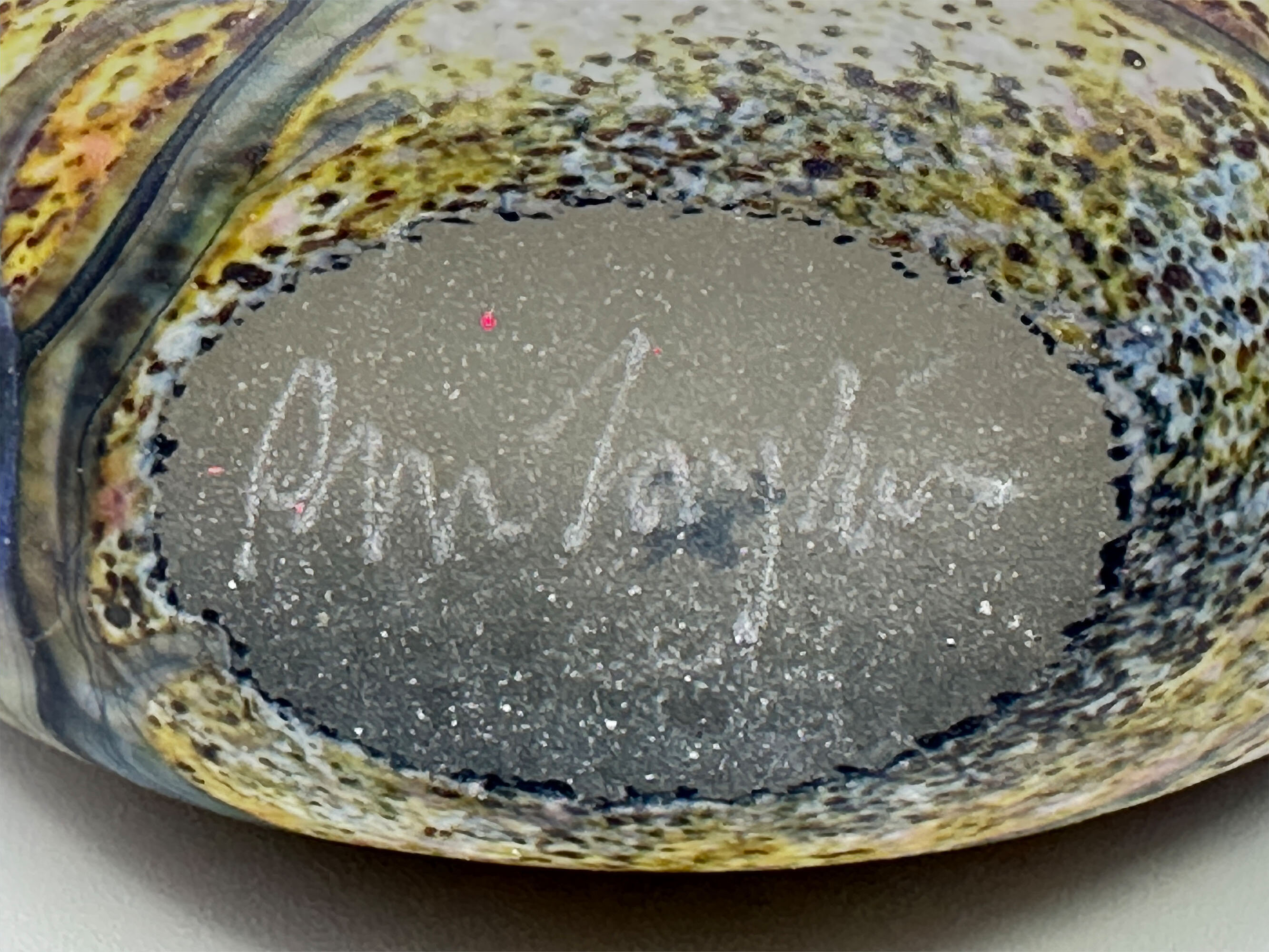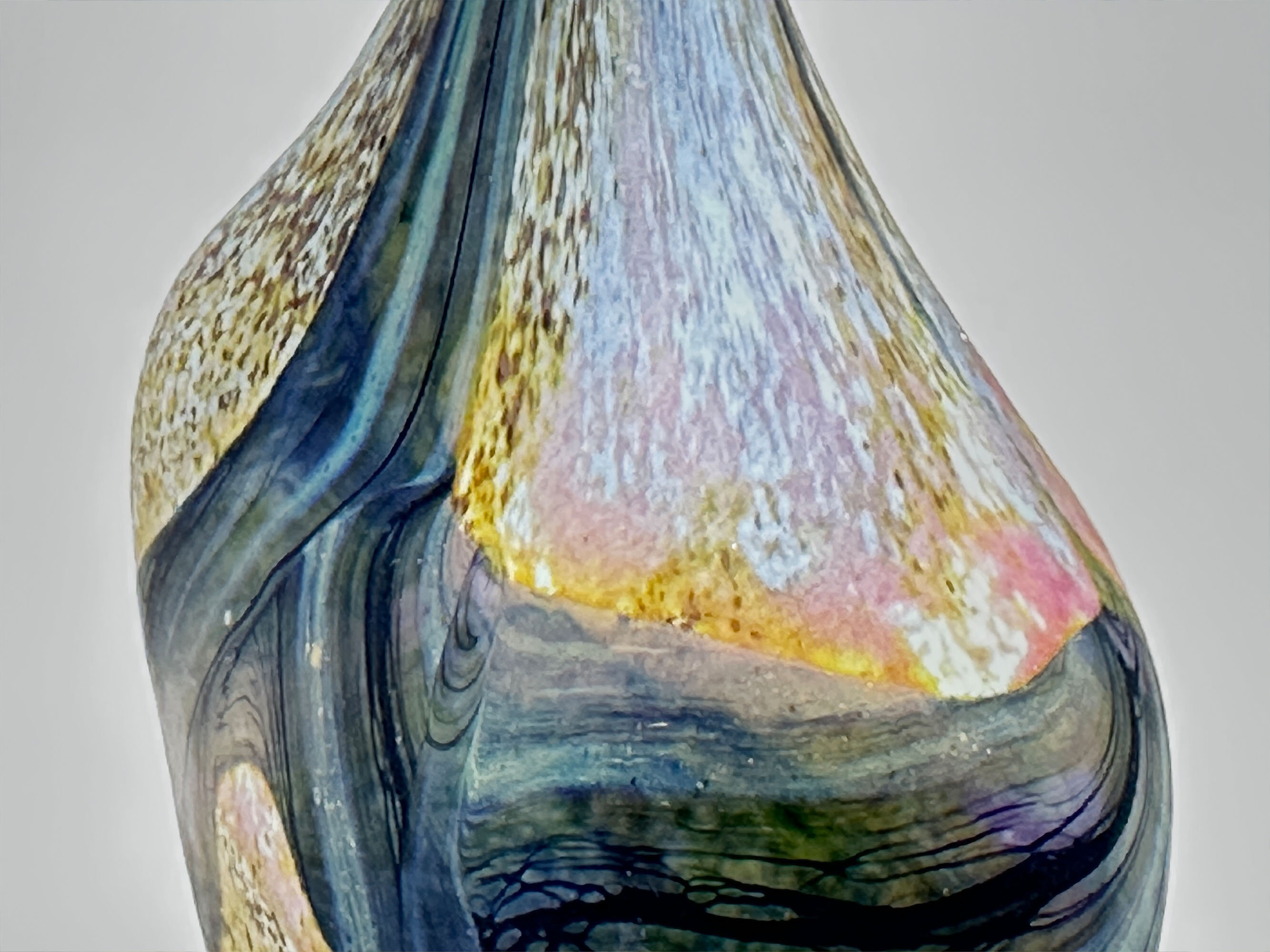 This vase is probably one of his earlier pieces and derives its inspiration from the celebrated glass workshops at Mdina and the Isle of Wight whose productions tended to draw heavily on landscape and nature and some of whose shapes clearly influenced it. There are a few other pieces in a similar form, but the colourings and design here are particularly pleasing making this a highly desirable addition to a collection of British studio glass.