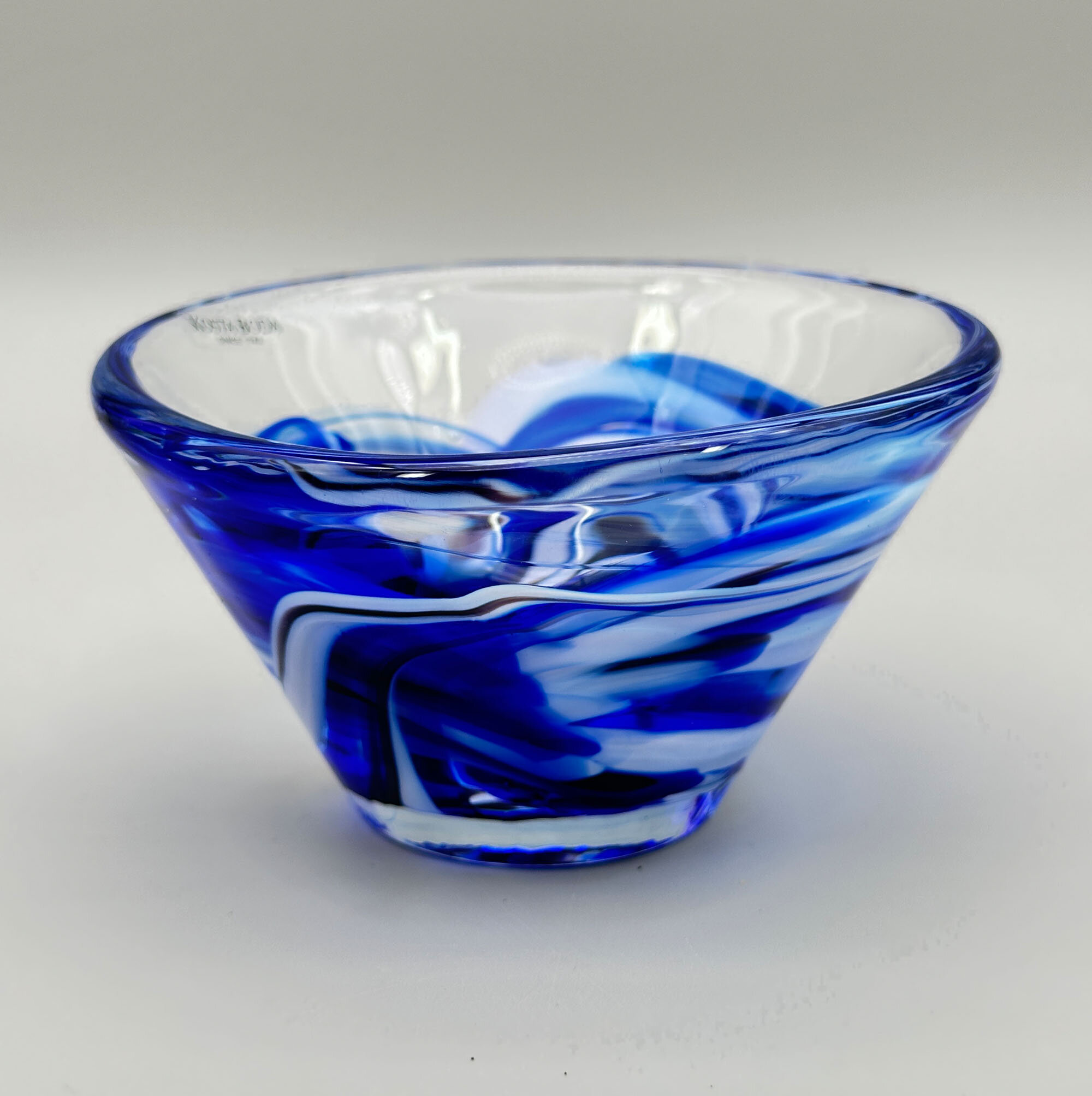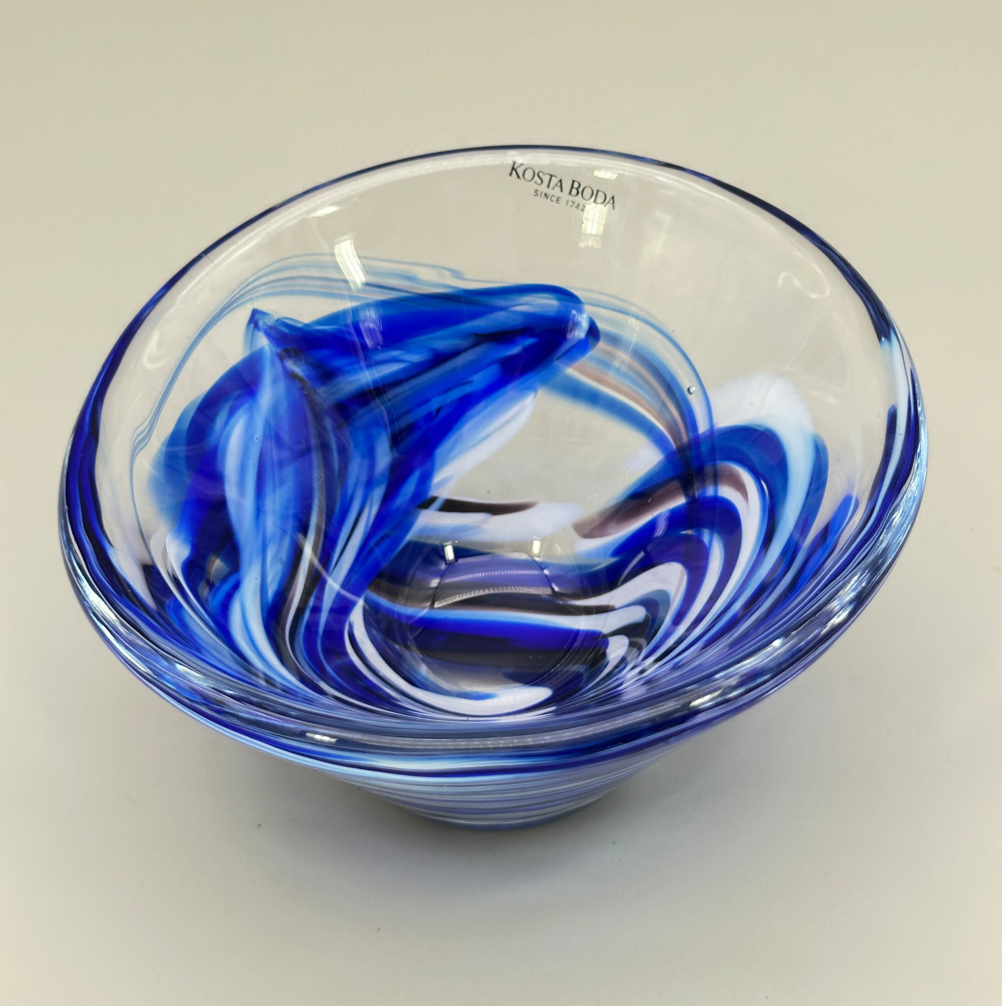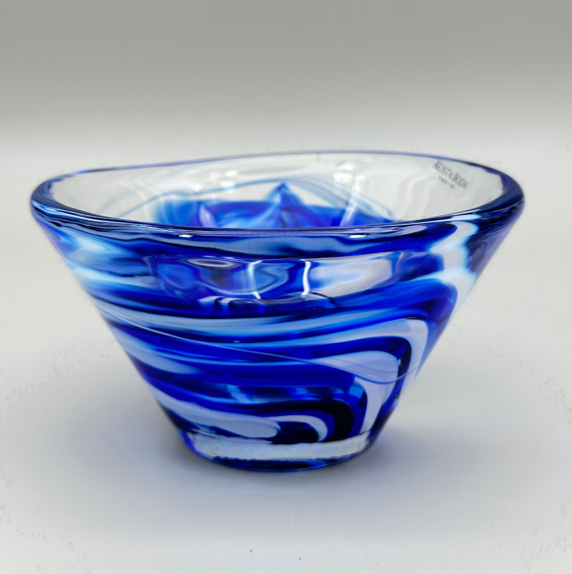 A small glass bowl with a straight flaring profile and a flat base, the decoration with swirling trails of blue glass on a clear glass ground, the label for Kosta Boda attached and reading ‘‘KOSTA BODA since 1742’.Kosta Boda, previously known as Kosta Glasbruk, is a Swedish glassmaking company founded by two foreign officers in Charles XII's army, Anders Koskull and Georg Bogislaus Staël von Holstein, in 1742.It is located in Kosta, Sweden. Early production consisted of window glass, chandeliers and drinking glasses. From the 1840s, the factory was at the forefront of new trends and technical developments, producing pressed glass, and in the 1880s setting up a new glass-cutting workshop. In 1903, the company merged with the Reijmyre glassworks but both retained their own names and Kosta went on to maintain its reputation as one of the leading Swedish manufacturers with a range of fine art glass and tableware by distinguished designers.