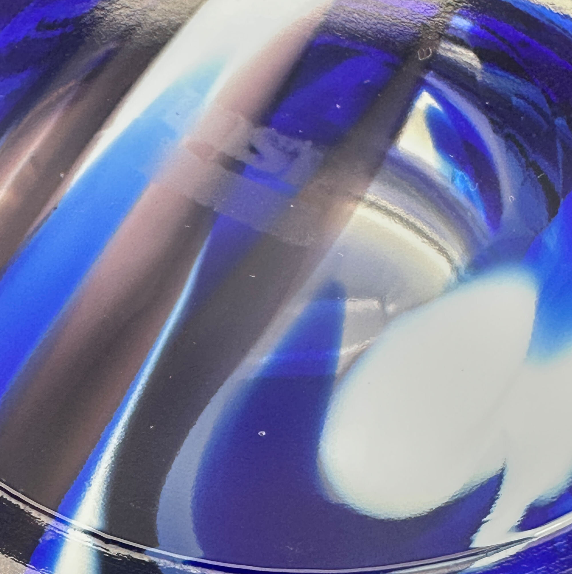Anna Ehrner, born in 1948, has been associated with the firm since 1974. This bowl is from the ‘Contrast’ range and is made using a technique called centrifugation which creates trails of colour inside the glass body. While the design is still produced today, it is no longer available in this size and the lines here are more angular than those found in the modern examples, suggesting a dating to the late 1970s or 1980s soon after Ehrner began working for Kosta Boda.
