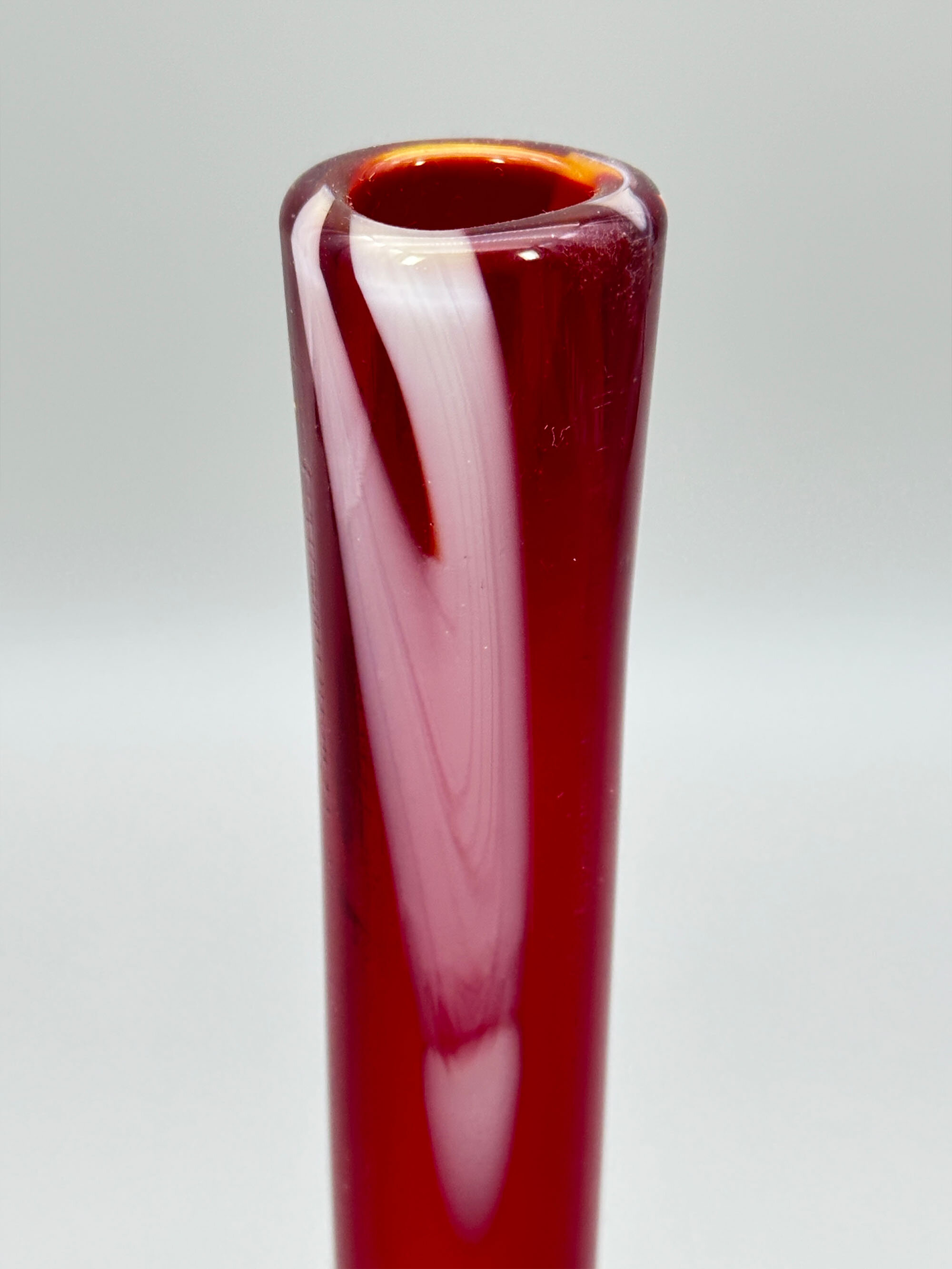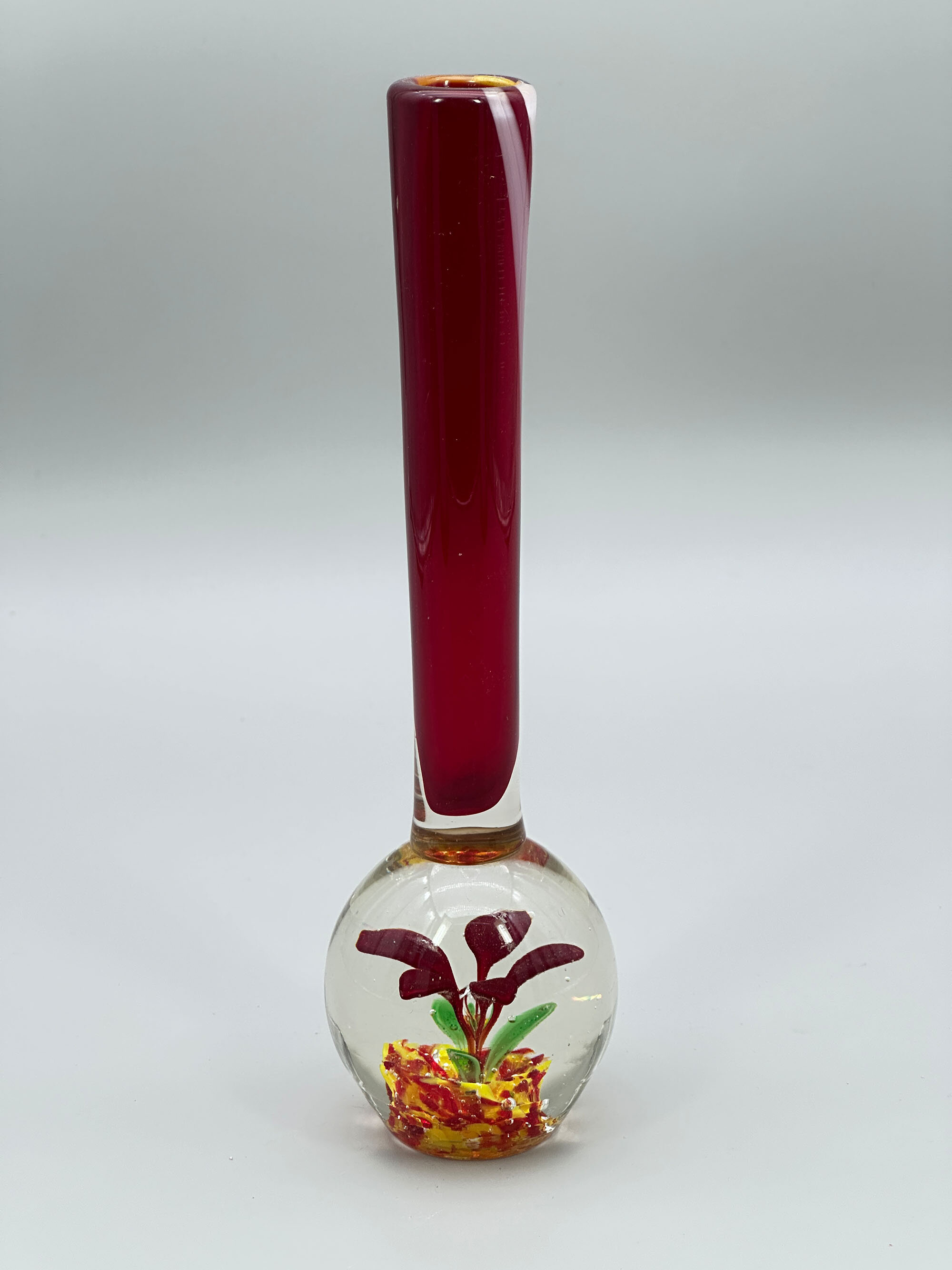 A bud glass vase with a long narrow and very slightly flaring neck above a globular body, the neck deep purple with white streak highlights and the body with a coloured relief sculpture of a flower growing from rocks in the style of a paperweight. This model was produced at Murano in the later years of the twentieth century and was clearly popular from the number of similar pieces which can be found today. Intended to display a single flower it can also double as a paperweight itself making it both decorative and functional as its new owner pleases.| Size: | Ht 21.5cm, Width (max) 5.5cm, Base 3.3cm |