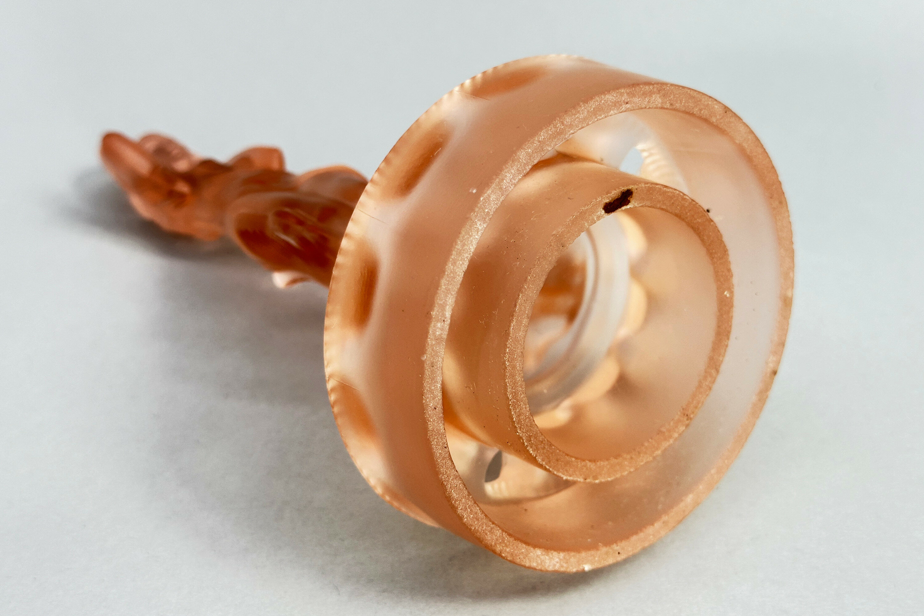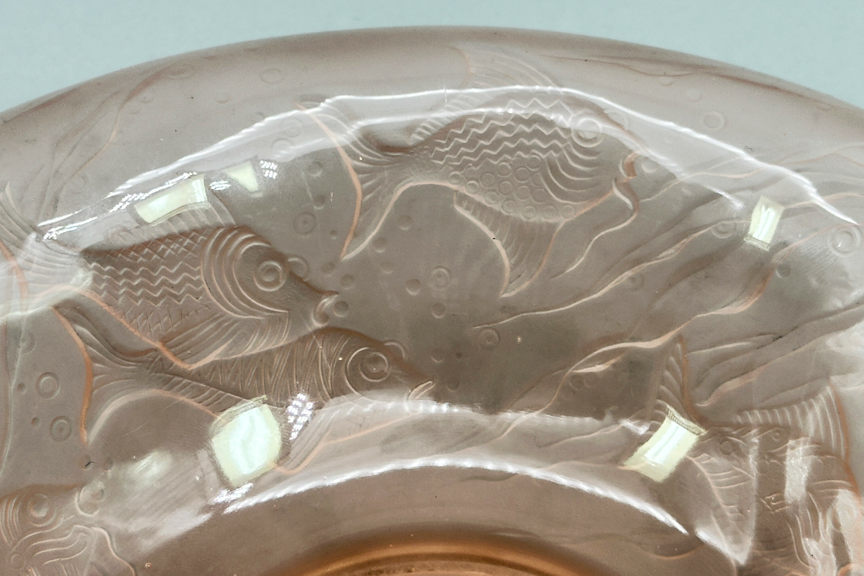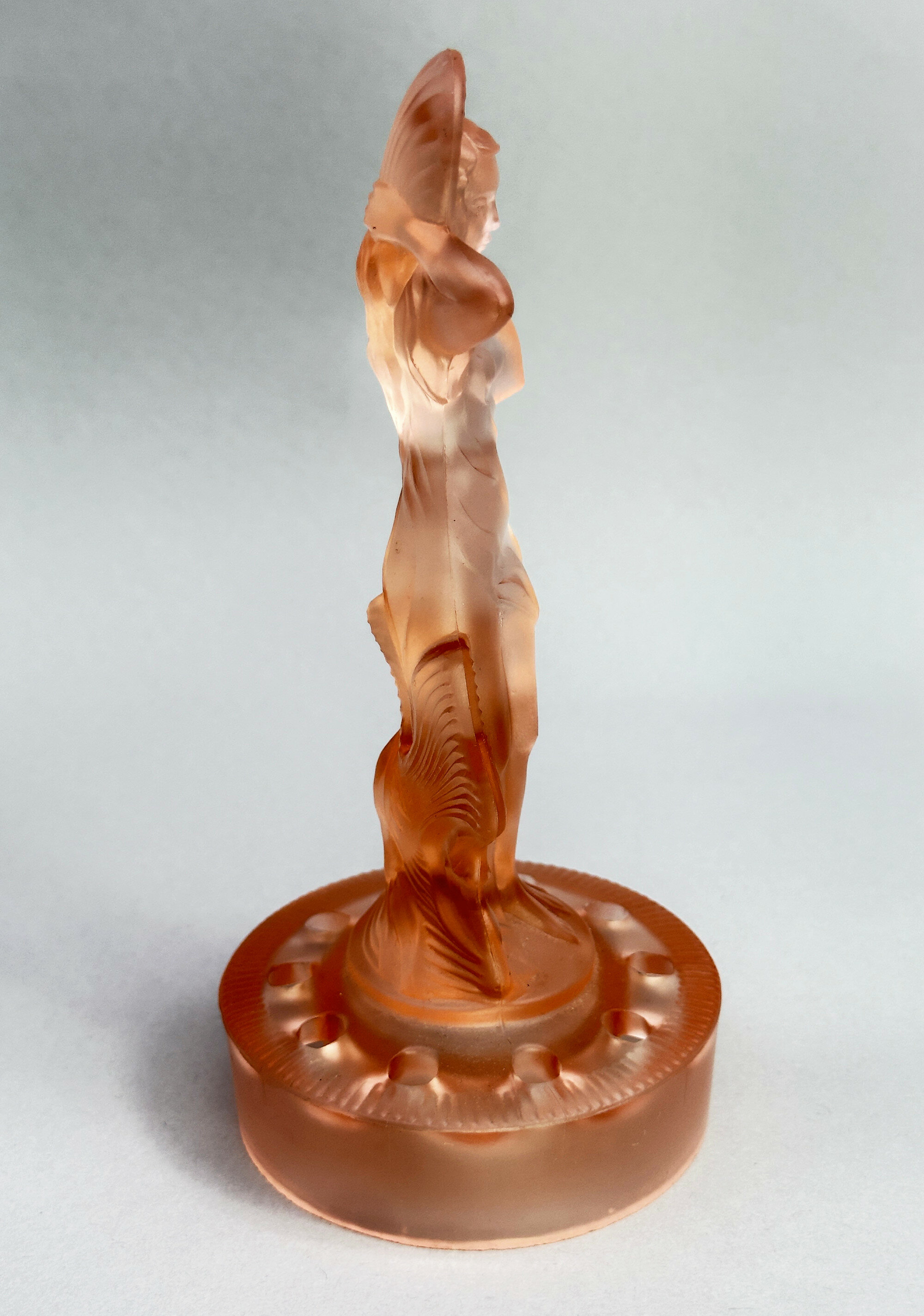 A centrepiece set formed from frosted and clear pink glass comprising a figure of a lady, semi nude, her flowing drapery exposed to reveal her body, a dolphin at her rear and a pierced circular base below to act as a ‘frog’ or flower holder together with a scalloped edge dish with pointed corners and a turnover rim with pressed decoration of fish and waves.The influence of Art Deco style of this piece is clear and it does indeed date to the 1930s. The model, termed ‘Arabella’ can apparently be seen in the 1934 catalogue of the German glass manufacturers Walther and Sohne, founded by August Walther in 1888 at Ottendorf-Akrilla near Dresden. In the 1930s the firm was famous for its Art Deco designs and also produced a version of ‘cloud glass’ which at one time was held to be exclusive to the English manufacturer Davidson. But some of the English glass makers also drew on their German rival’s work such that Walther and Sohne patented some of their designs in the UK in 1937, presumably to protect their work. This centrepiece set is a classic example of Walther and Sohne’s pre war productions and a distinctive example of Art Deco glassware.