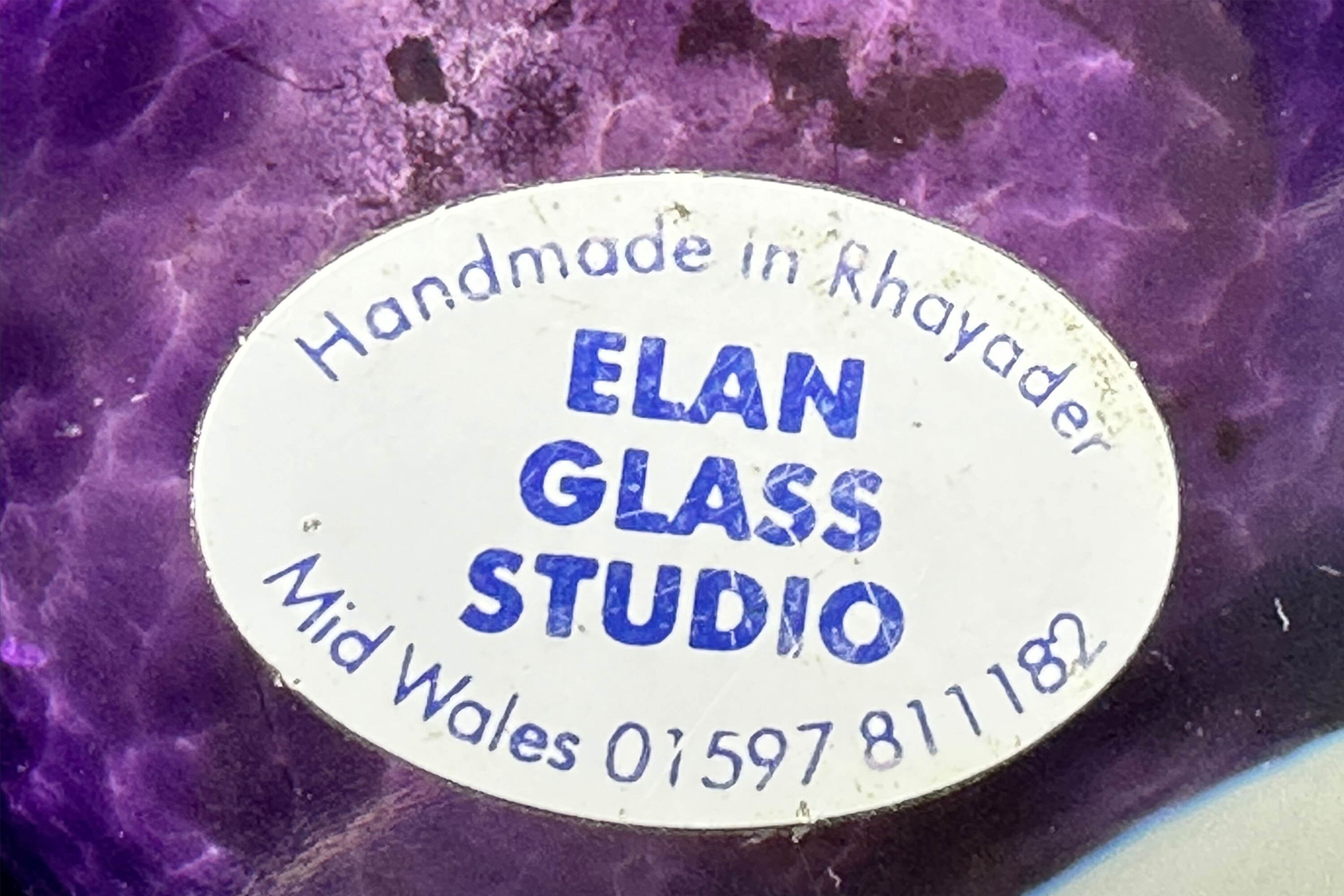 The distinctive form of this vase with its wide conical base narrowing towards the top and flaring outwards into a broad turned over leaf resembles the plant named ‘Jack in the Pulpit’ and was adopted by various glass manufacturers from the Art Nouveau period onwards. There are examples by Tiffany and Loetz and the shape was later produced at Murano and by some of the British glass studios. An example by Alum Bay Glass, Isle of Wight, can be seen elsewhere on this site. As the label indicates, this piece was made by the Elan Glass Studio in Wales but little is known now about this studio which was, perhaps, rather short lived. Although the stouter form suggests the 1960s or 1970s, this has to remain a guess but with its swirling designs and contrasting colourings of purple and white it is an attractive variation of the type.| Size: | Ht (max) 21cm, Width (max) 7cm, Depth (max) 7cm, Base 5.5cm |