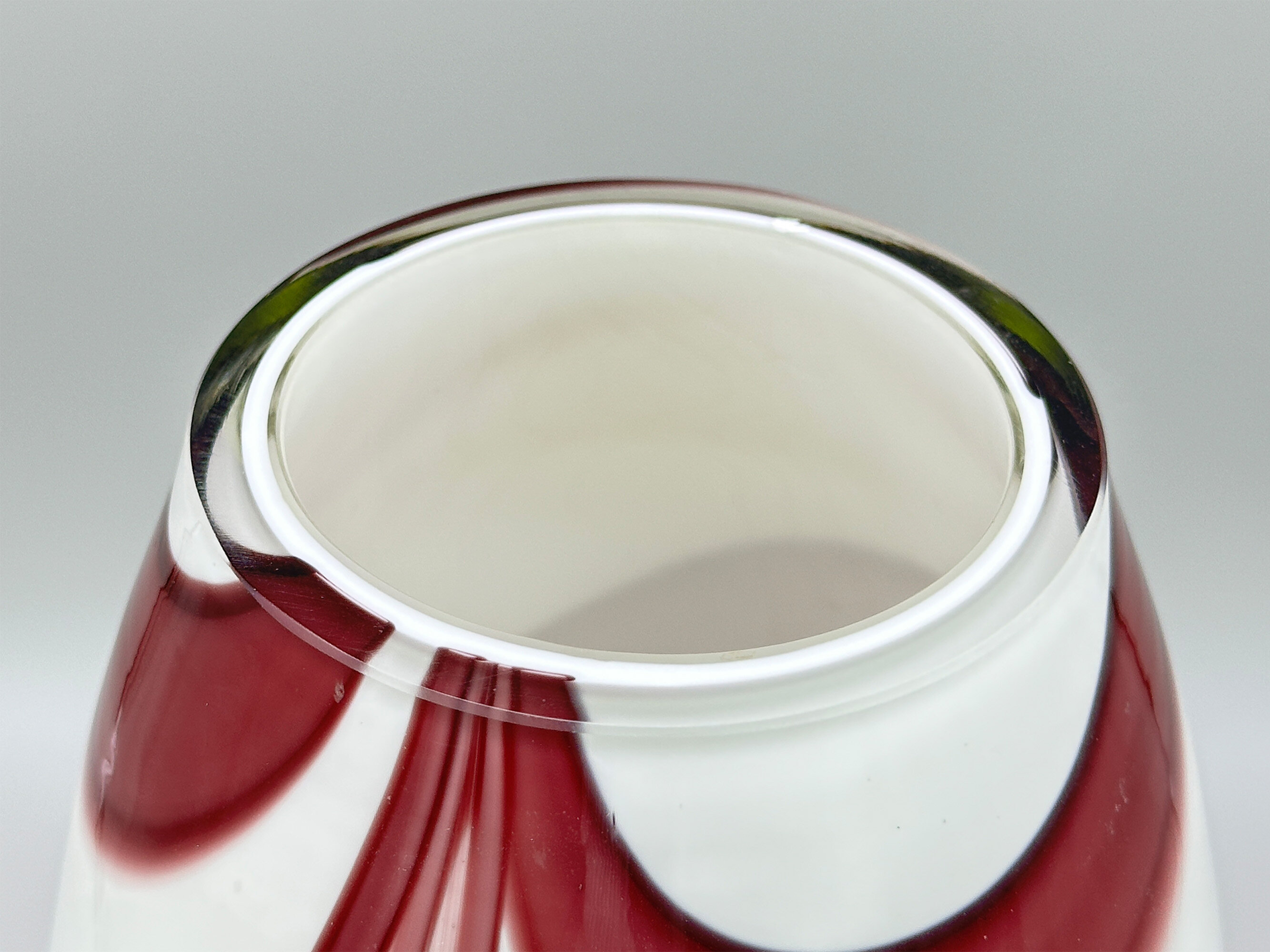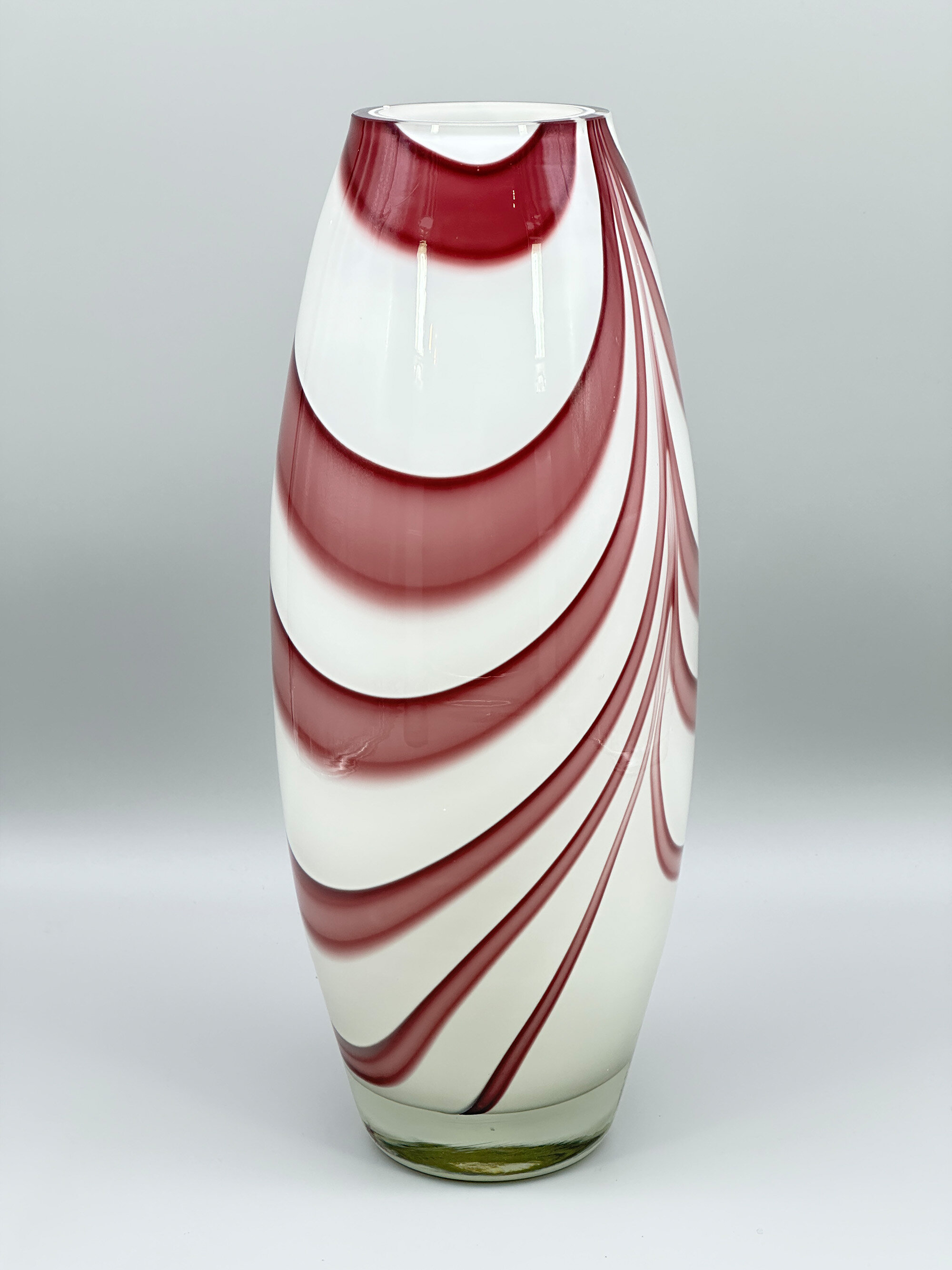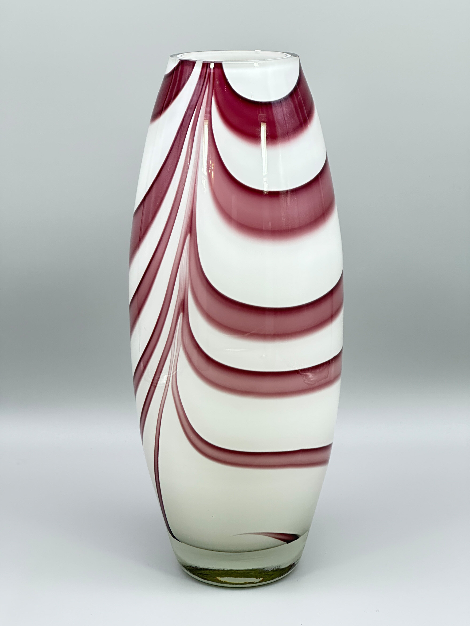 A striking art glass vase of slender ovoid form, the thick walled body with a flat top rim, the white and purple swirling wave design encased in clear glass which also forms the base, the underside with a paper label ‘MADE IN POLAND’. While there are recollections of Italian work here, this vase was not produced there, and its affixed label reveals its source. Polish glass is renowned for its quality and design and this is an excellent example of their production. The form, with its semi abstract decoration, suggests the mid twentieth century, probably the 1960s or 1970s, and the design of the label would, in fact, conform with this.| Size: | Ht 33cm, Top diam 7.7cm, Width (max) 12cm, Base 7.5cm |