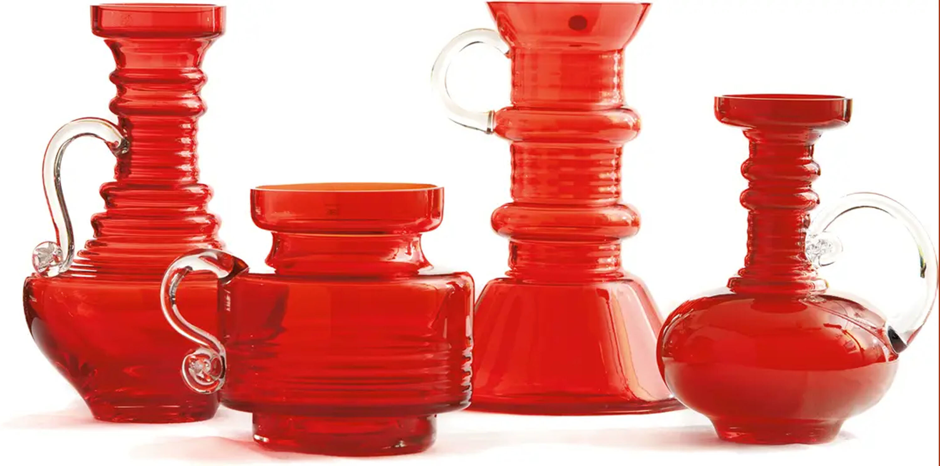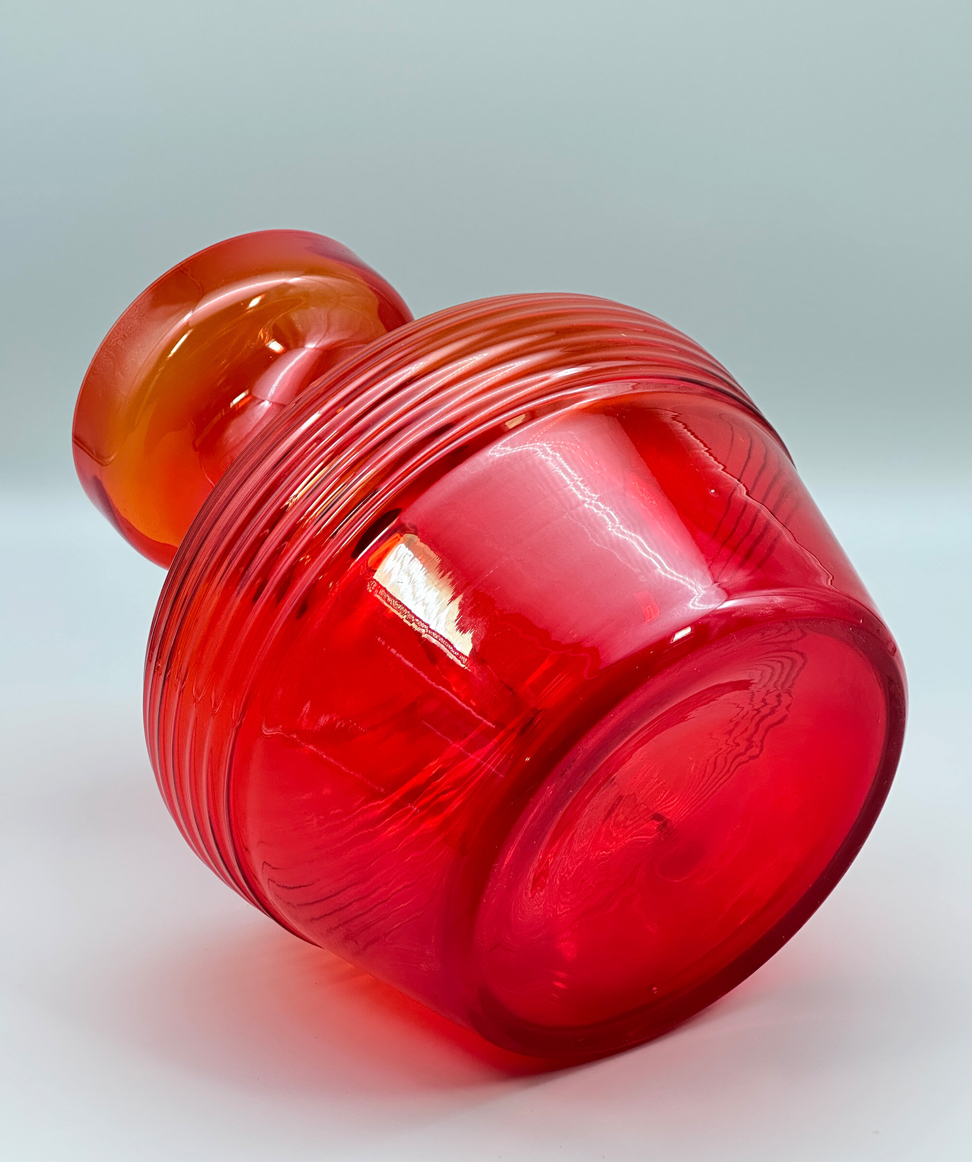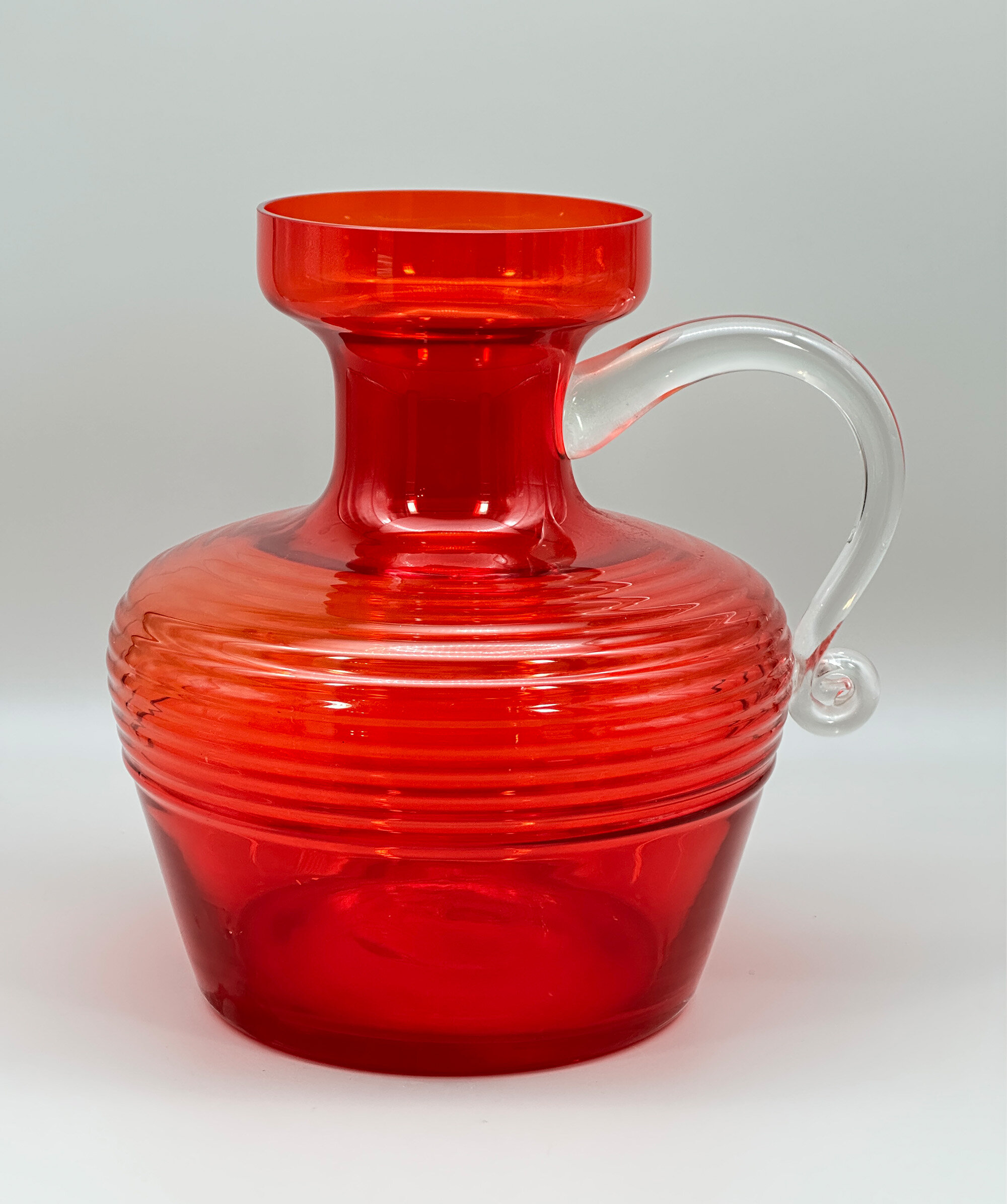 Red glass jug, Cleopatra range, Tamara Aladin for Riihimäen Lasi, Finnish 1970s