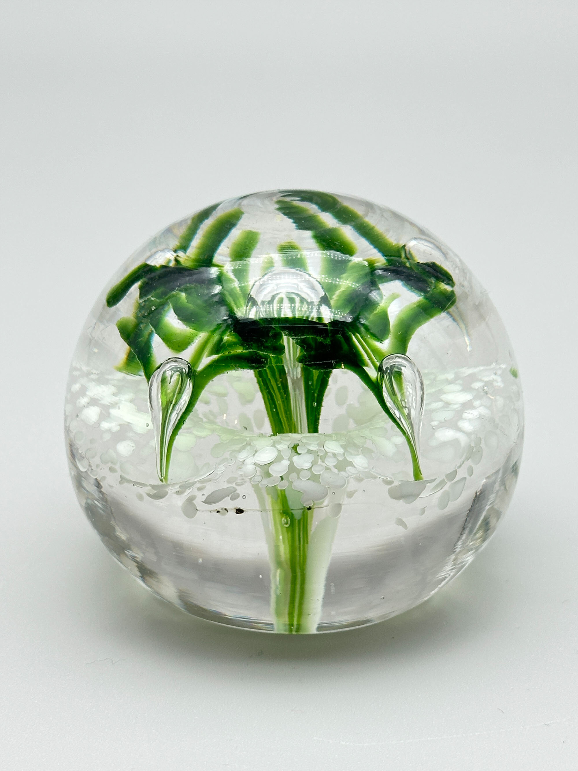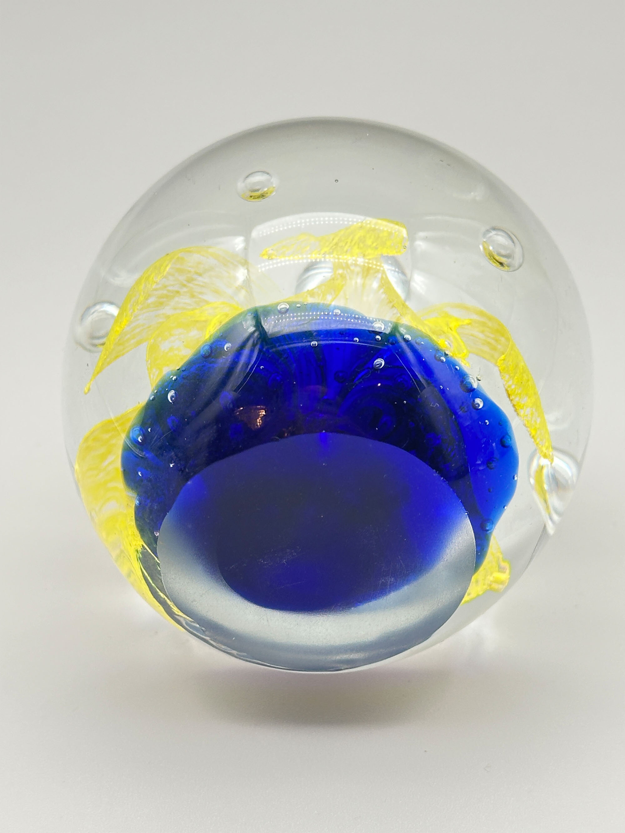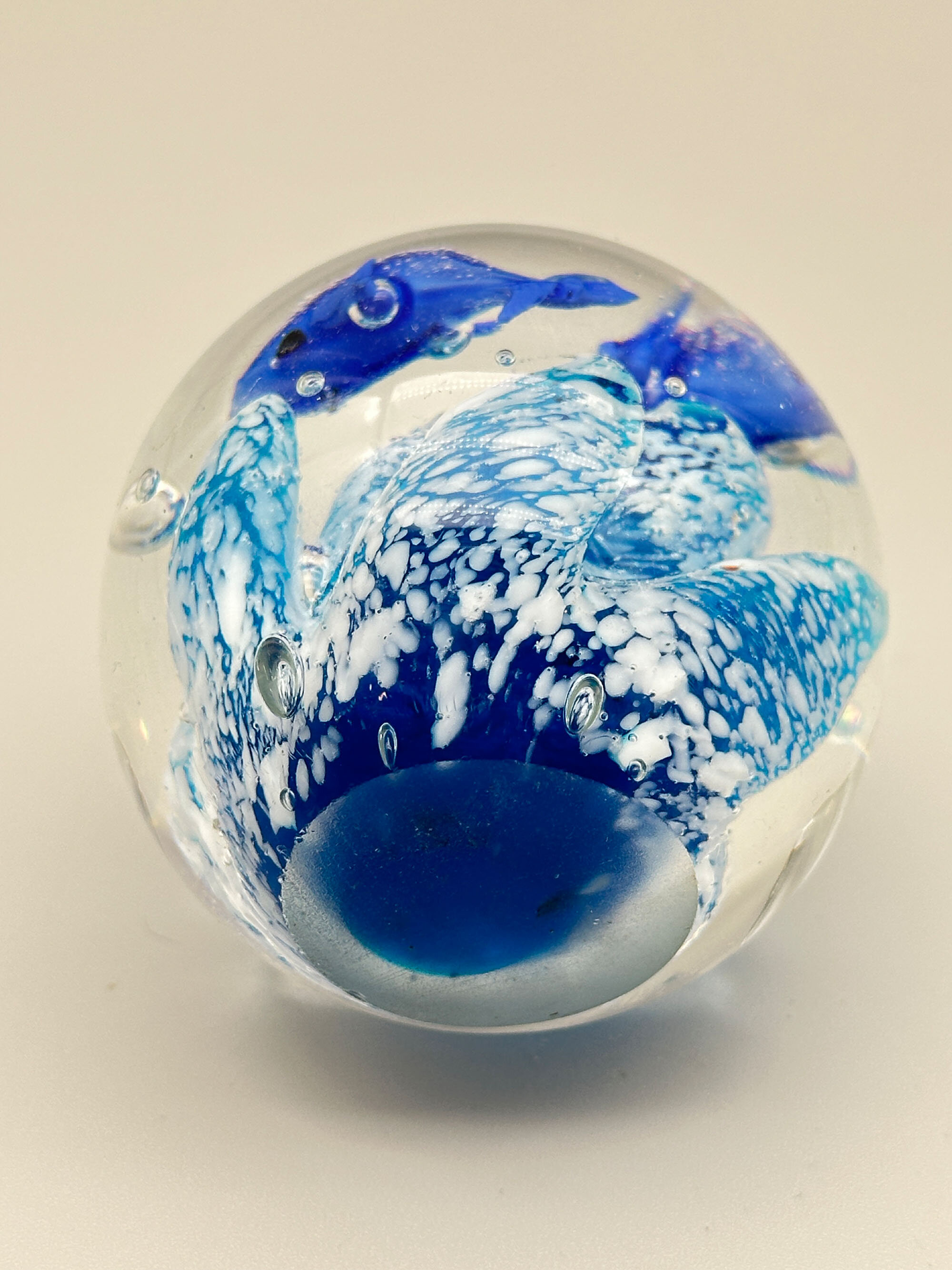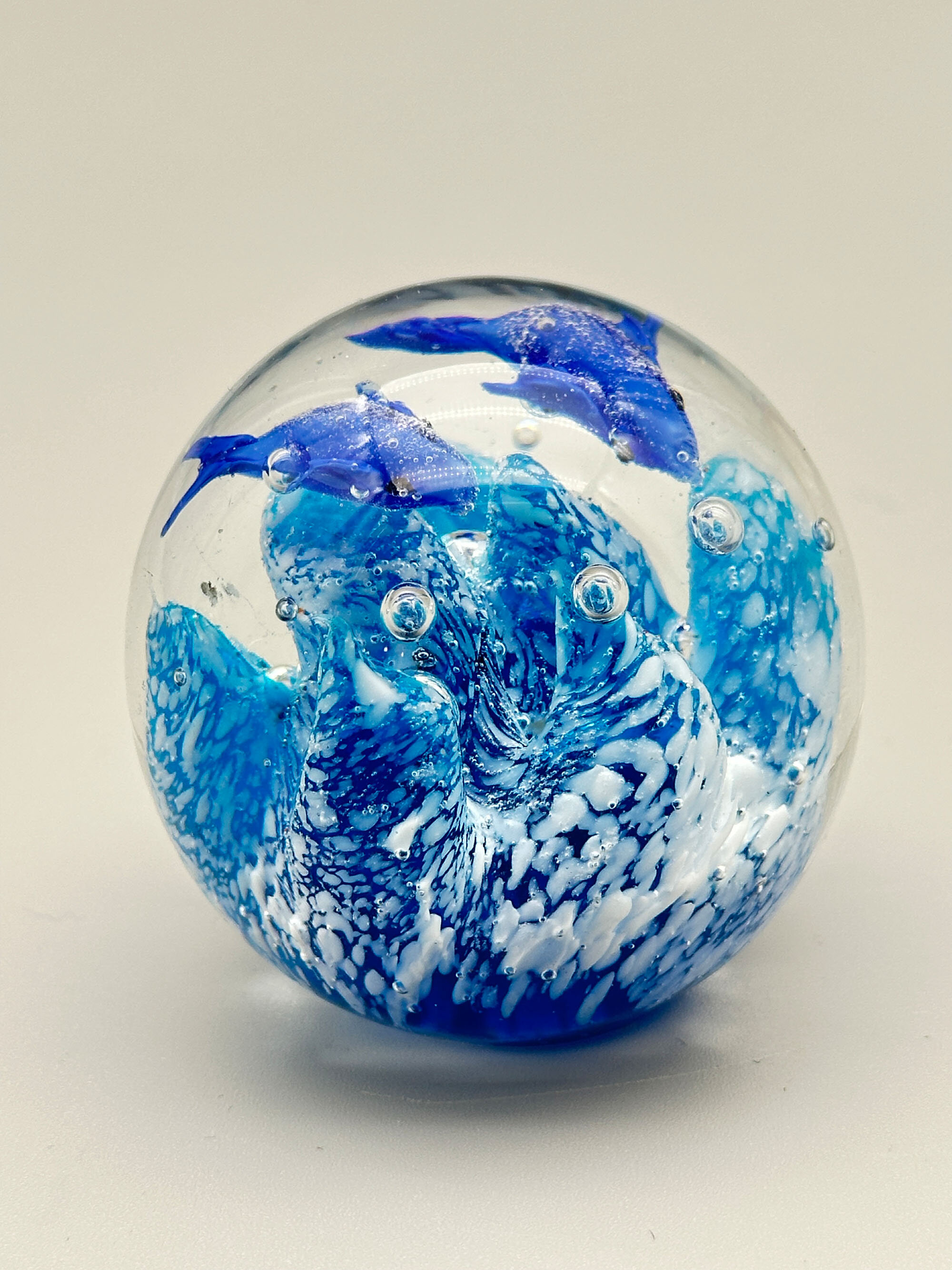 Three attractive paperweights of typical globular form with flat bases, the first with a yellow lily growing from deep blue water with bubbles, the second with a green lily like plant issuing from clear water with foam on the top and the third with two dolphins above blue and white flecked waves. Features of the first and the last (the ‘bullicante’ bubbles and the two swimming dolphins) are found in Murano pieces and this may well be their place of manufacture. The second looks more English and could be from one of the many firms who make paperweights, such as Caithness. Dating is probably to the later years of the twentieth century.| Size: | (i) Yellow/Blue : Ht 8cm, Diam (max) 8cm, Base 4.2cm (ii) Blue : Ht 6cm, Diam (max) 6.5cm, Base 4.2cm (iii) Green : Ht 5.5cm, Diam (max) 5.5cm, Base 2.5cm |
