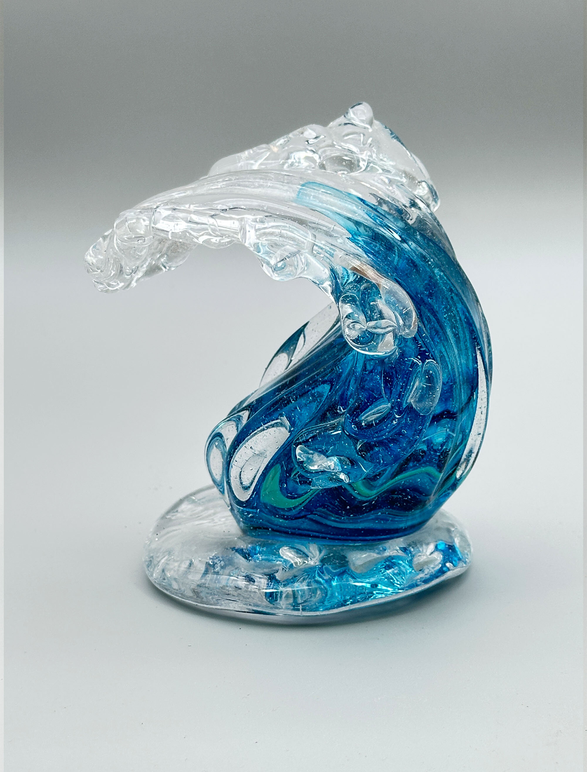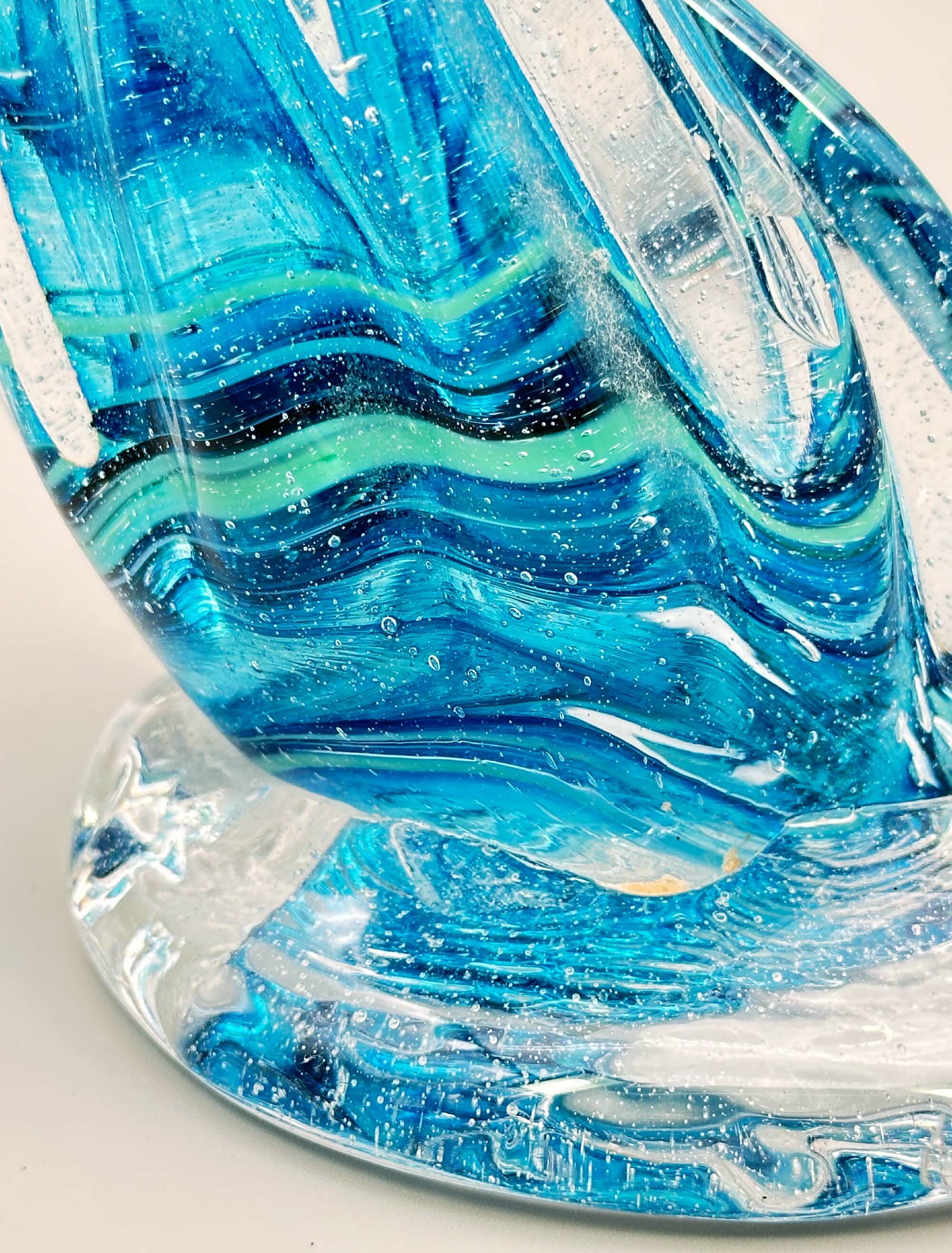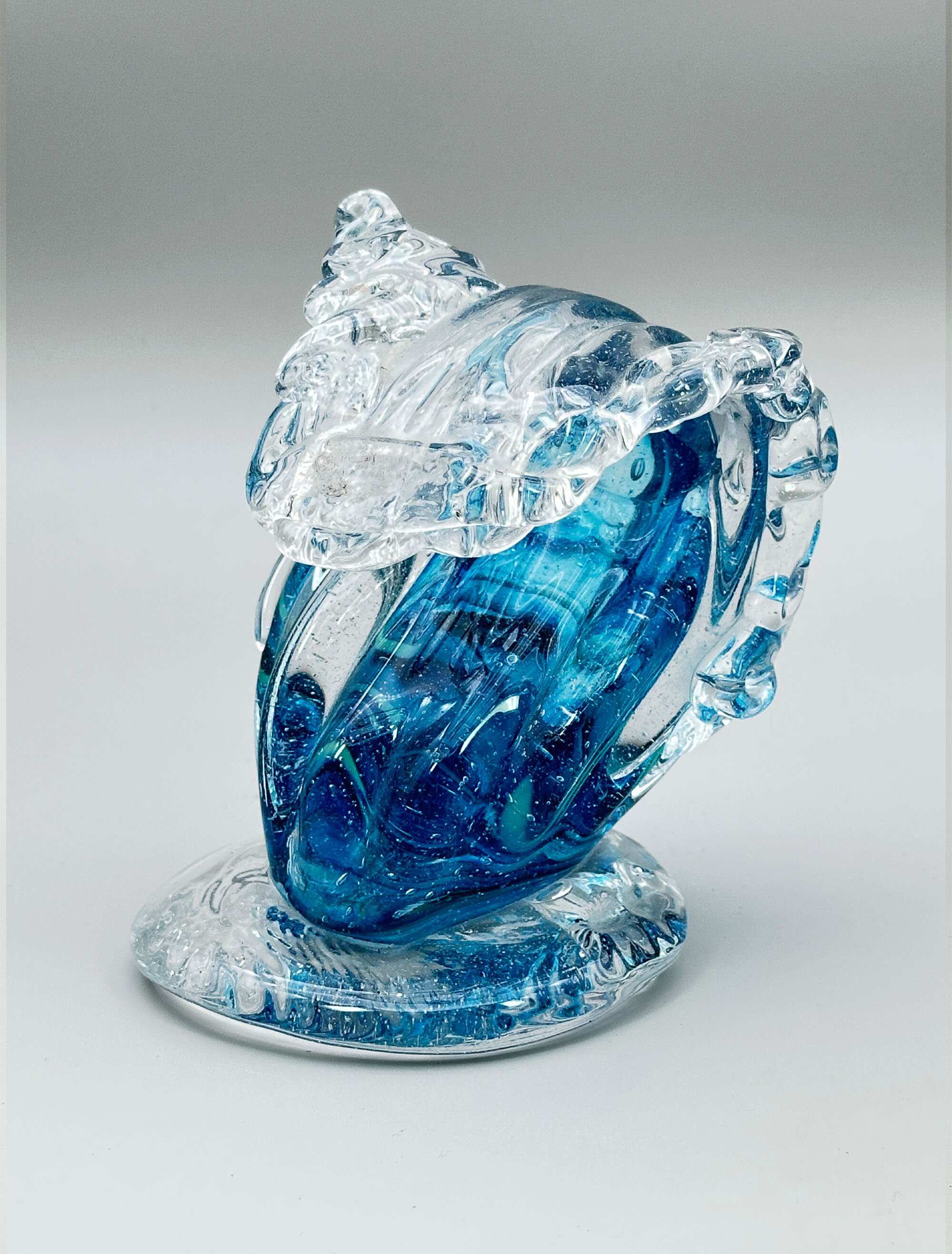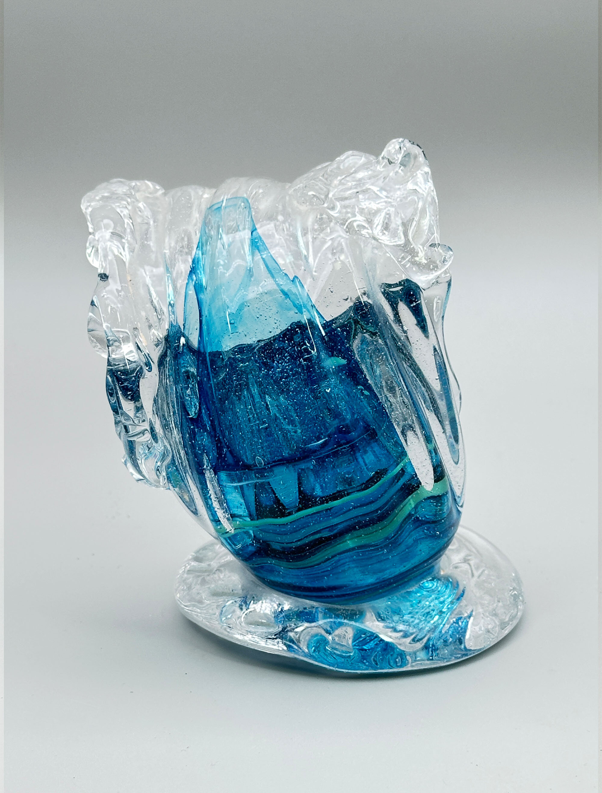 This is a dramatically modelled vase representing a cresting wave, the variegated blue glass with minute bubbles imitating water and blending into clear glass imitating the foam atop. It stands on an irregularly circular base, similarly finished. There are similar wave shape glass sculptures made by British artists such as Alison Vincent or David Wight but this piece resembles more closely the marine inspired designs made at Murano, Italy, in the later part of the twentieth century, some of which are attributed to Cristiano Toso. The maker here must remain anonymous but has created a dynamic piece which successfully recreates the sense of an ocean swell.| Size: | Ht (max) 14cm, Width (max) 11cm, Base 10cm |