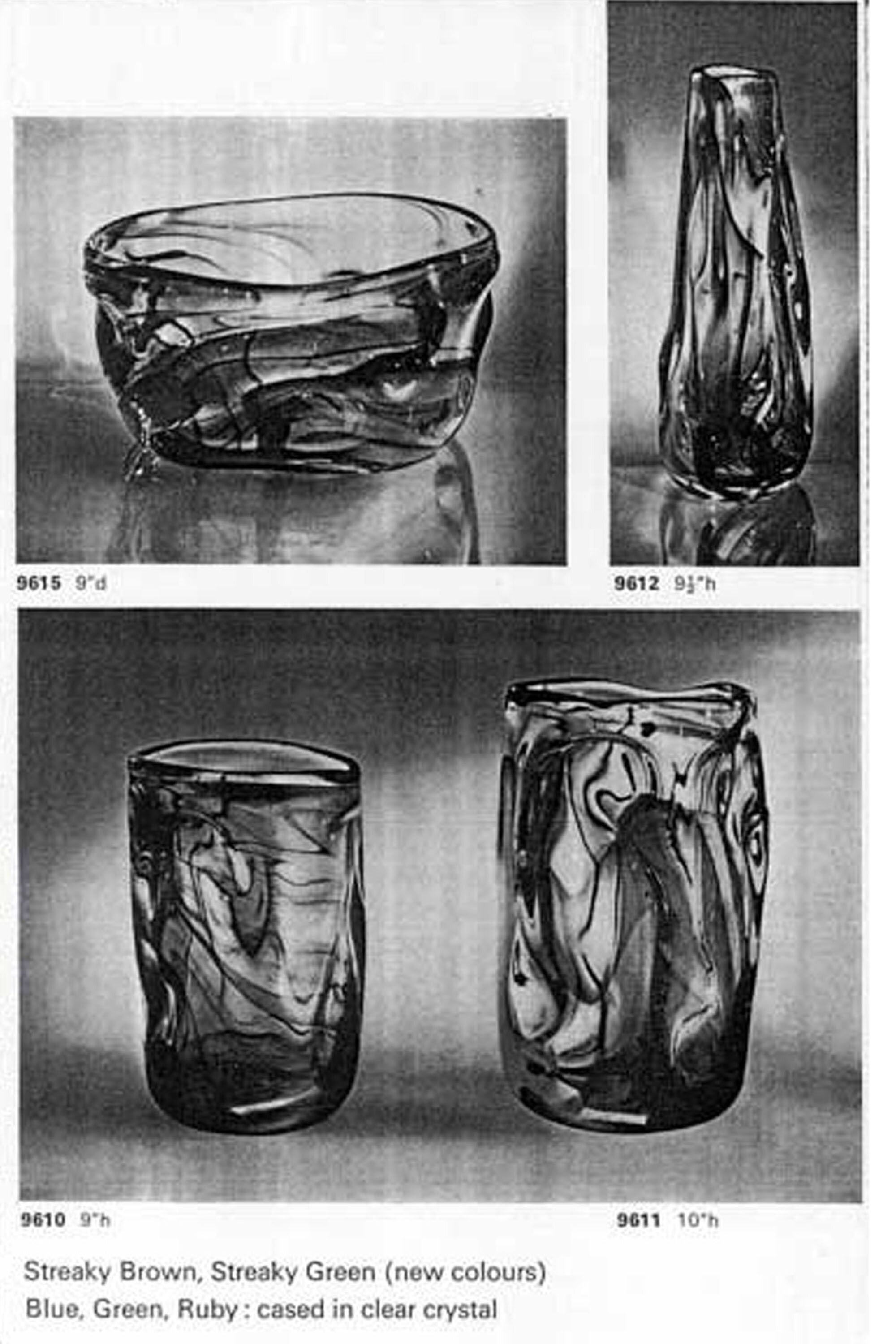 This is an example of the ‘knobbly’ vase range, first produced by Whitefriars Glass in 1964. The organic circular body tapers gently upwards to the uneven top rim, the thick walls with raised ‘knobs’ irregularly placed and the base countersunk. Founded by James Powell in 1834, who bought an existing glassworks in Whitefriars, London, Whitefriars Glass continued through the generations, relocating to Wealdstone in Middlesex in 1923. Many designers worked for it including Geoffrey Baxter, who created the celebrated ‘banjo’ and ‘drunken bricklayer’ vases, but vases of this form and similar pieces with ‘knobbly’ decoration were designed by William Wilson, Whitefriars’ chief designer, and Harry Dyer, with the pattern number 9612 and to be found in the 1964 catalogue (Introduction Page 1) as one of the new designs for that year (see image XXXX). Unfortunately the high labour costs of handmade glass and the economic difficulties in the UK in the late 1970s made Whitefriars uncompetitive and it ceased trading in 1980 after which its factory was demolished.| Size: | Ht 24cm, Top diam 5cm, Width (max) 9cm, Base 4.5cm |