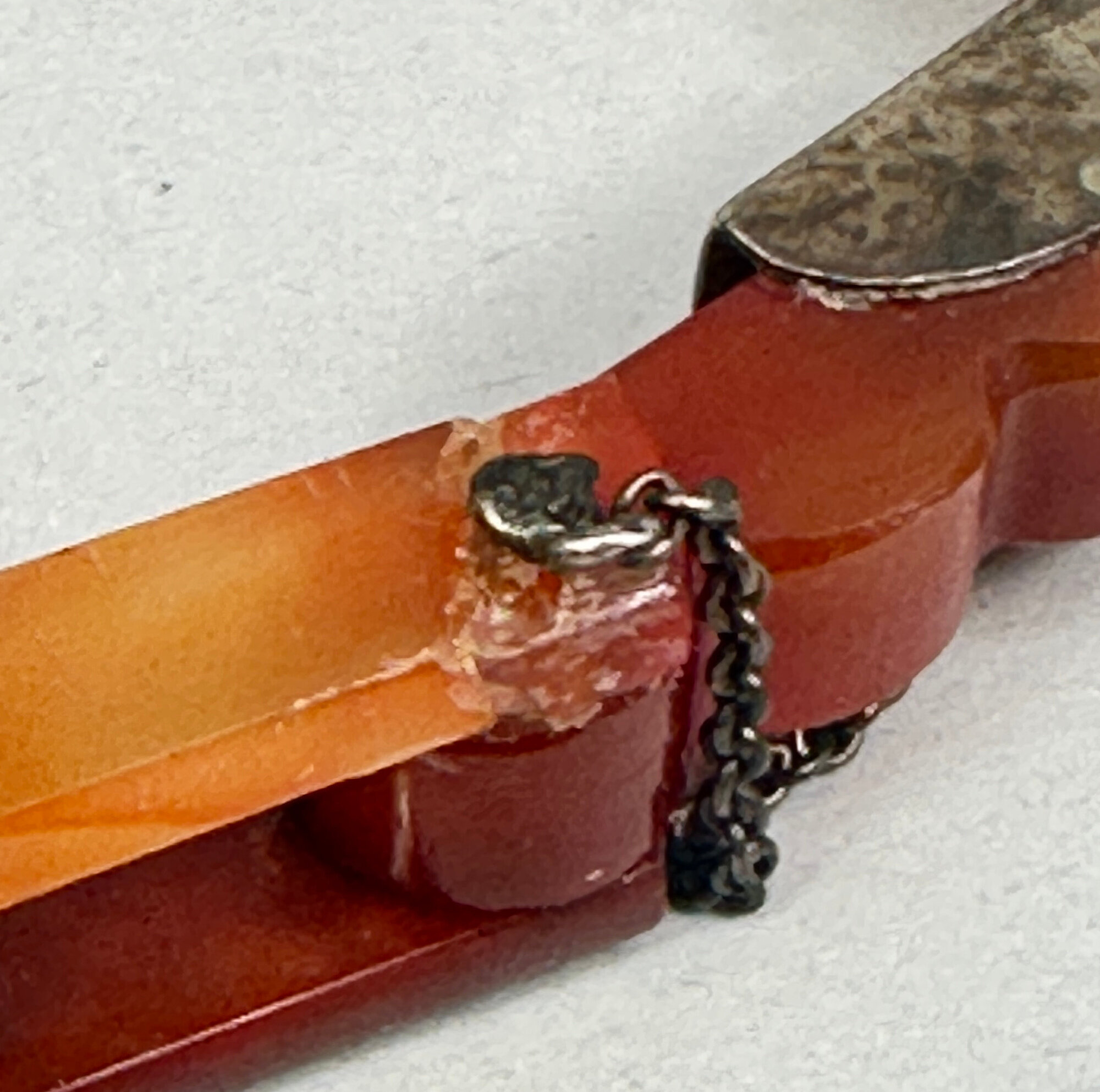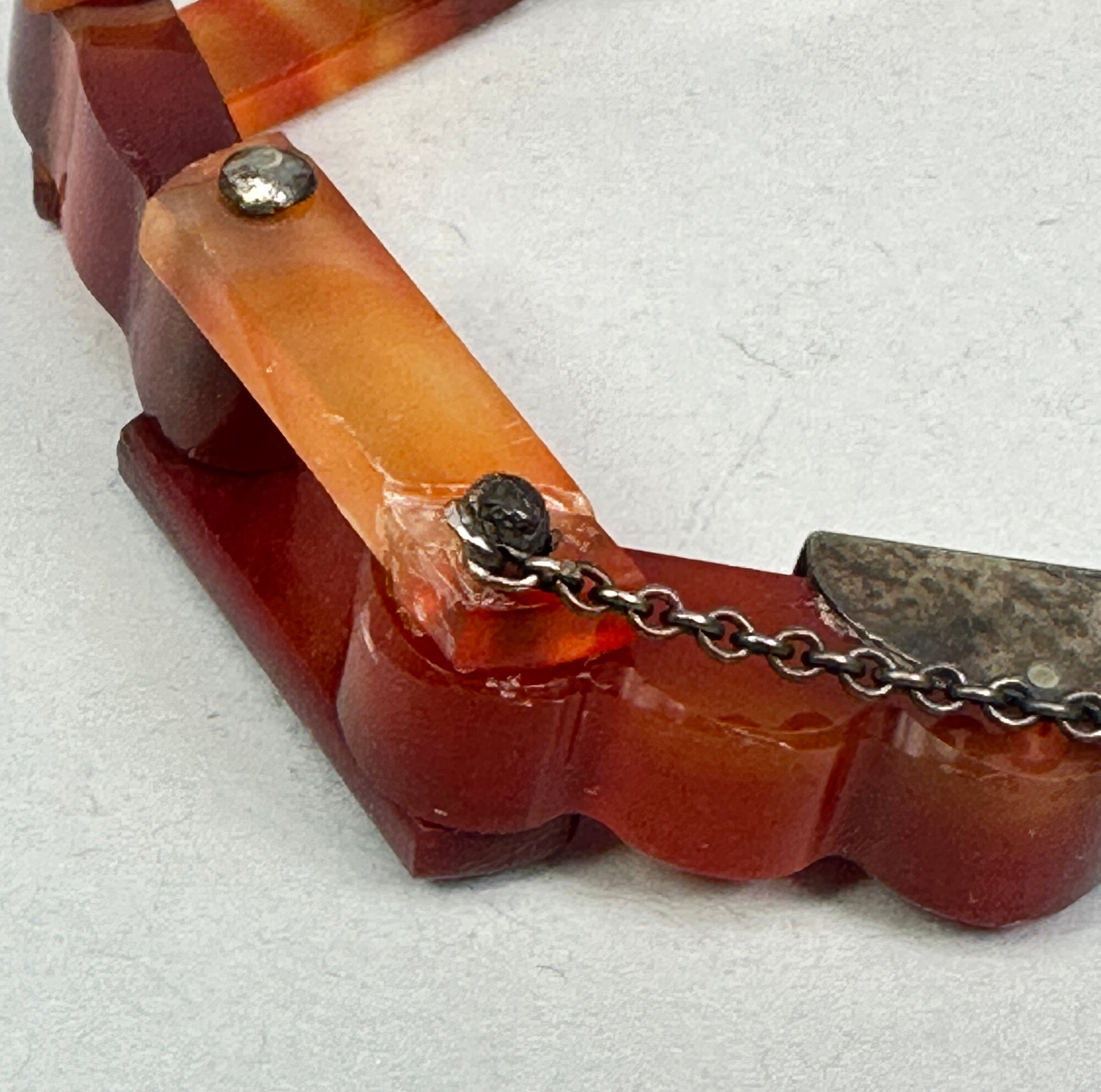 This is a fabulous braclet comprising carved links of banded carnelian that have been connected with screws. It is in beautiful condition with an integrated clasp and the original safety chain. There are not many of these types of bracelets surviving today as they are quite fragile and tended eventually to break whereas this bracelet has miraculously survived intact. There is one small repair right near to the clasp which could quite possibly have been carried out by the maker at the time. It is a good length so suitable for most wrists.Size: | Length 19 cm, 13.8 x 24.6 large station, 24.4 x 8.7 mm small station |