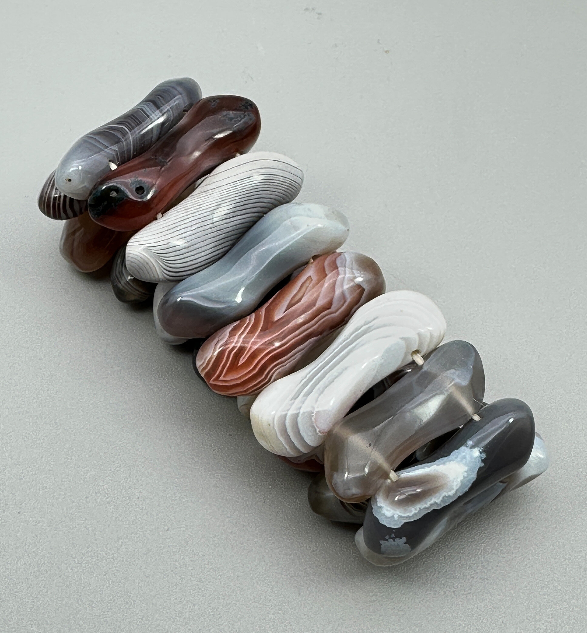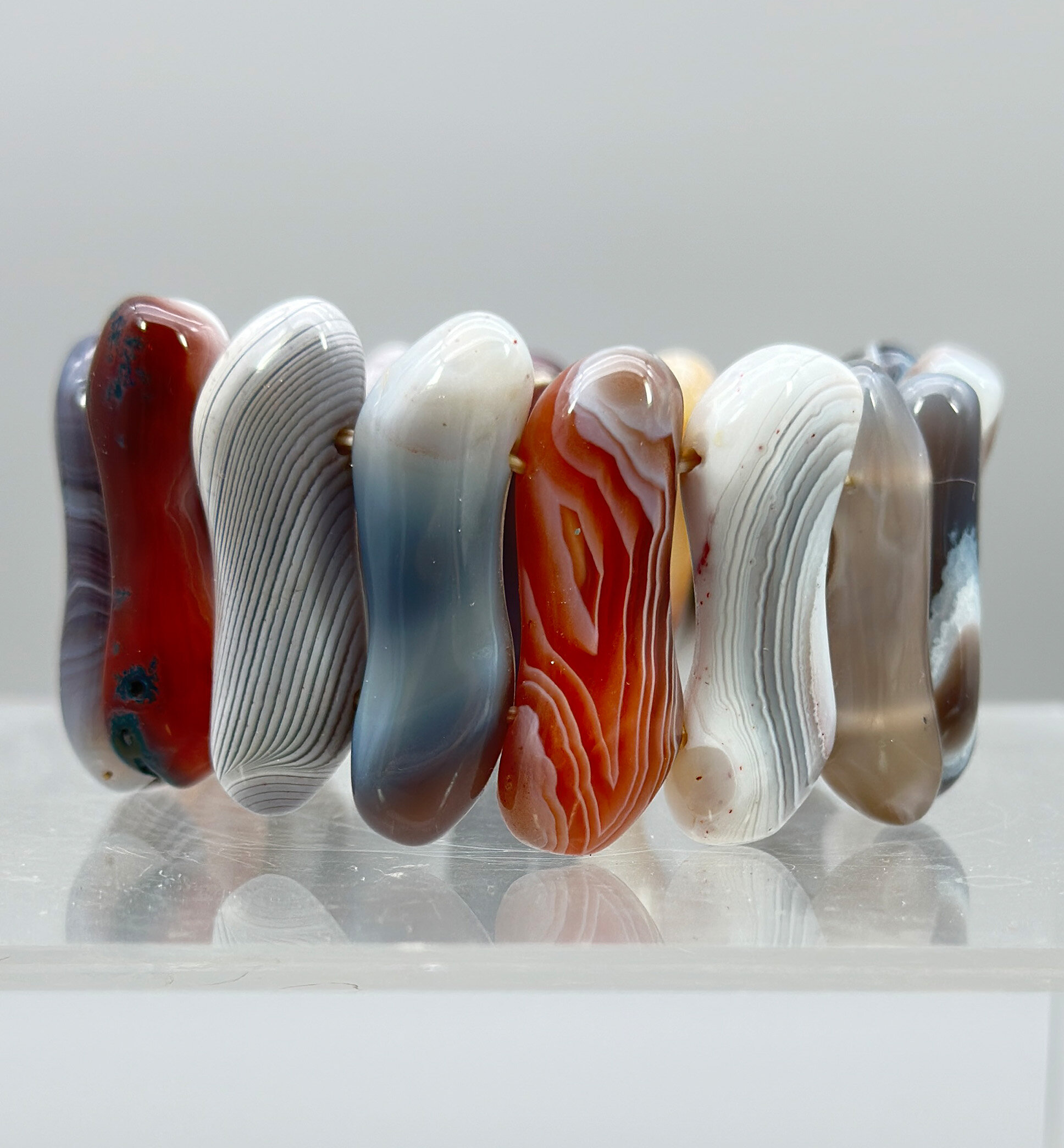 This is rather interesting as it is a quite large bracelet comprising numerous stations of carved agate stones. It showcases all colours and types of agate from banded agate to chalcedony and makes a real statement. This bracelet definitely has star power. It is strung on elastic, as it typical for these types of bracelets, so it is very easy to get on and off and it is super sturdy in addition.Size: | Width 32.4 mm, Each station approx 11 mm wide |