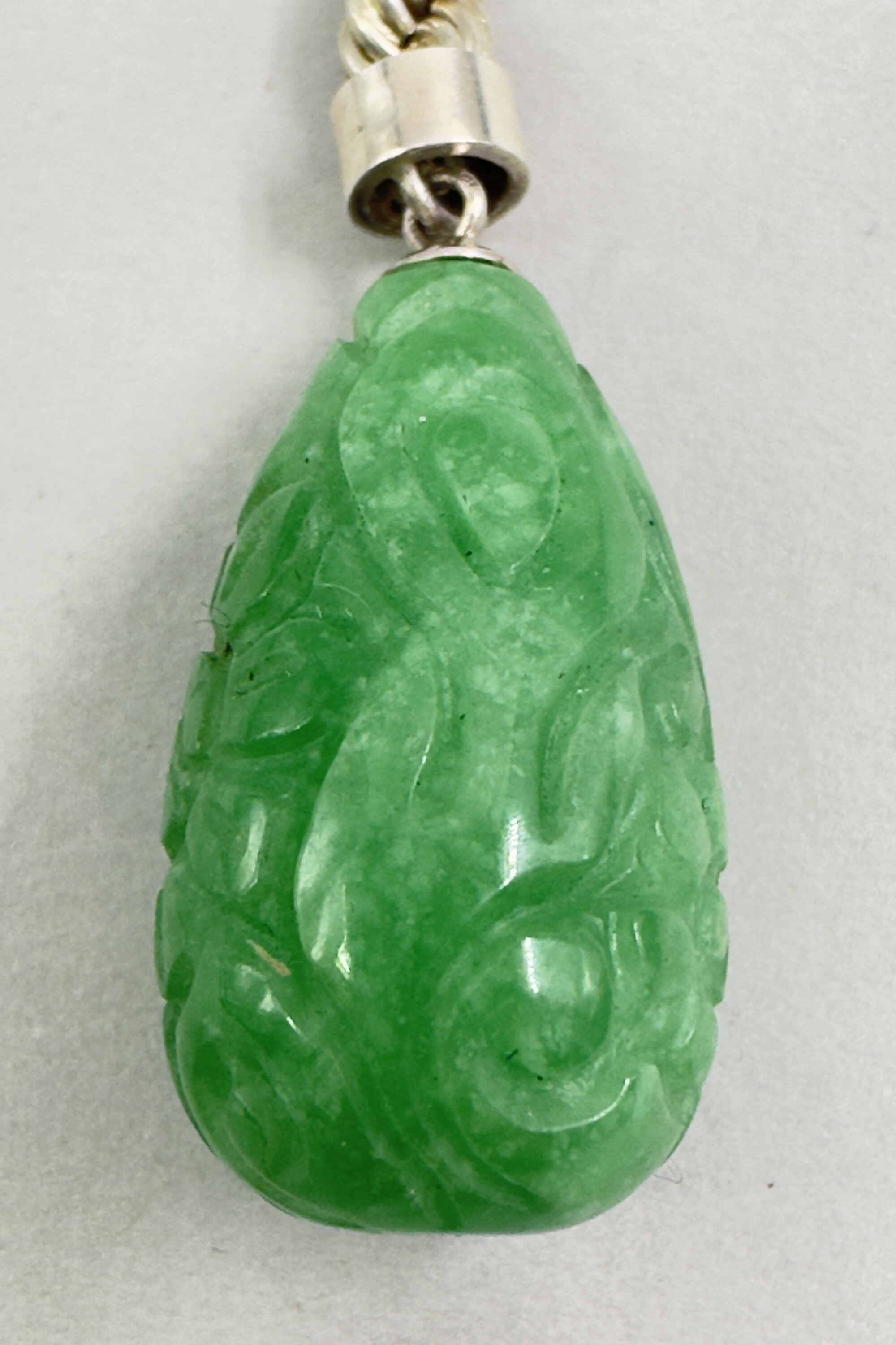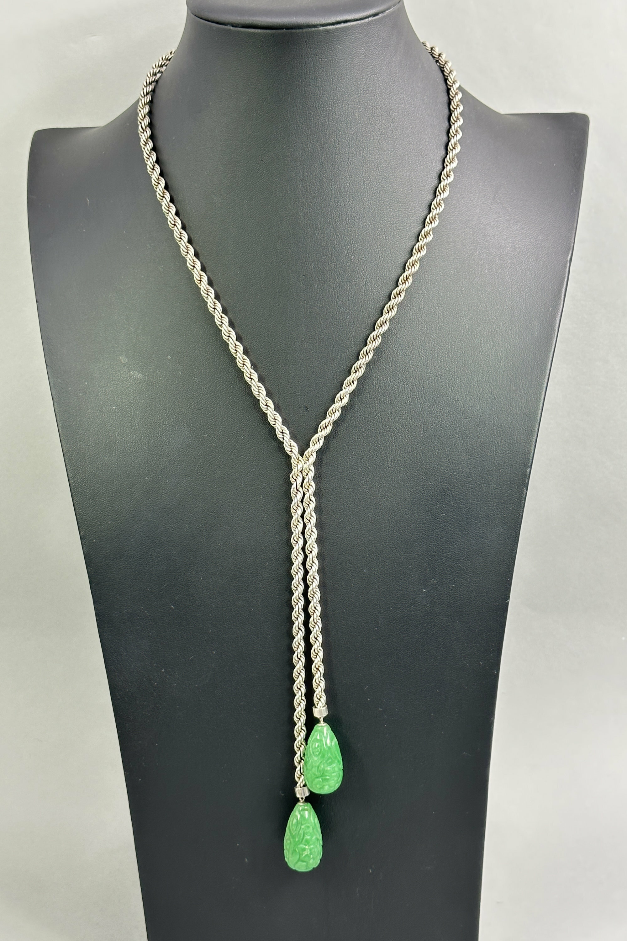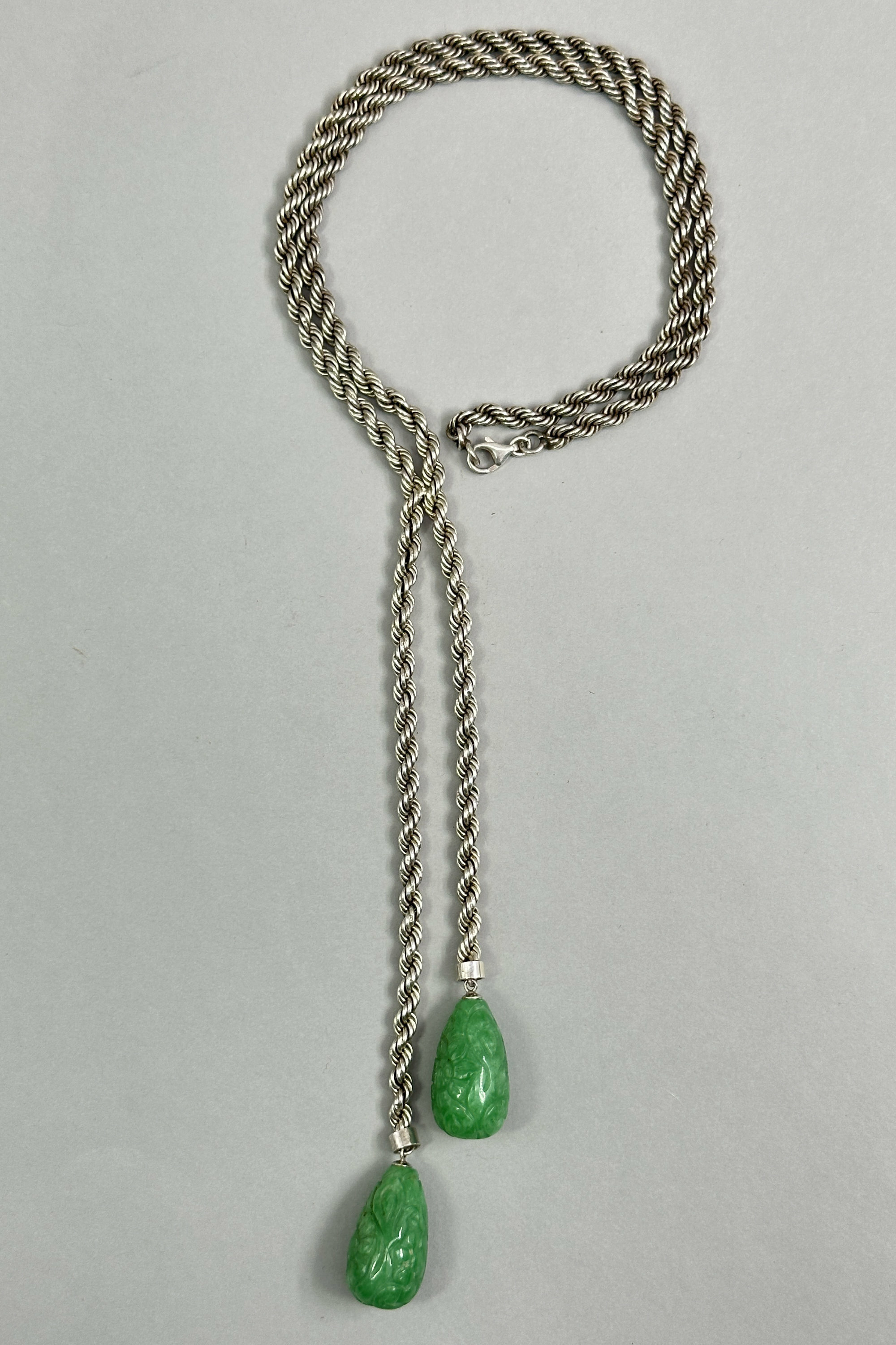This is a constructed necklace comprising a long rope chain that is joined at the front leading to two tassel like asymmetrical drops. The drops are pieces of carved apple jade. These appear to be natural in colour although they have not been tested so might possibly be treated in some way, as many jade pieces are. The chain and the jades have been combined and so they date differently. Both, though, appear to be relatively modern, probably late 20th century. The chain clasp is marked '925'Size: | Necklace down to the join is 48 cm, the drops measure 15 cm and 12 cm, the jade carvings are 2.5 cm x 1.47 cm |