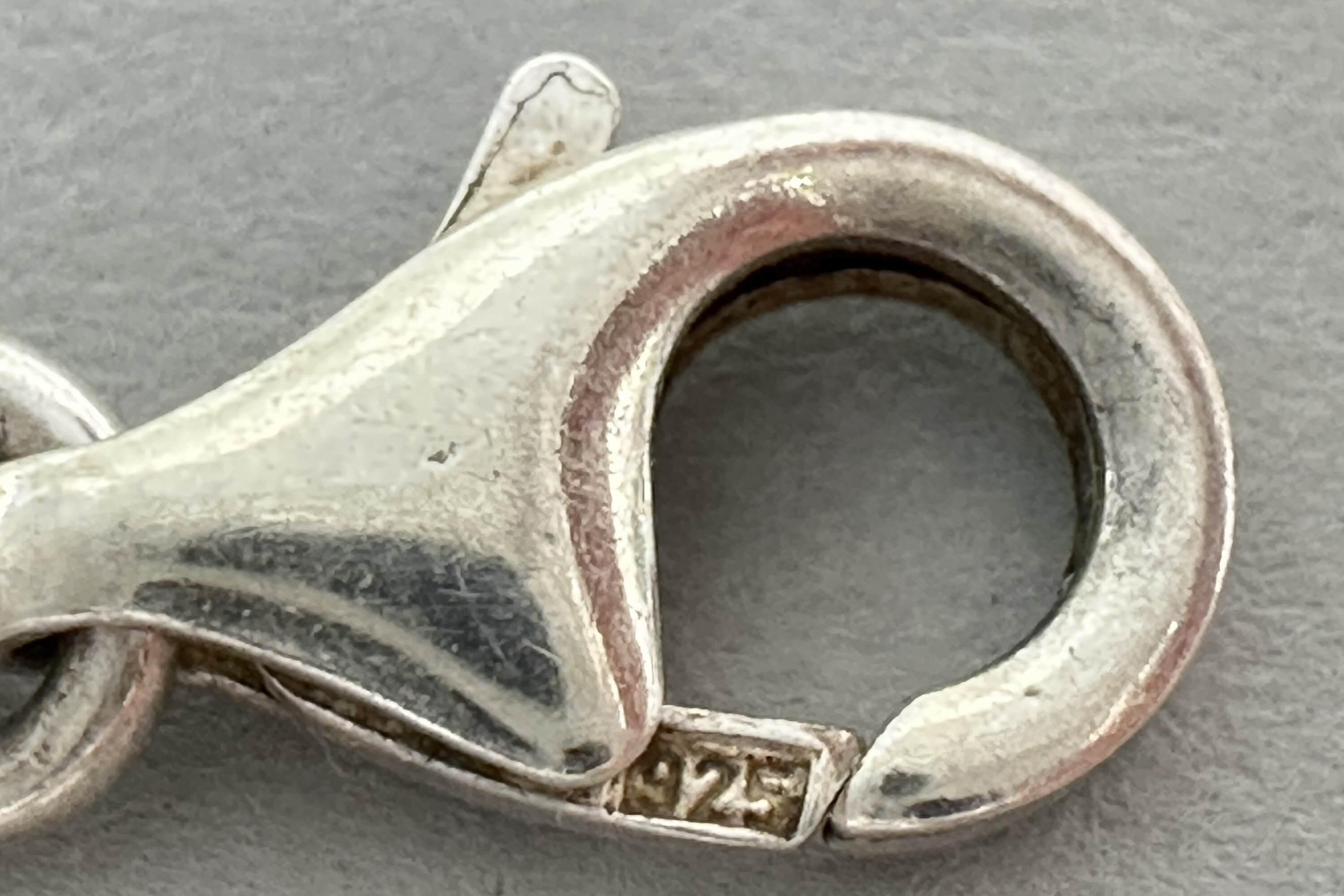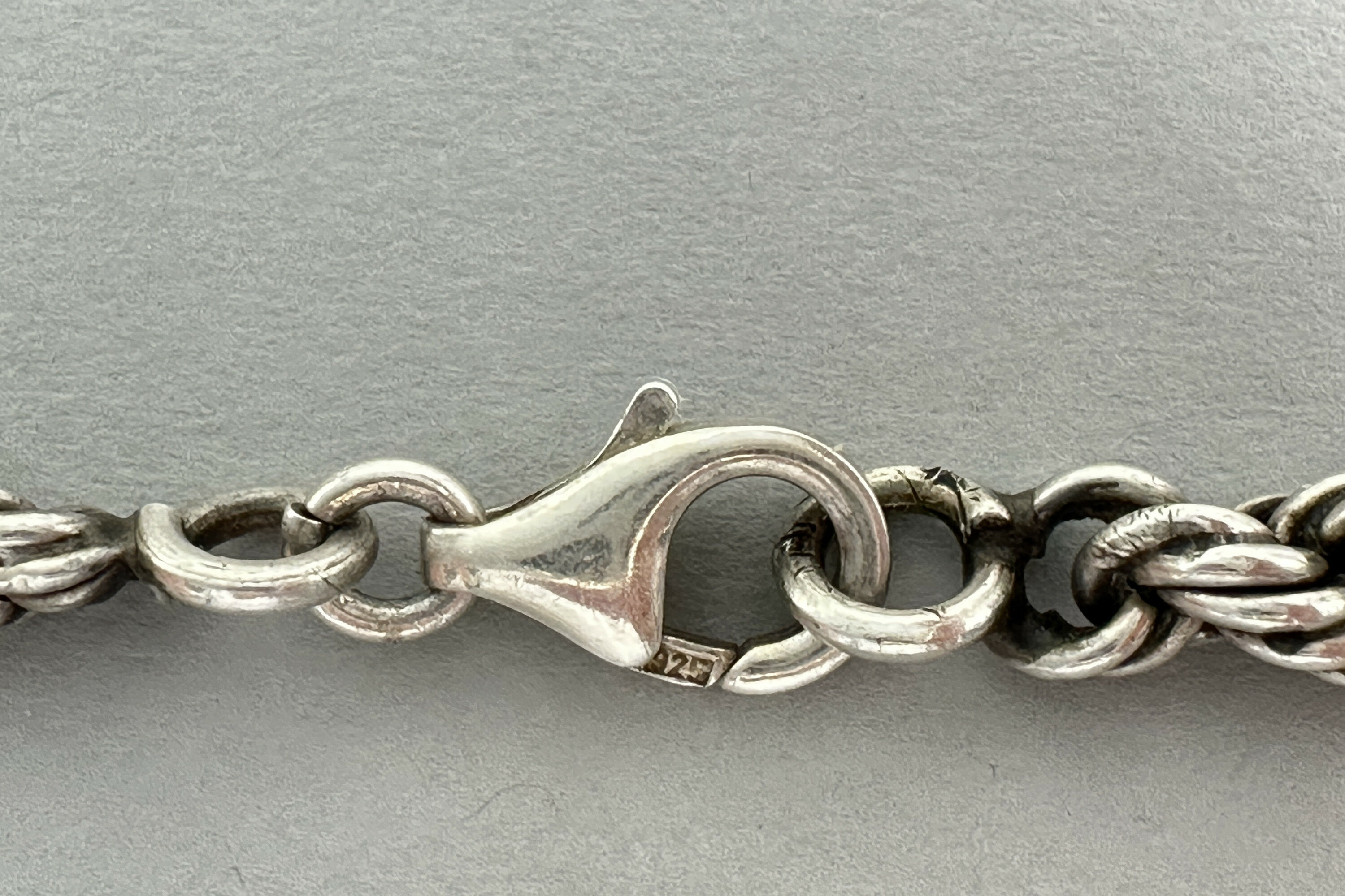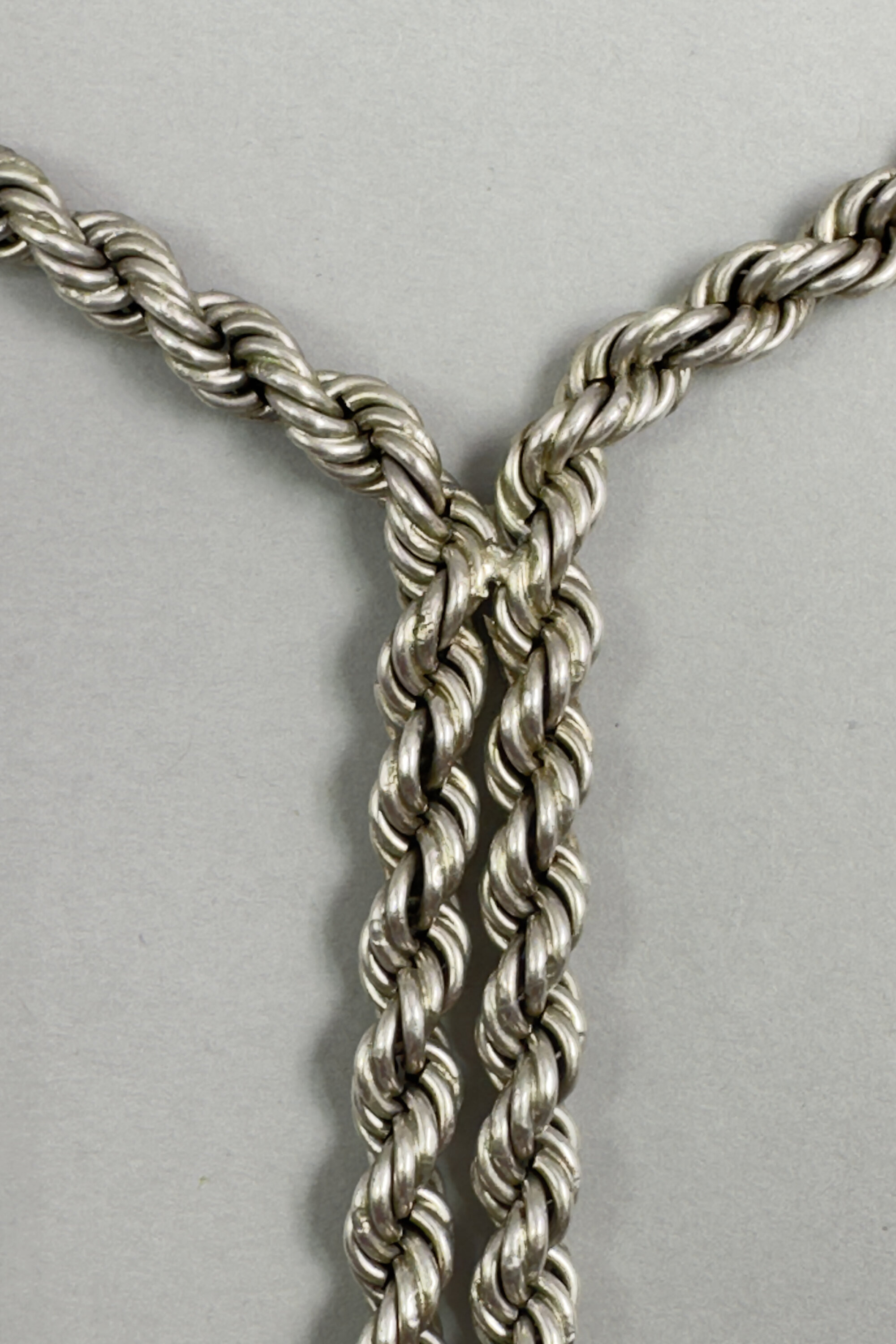This is a constructed necklace comprising a long rope chain that is joined at the front leading to two tassel like asymmetrical drops. The drops are pieces of carved apple jade. These appear to be natural in colour although they have not been tested so might possibly be treated in some way, as many jade pieces are. The chain and the jades have been combined and so they date differently. Both, though, appear to be relatively modern, probably late 20th century. The chain clasp is marked '925'Size: | Necklace down to the join is 48 cm, the drops measure 15 cm and 12 cm, the jade carvings are 2.5 cm x 1.47 cm |