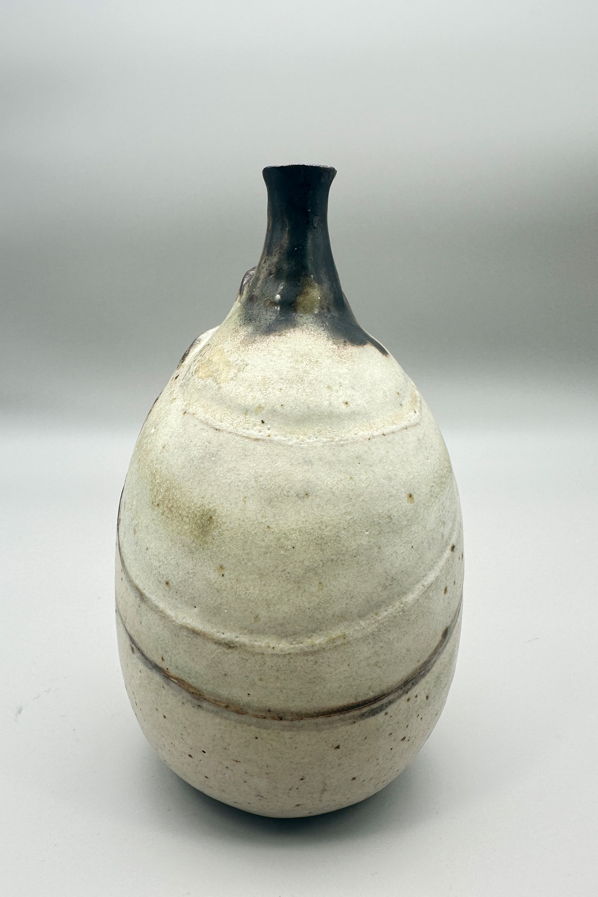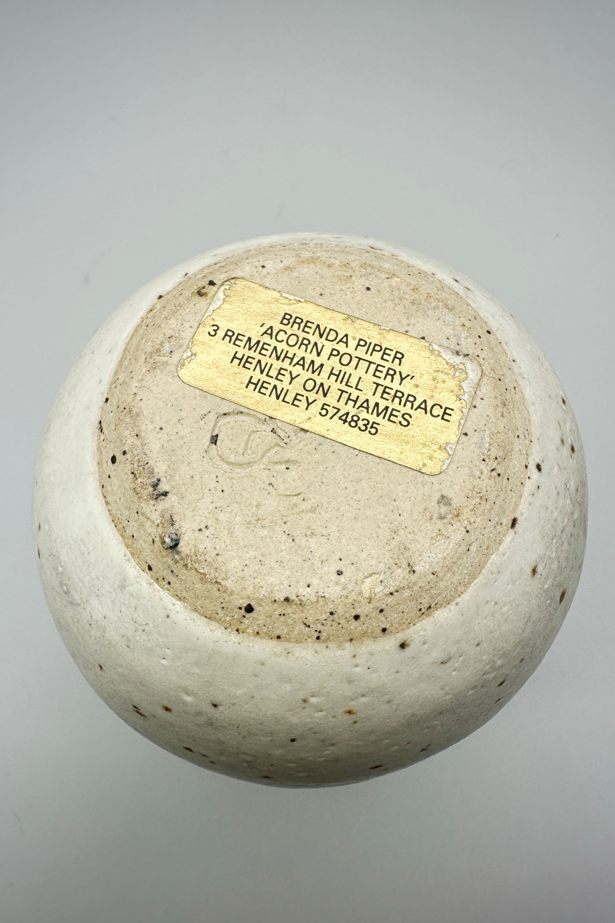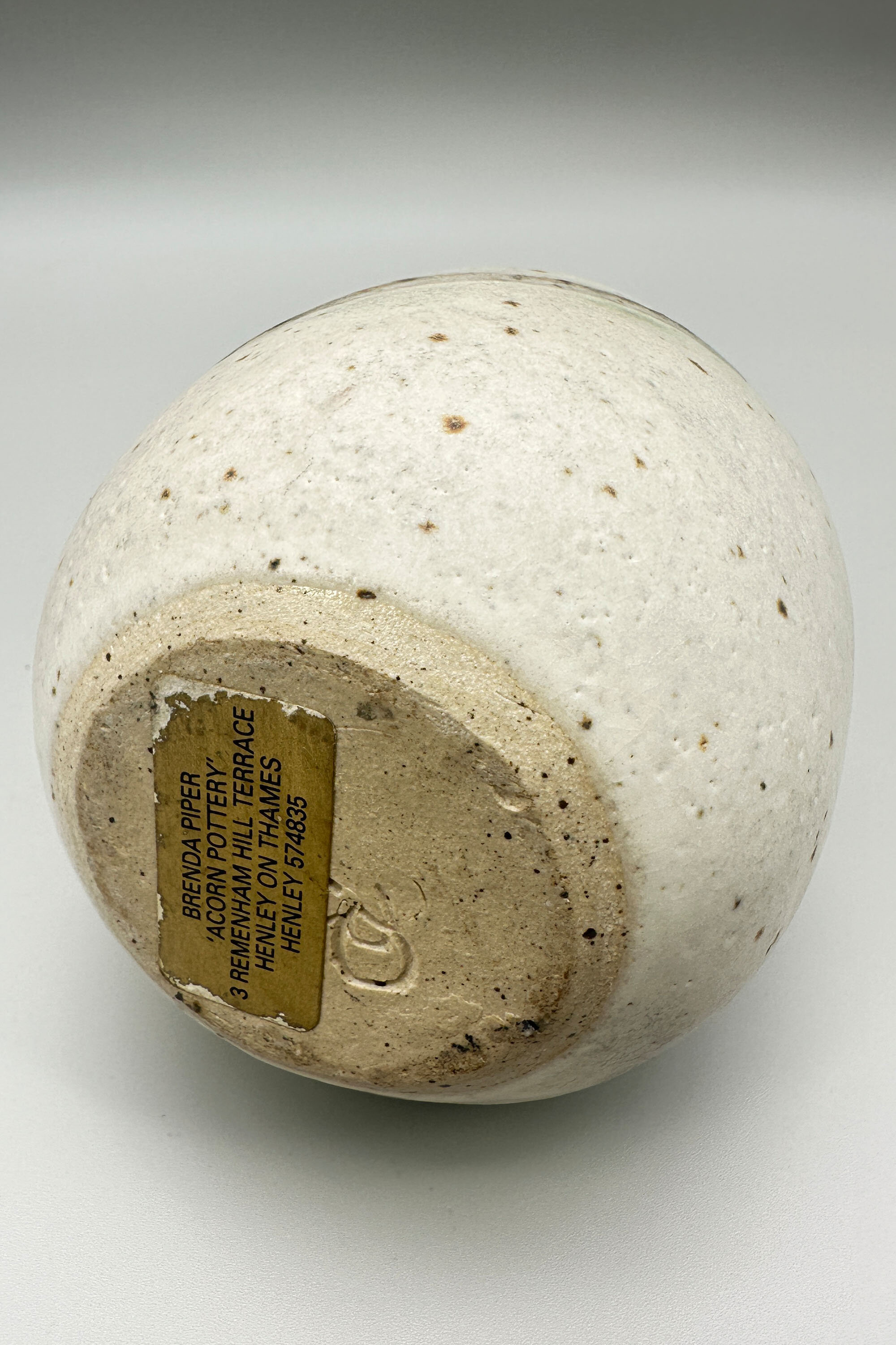 A stoneware vase of ovoid form with a short slender concave neck, the cream mottled glazed body with three looping raised bands in brown and the neck also glazed in brown, the flat base unglazed with an impressed mark ‘BP’ partially obscured by a gilt label for ‘Brenda Piper’, ‘Acorn Pottery’. There is an entry for Brenda Piper in ‘British Studio Potters’ Marks’ by Eric Yates-Owen and Robert Fournier (2nd edition 2005 p401) but little is known about her. She worked at her Henley studio from 1987-1990 and the form of her signature mark changed after 1990 giving a very secure dating here. Other pieces by her display a variety of semi abstract organic forms which is consistent with the design of this vase although its exact significance remains rather unclear.| Size: | Ht 16.5cm, Width (max) 9.5cm, Base 6cm |
