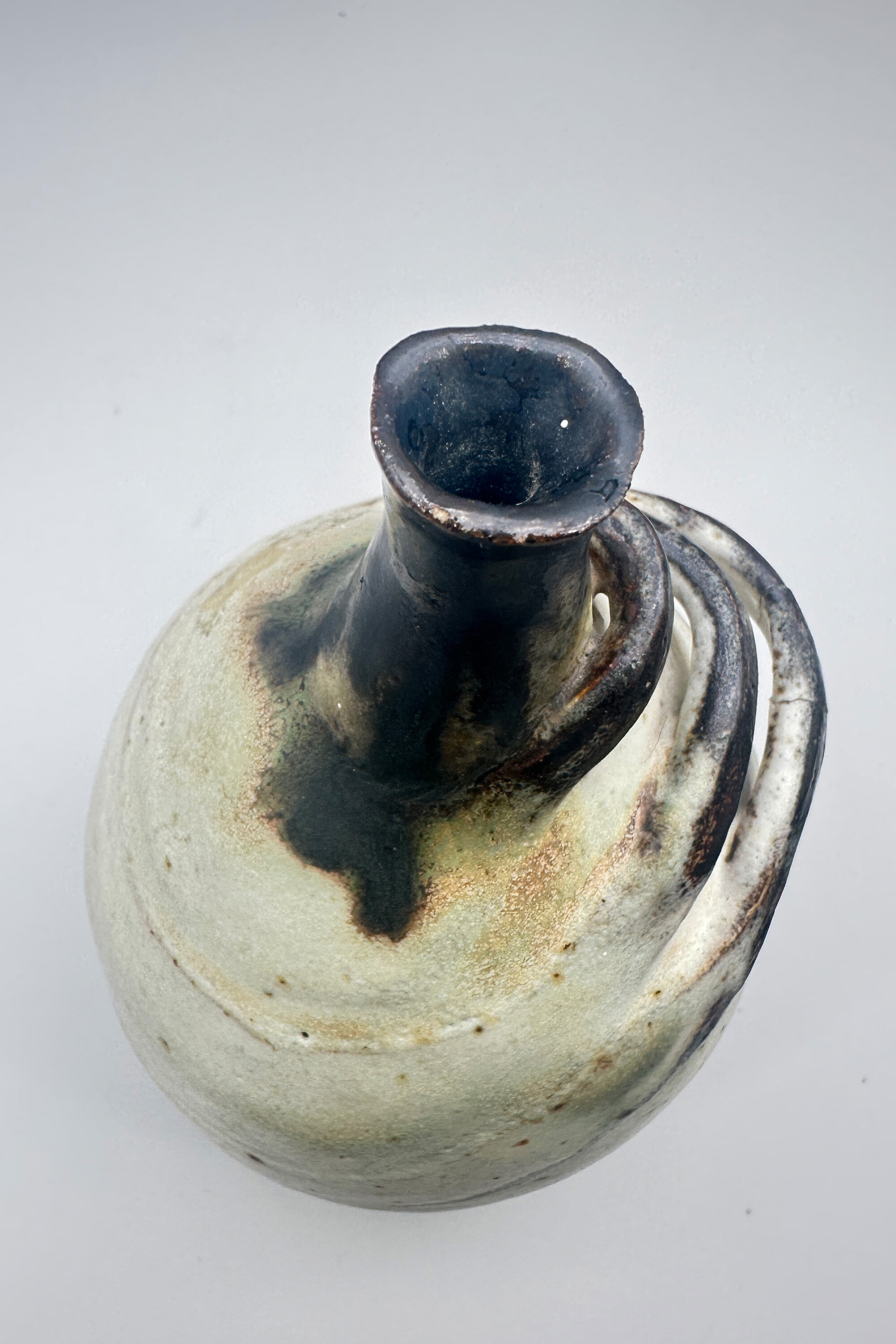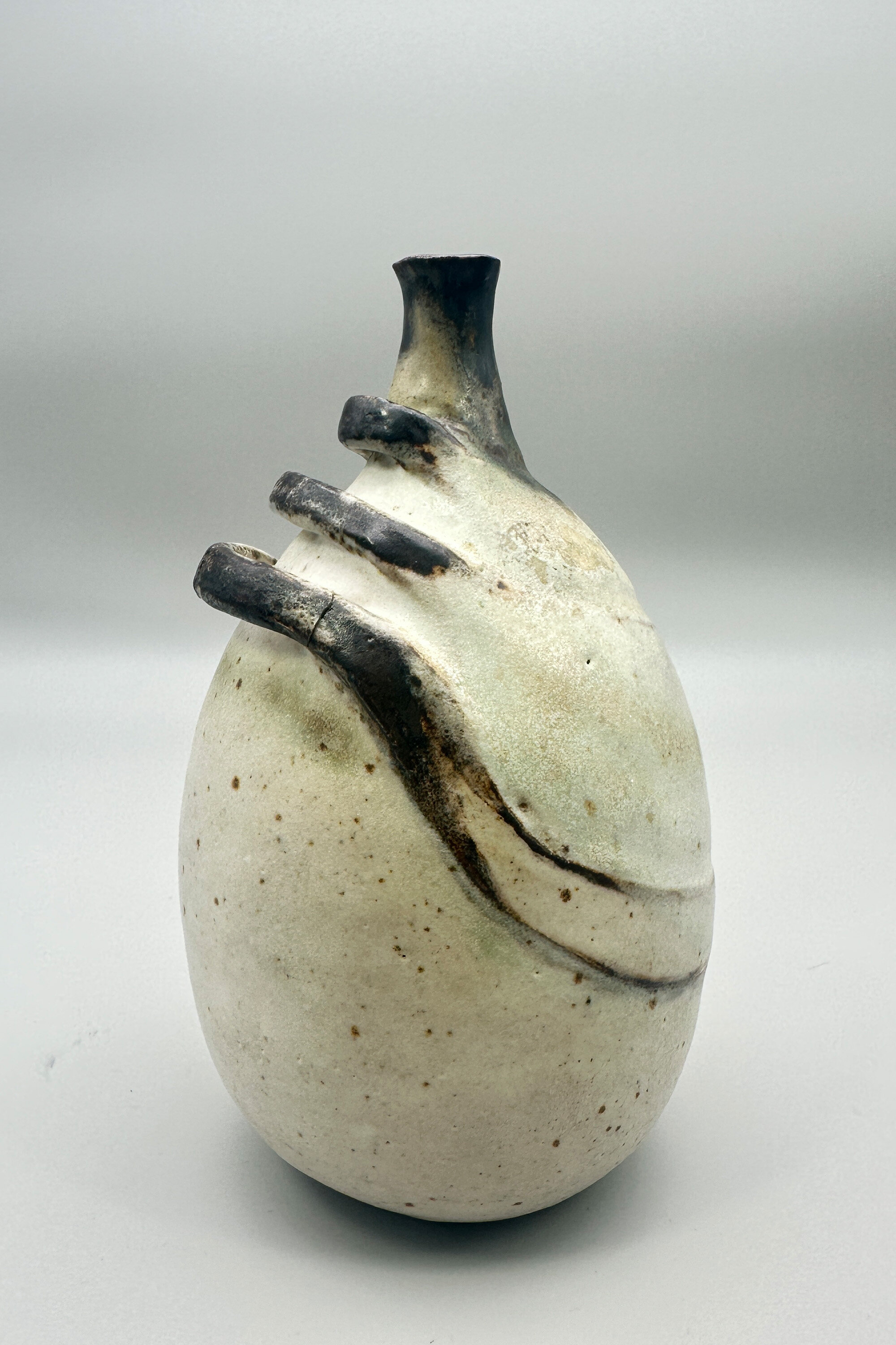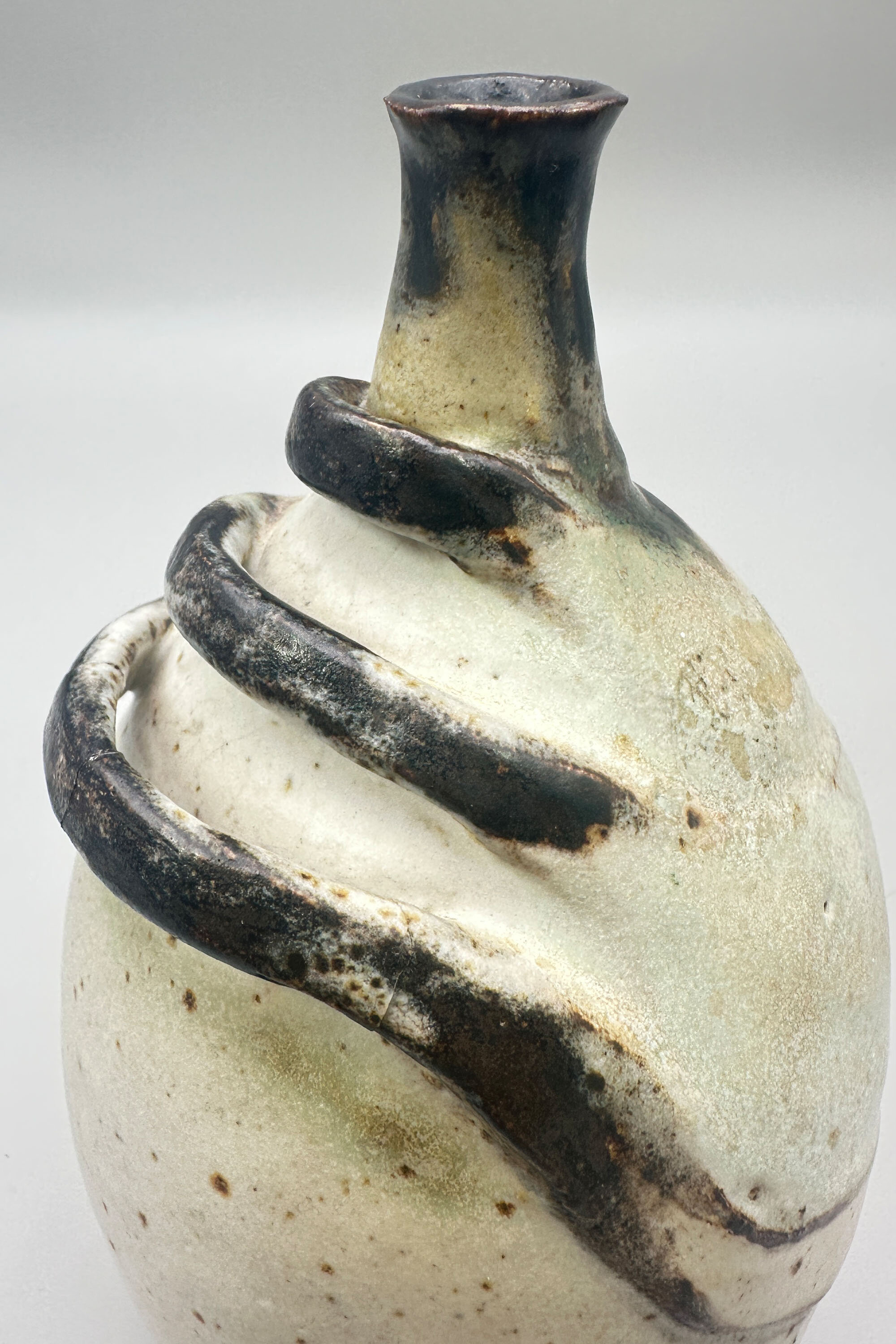 A stoneware vase of ovoid form with a short slender concave neck, the cream mottled glazed body with three looping raised bands in brown and the neck also glazed in brown, the flat base unglazed with an impressed mark ‘BP’ partially obscured by a gilt label for ‘Brenda Piper’, ‘Acorn Pottery’. There is an entry for Brenda Piper in ‘British Studio Potters’ Marks’ by Eric Yates-Owen and Robert Fournier (2nd edition 2005 p401) but little is known about her. She worked at her Henley studio from 1987-1990 and the form of her signature mark changed after 1990 giving a very secure dating here. Other pieces by her display a variety of semi abstract organic forms which is consistent with the design of this vase although its exact significance remains rather unclear.| Size: | Ht 16.5cm, Width (max) 9.5cm, Base 6cm |