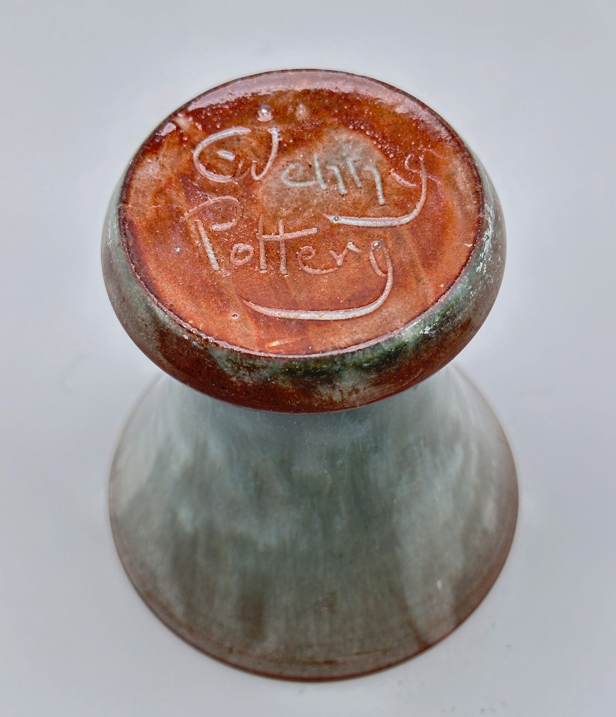 There has been a pottery at the small Welsh town of Ewenny since 1610, the area around being, at the time, a fertile source of clay. In the early 1800s Evan Jenkins married Mary, the daughter of then owner John Morgan, and this began a period of ownership by the Jenkins family which continues today, the studio and shop being run by Alun Jenkins and his daughter Caitlin, who is the eighth generation member of the business (see image XXXX). Their mark can be seen at ‘British Studio Potters’ Marks’ by Eric Yates-Owen and Robert Fournier (2nd edition 2005 p157). Production has tended to concentrate on modest utilitarian items, hand potted and finished with the distinctive glazes for which the studio is known which involve dipping the pot in one glaze adding another with the splash technique and firing the item so that the two glazes fuse. The effects seen on this beaker are typical of their work as is also the clear evidence of hand throwing. Ewenny pieces are made and sold today, but the current catalogue does not list items exactly similar to this, so a late twentieth century dating is the most likely.