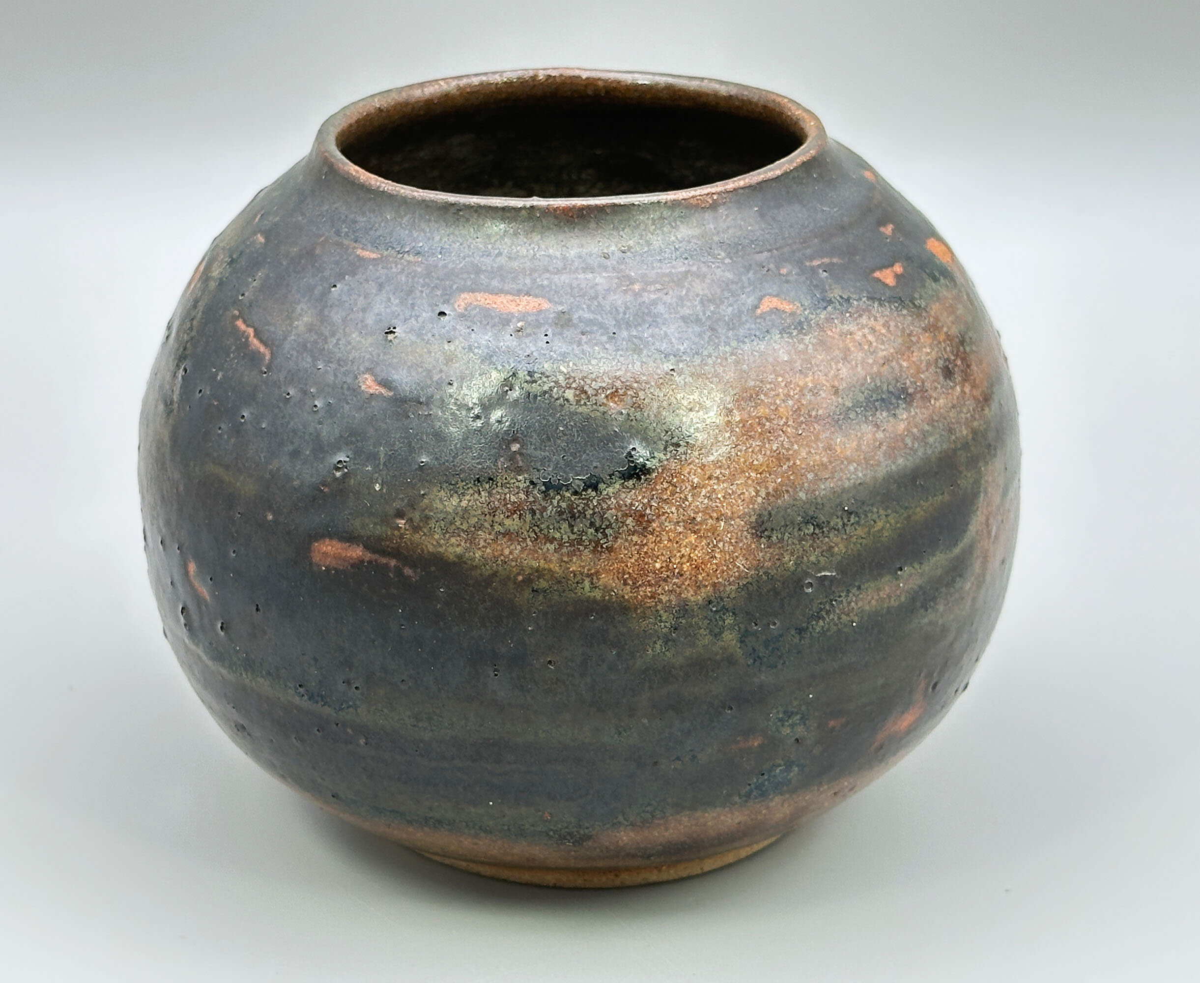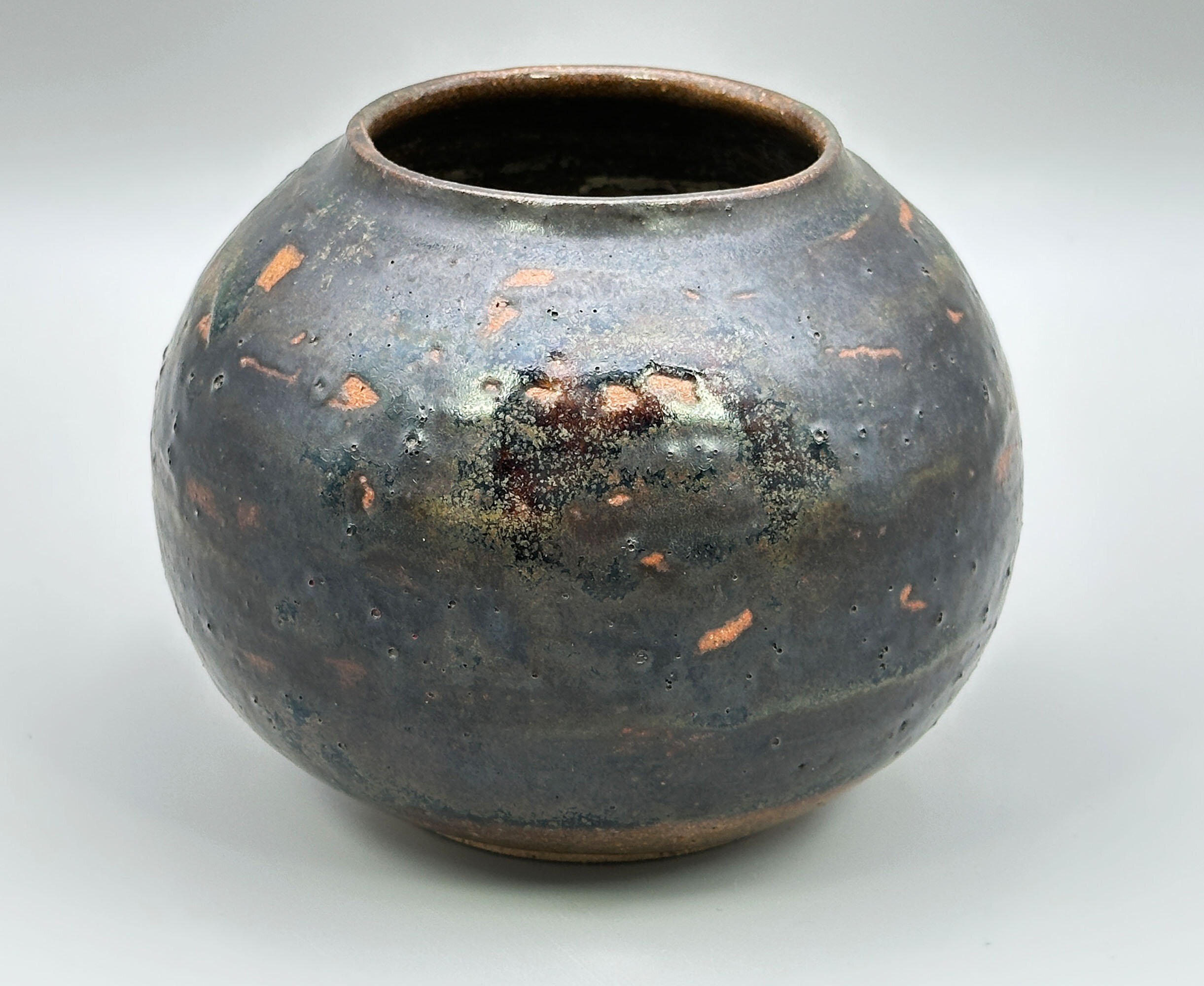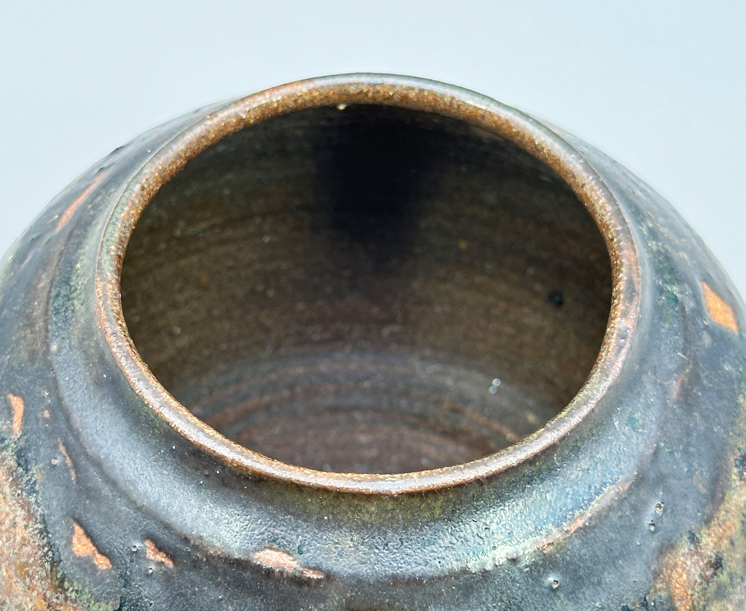 A small vase or jarlet of globular form with a short concave neck glazed in browns and greens with popped bubbles in some places and traces of the ceramic body in others where the glaze has crawled slightly, the interior with clearly visible potting rings and the base unglazed with a brown glaze circle to the centre within which are the incised initials ‘HA’ as a monogram. This piece, in common with so many of its studio pottery companions, looks clearly towards the East and reminiscences can be seen of both Chinese ‘Cizhou’ (see image 7) and Japanese ‘Bizen’ (see image 8) wares but while the identity of its maker is yet to be established the skill of the craftsmanship is evident enough.