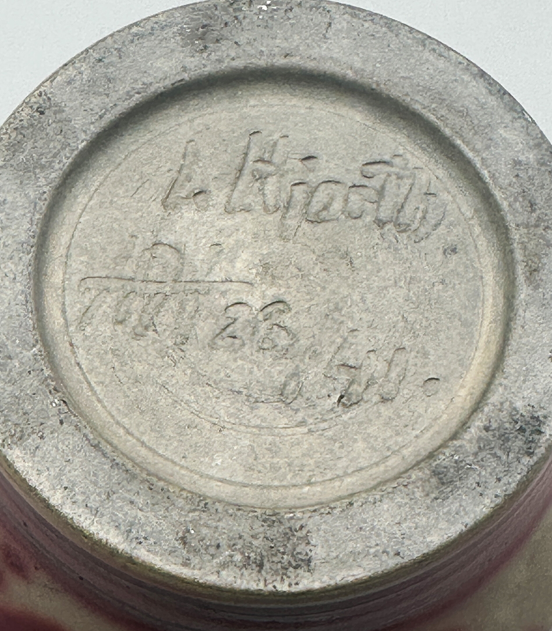 The abstract mark on the base below ‘L Hjorth’ can be read as ‘HA’ and is found on other pieces, usually accompanied by a model number as here (‘23/41’). It stands for Hans Adolf Hjorth (1878-1966), one of Lauritz Hjorth’s sons, who is known to have fired his first stoneware in 1902. His pieces were sold in his Father’s shop and were very popular, meriting a gold medal at the World Exhibition in Brussels in 1910. A stoneware series in greyish brown was produced from 1913 onwards and this is most likely what we have here (source : Danish House Trading). Certainly, the absence of a reindeer mark, later commonly to be found on L.Hjorth pieces, indicates a dating before 1927 when it was first introduced. Marked pieces in this glaze and colourings are not so often found and especially not in this larger size making this beaker vase a highly desirable collector’s item.