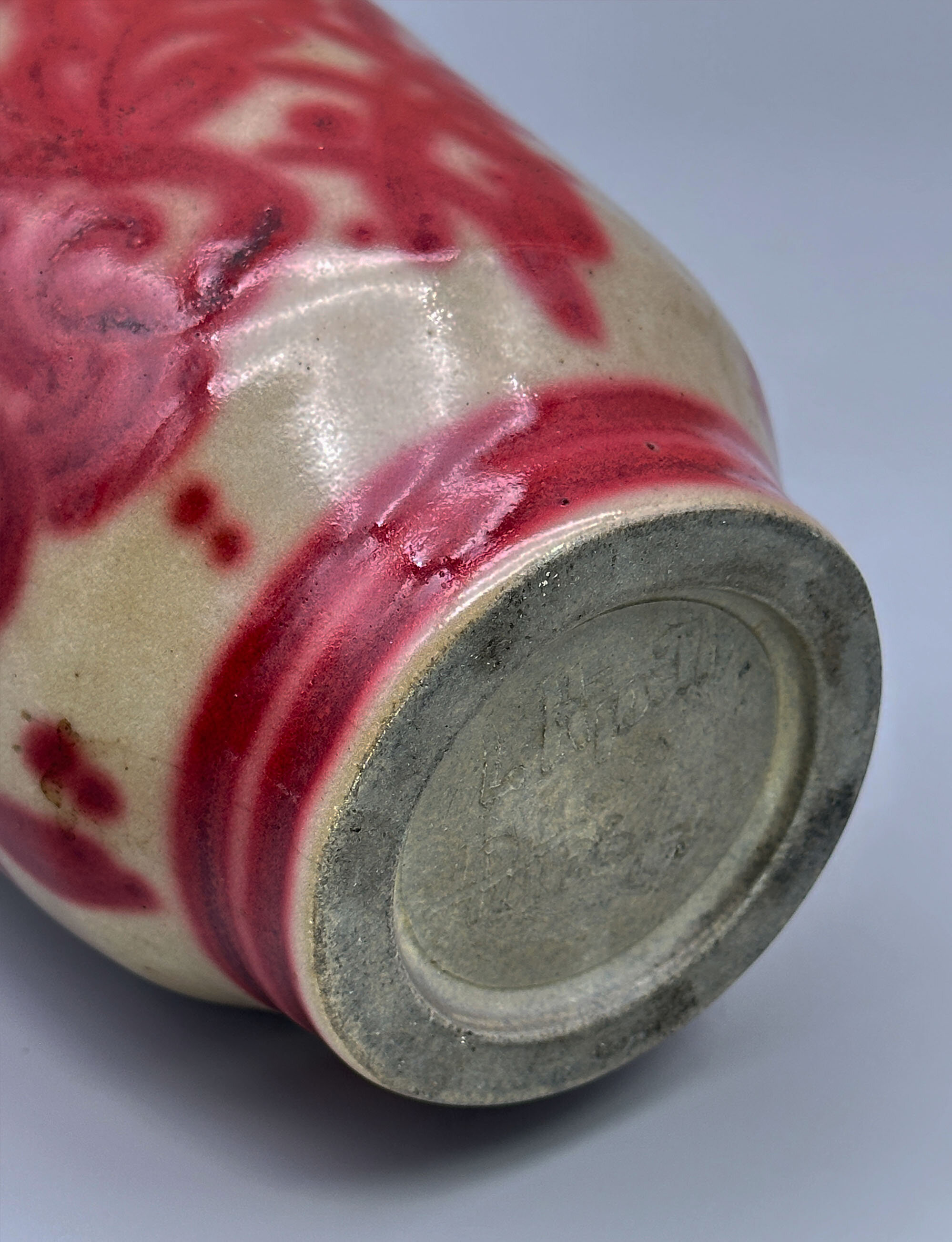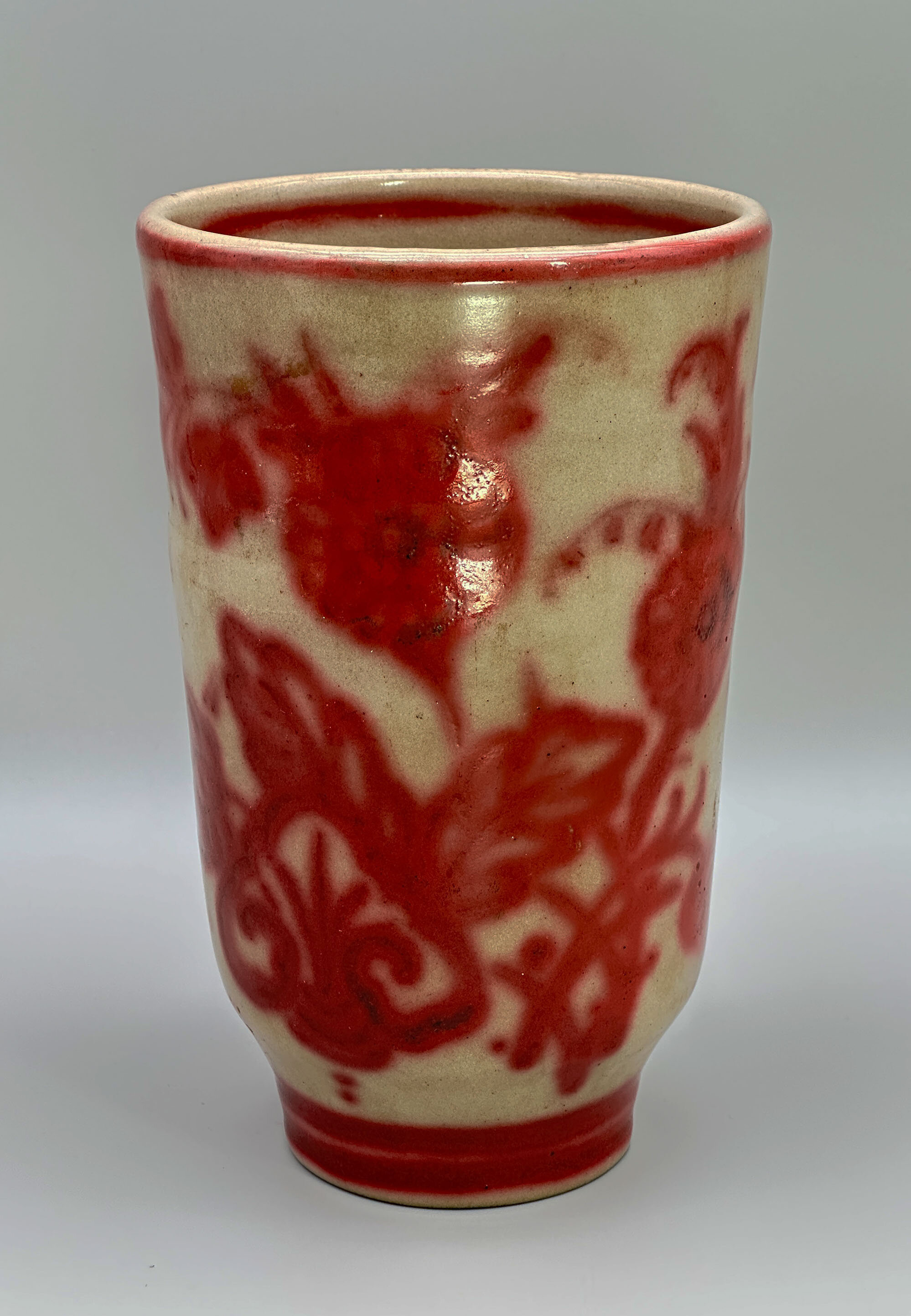A stoneware vase of tapering beaker form, incurving towards the foot, the interior with pronounced potting rings and the base countersunk and unglazed with an incised script signature ‘L.Hjorth’ above an abstract mark with the numbers '23/41' alongside, glazed overall in a translucent sandy beige with underglaze decoration in copper red of scrolling flowers.The firm L.Hjorth is a long established Danish ceramics manufacturer with a history extending back to the mid nineteenth century when the potter Lauritz Hjorth, after serving an apprenticeship at the the Faience factory of Edvard Chr. Sonne and travels abroad, founded a business in his own name in 1859 at Ronne on Bornholm, a Danish island in the Baltic Sea. Success was almost immediate and the firm moved to larger premises three years later concentrating their production on decorative items which by the 1880s were being sold in the big department stores of Paris, London and Berlin, as well as in New York and Australia. Lauritz Hjorth was joined by his children who took over the factory following his death in 1912. The business was to continue for another two generations and two great granddaughters still run today a working museum devoted to the firm’s products.