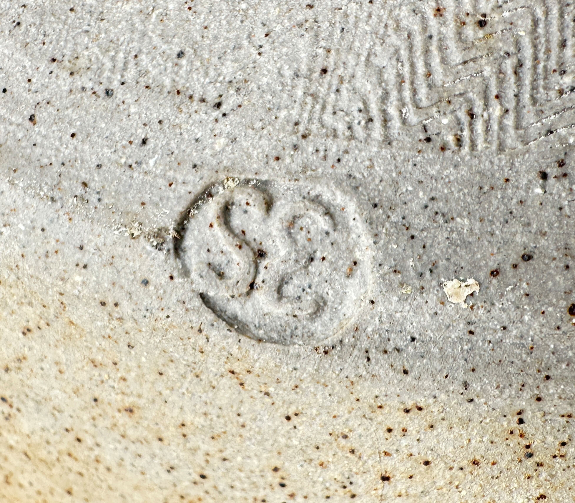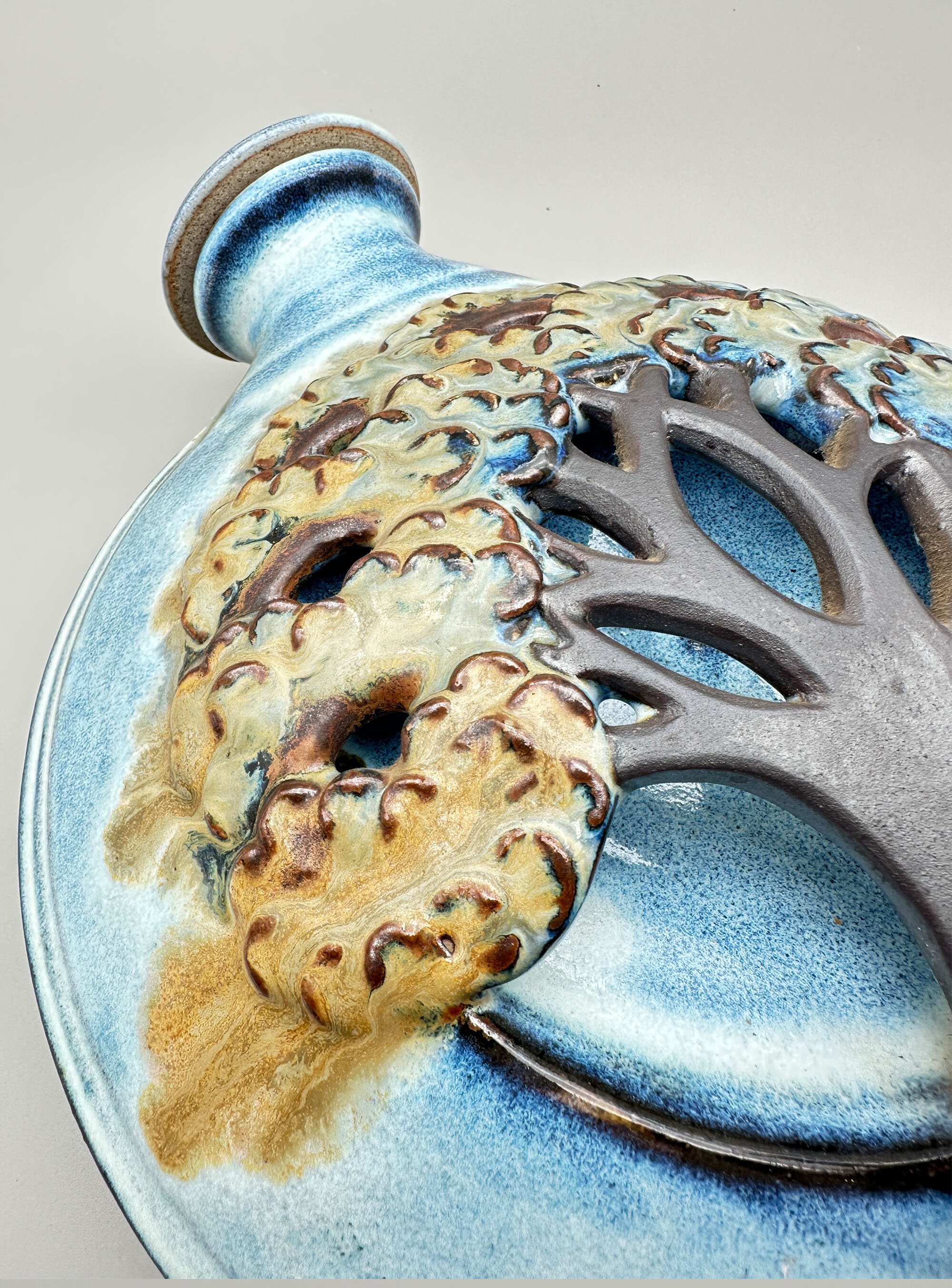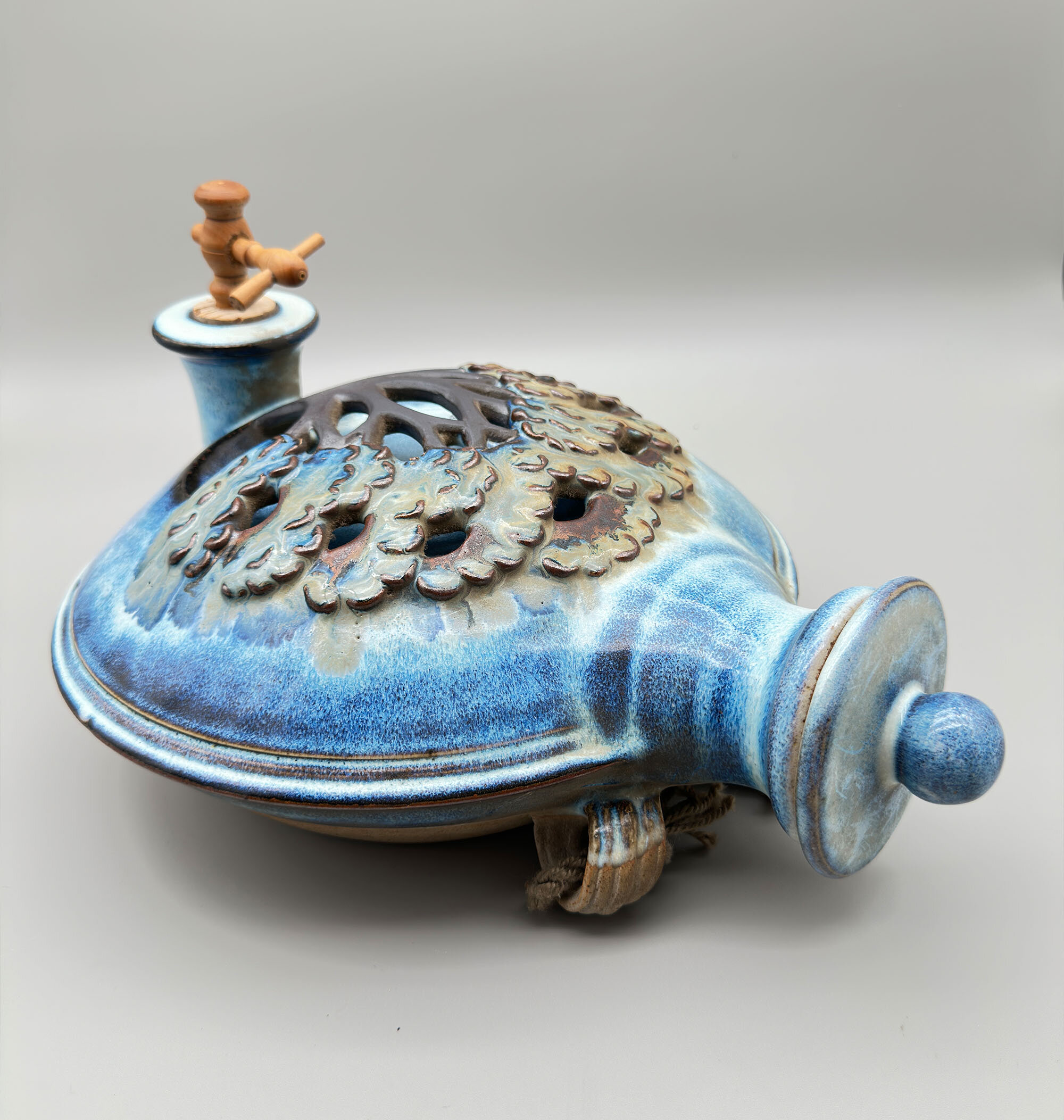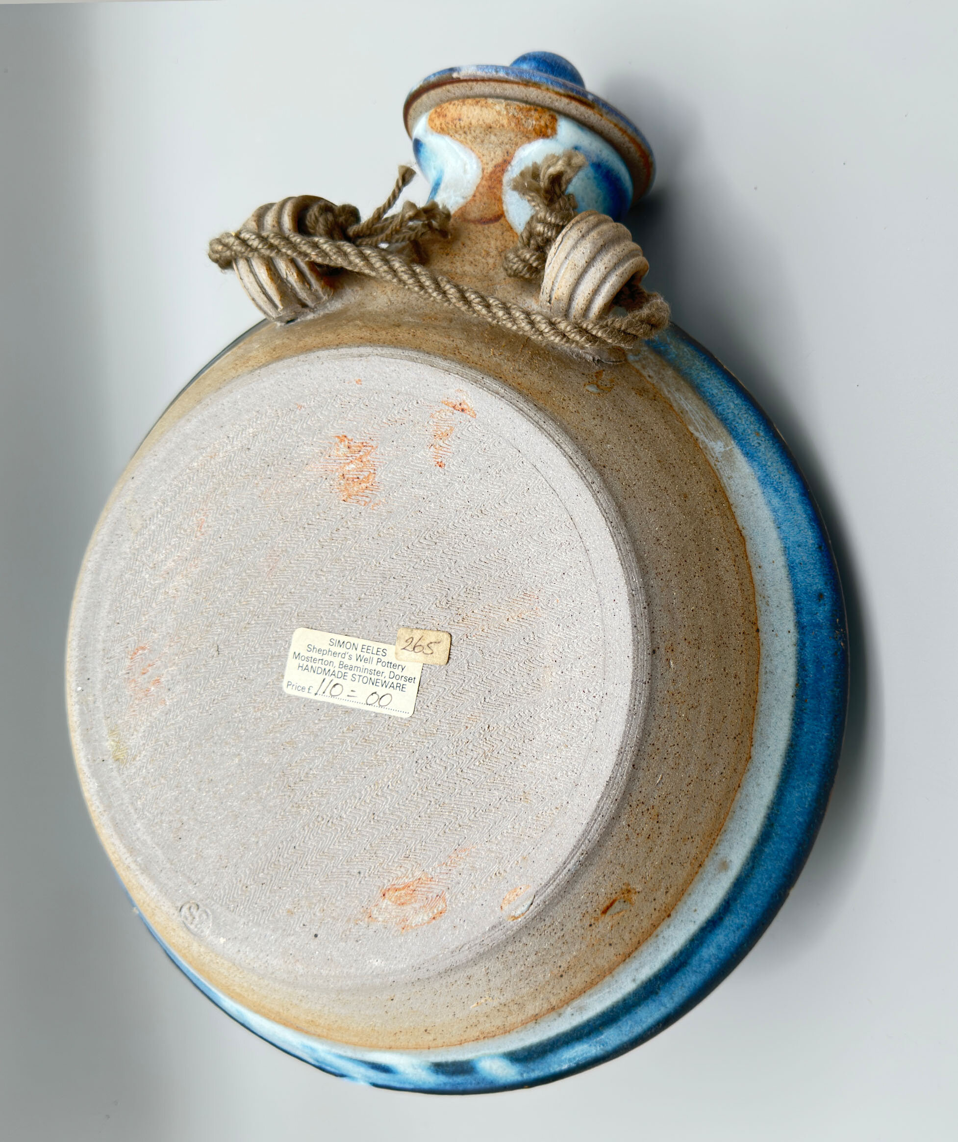 A stoneware ceramic wall flagon or vase, the body circular and glazed to the front and the top of the back in a mottled blue, the centre with a polychrome raised and modelled design of a tree, the base with a circular tap and cork spigot, the top with a circular screw thread cover and knob finial, the back unglazed with a textured effect, with two ridged loop handles for hanging (fitted with the original cord) and an impressed circular mark ‘SE’ along with the price tag (£110.00) and the address of the Shepherd’s Well Pottery.Simon Eeles was one of the two sons of David and Patricia Eeles who started the studio Shepherd’s Well Pottery in Hampstead, London in 1955, moving to Mosterton, Beaminster, Dorset in 1962, see ‘British Studio Potters’ Marks’ by Eric Yates-Owen and Robert Fournier (2nd edition 2005 p152). Simon began working with his parents in 1979 and was to soon specialise in stoneware although in later years he took an interest in the Japanese ‘raku’ type glazes for which he gives demonstration classes today. His earlier stoneware pieces seem to have focused on decorative utility items and do not appear to be commonly available now. Priced in the 1980s/1990s at £110 this wall flagon was clearly something of a demonstration piece at the time and remains so today.