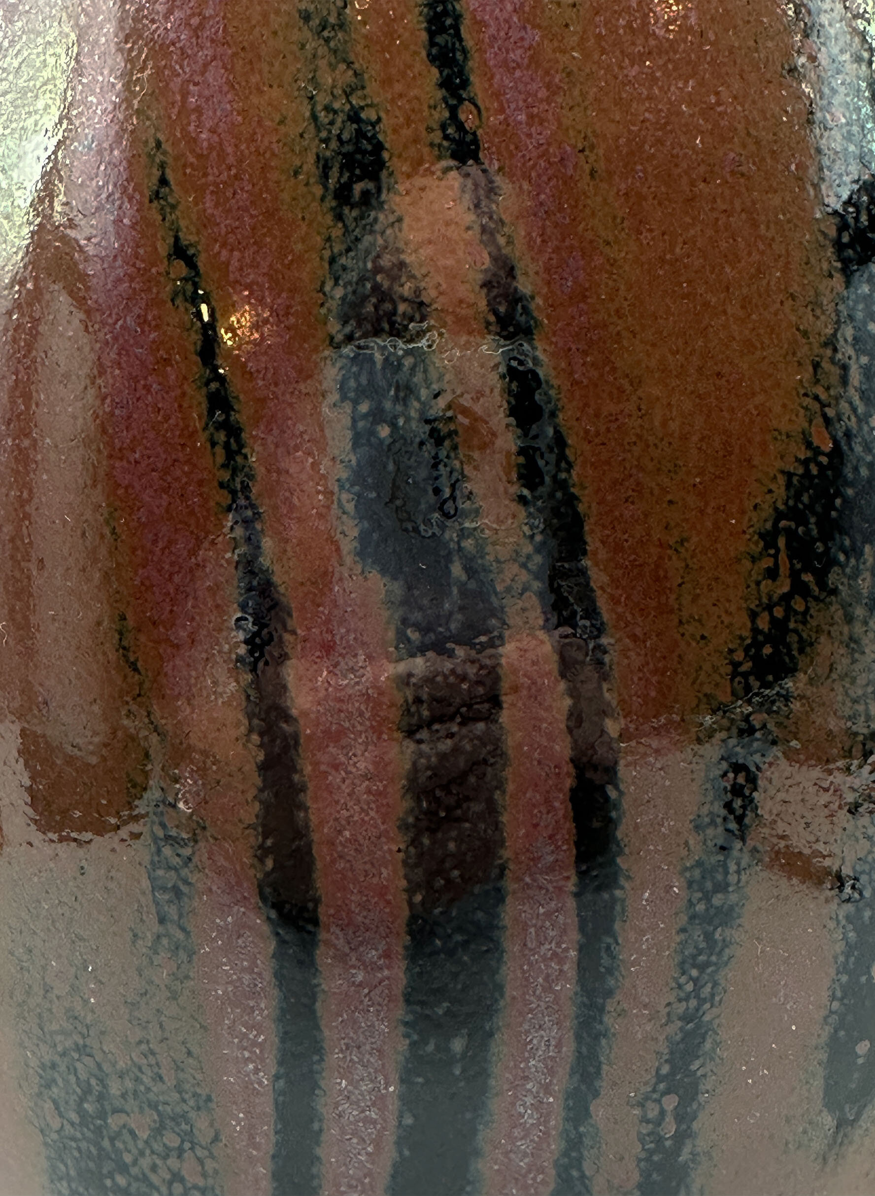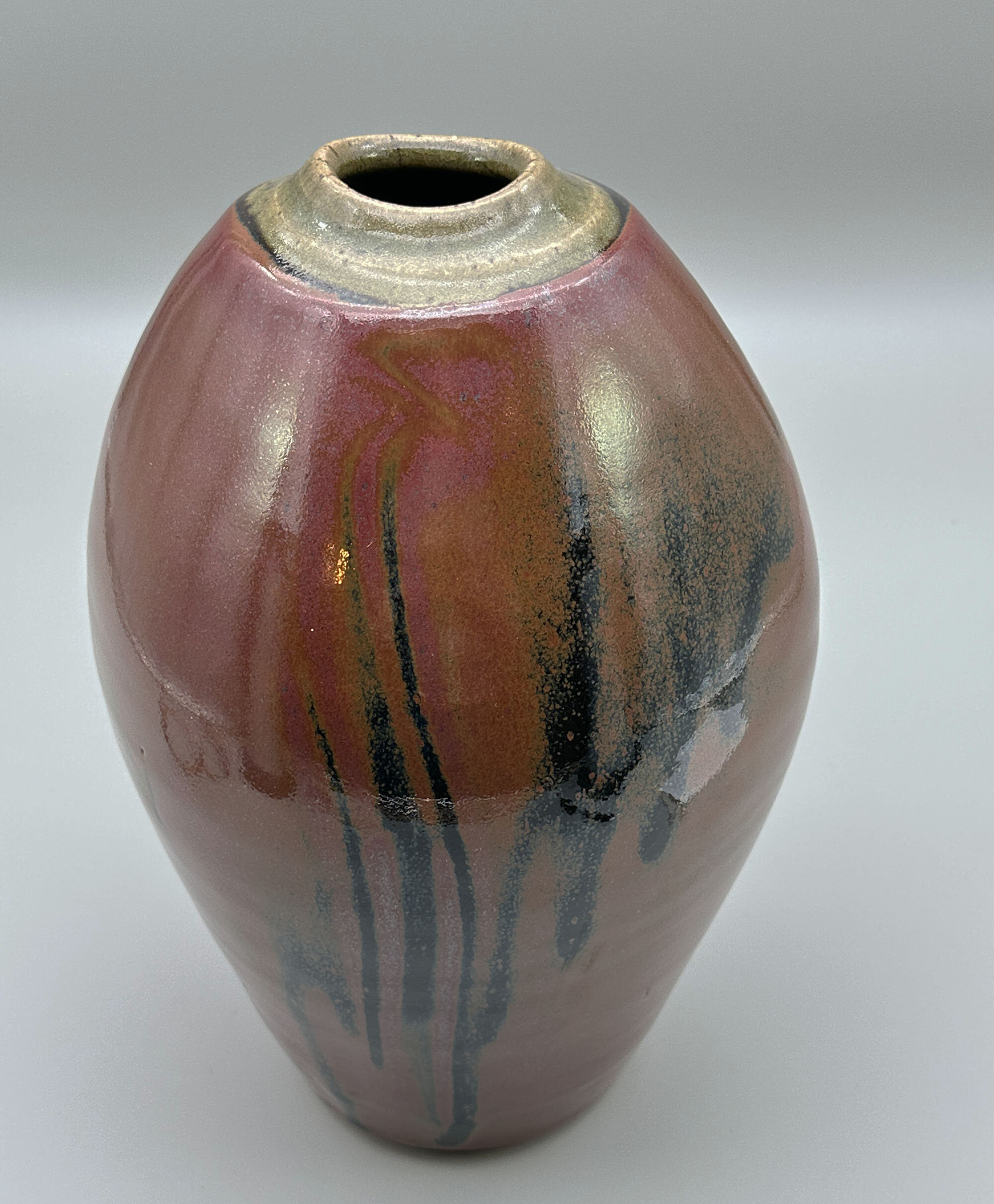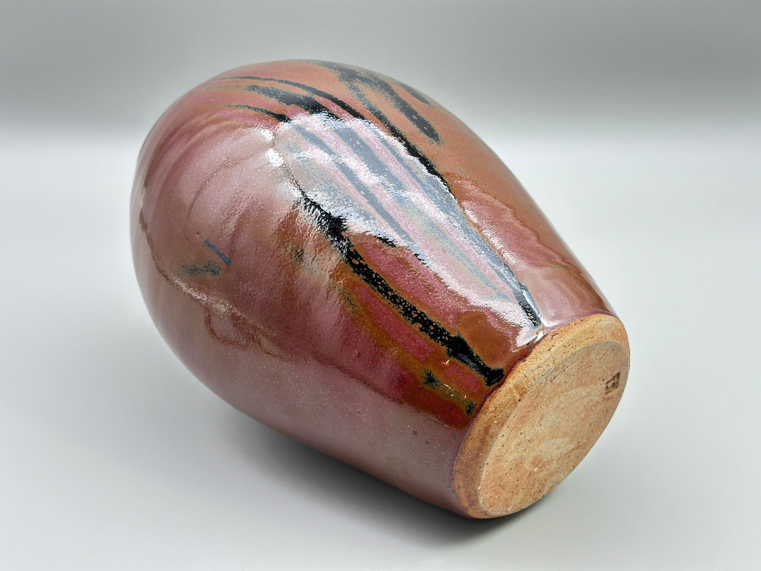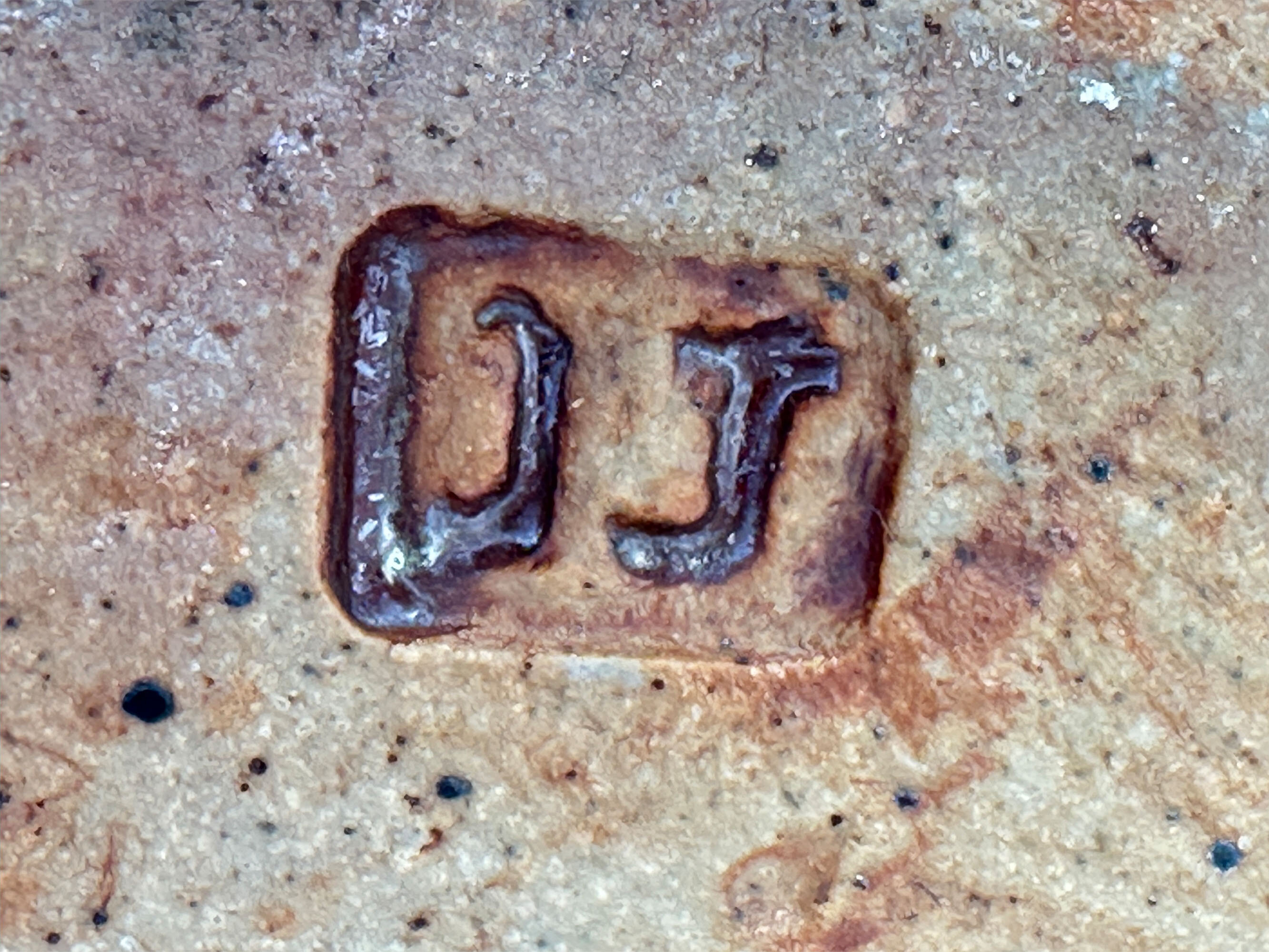 A stoneware vase of flattened ovoid form with a ‘dished’ rim, the speckled brown glaze with zig zag and splash glaze highlights, the base unglazed and with an impressed mark ‘JJ’. The mark is for the well known pottery artist John Jelfs who was born in 1946 and has a studio, Cotswold Pottery, at Clapton Row, Bourton-on-the-Water, Gloucestershire, see ‘British Studio Potters’ Marks’ by Eric Yates-Owen and Robert Fournier (2nd edition 2005 p267). A more detailed account of his work can be seen elsewhere (Antique & Decorative Ceramics Lot Number 118) but this vase is another example of his work, albeit with rather different decoration, which combines hand potted, elegant form with inventive glazes, sourced from locally produced materials.| Size: | Ht 267cm, Width (max) 17cm, depth (max) 15cm, Base 19cm |