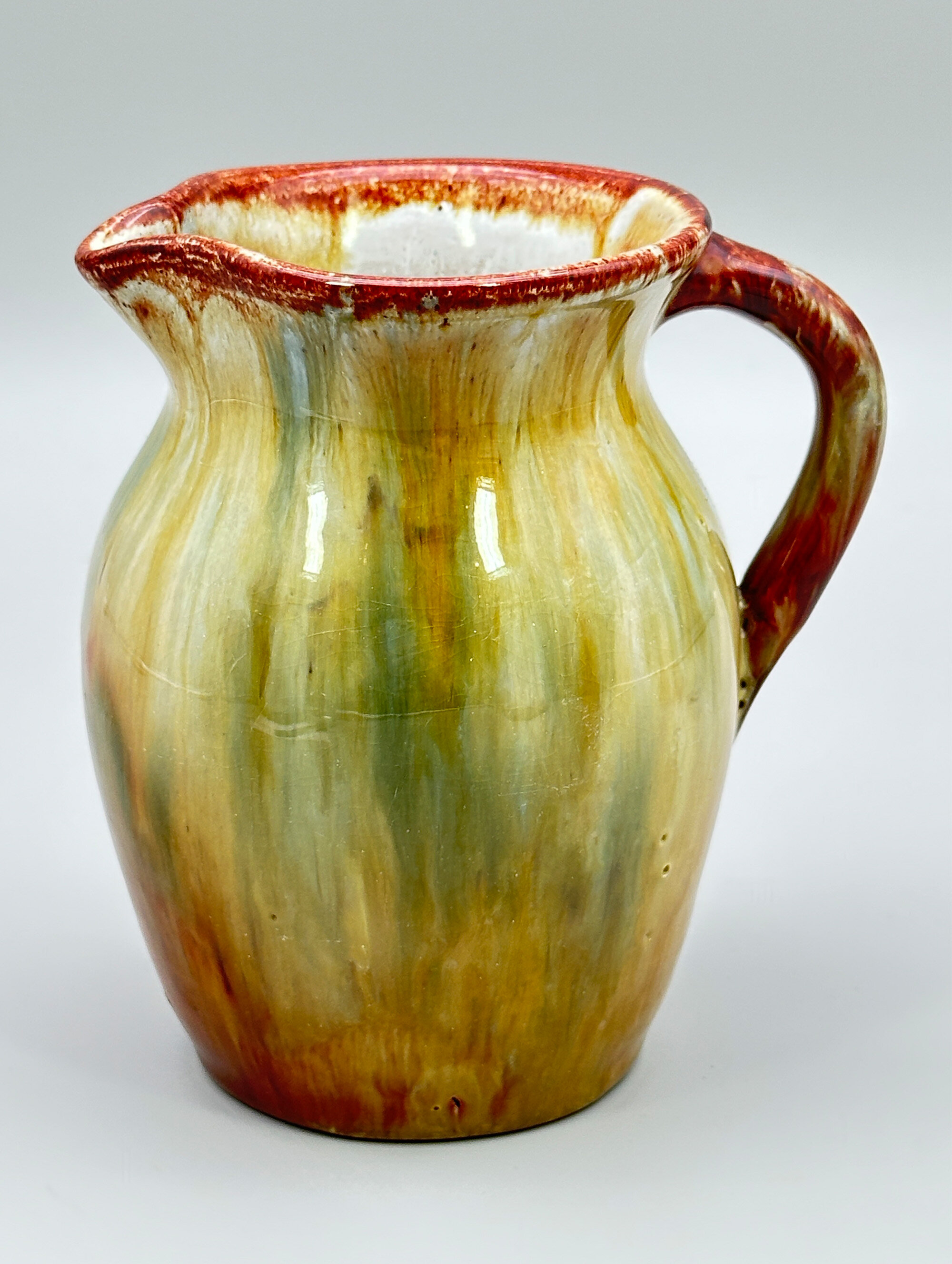 Price: £25There has been a pottery at the small Welsh town of Ewenny since 1610, the area around being, at the time, a fertile source of clay. In the early 1800s Evan Jenkins married Mary, the daughter of then owner John Morgan, and this began a period of ownership by the Jenkins family which continues today, the studio and shop being run by Alun Jenkins and his daughter Caitlin, who is the eighth generation member of the business (see image XXXX). Their mark can be seen at ‘British Studio Potters’ Marks’ by Eric Yates-Owen and Robert Fournier (2nd edition 2005 p157). Production has tended to concentrate on modest utilitarian items, hand potted and finished with the distinctive glazes for which the studio is known which involve dipping the pot in one glaze adding another with the splash technique and firing the item so that the two glazes fuse. The effects seen on this jug are typical of their work as is also the clear evidence of hand throwing. Ewenny pieces are made and sold today, but the current catalogue does not list items exactly similar to this, so a late twentieth century dating is the most likely.